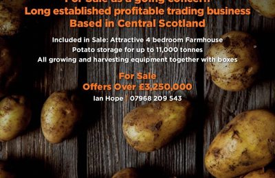 Central Scotland seed potato business with attractive 4 bedroom farmhouse, potato storage for up to 11,000 tonnes, all growing and harvesting equipment together with boxes. For Sale as a going concern.