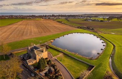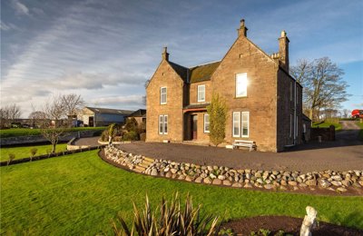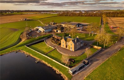 Carlogie Farmhouse in a beautiful setting overlooking a former fishing pond. Around 2.35 acres & a range of modern & traditional outbuildings with stables & outdoor arena. Includes No.1 Carlogie Cottage.