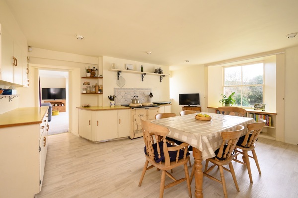 There are three reception rooms with individual wood burning stoves, plus a library which could be used as a home office, and a spacious and light-filled kitchen with oil-fired AGA and Belfast sink. The sunroom, overlooking the garden, is the perfect spot to sit and relax in the evening, with French doors leading to the garden patio area.