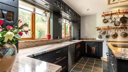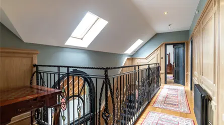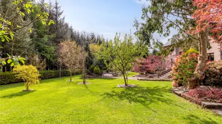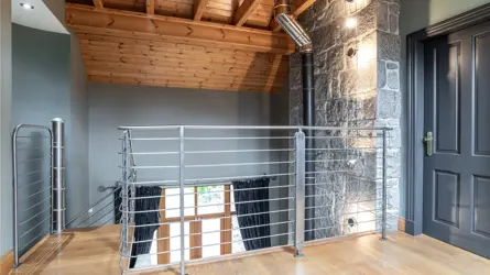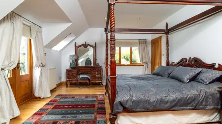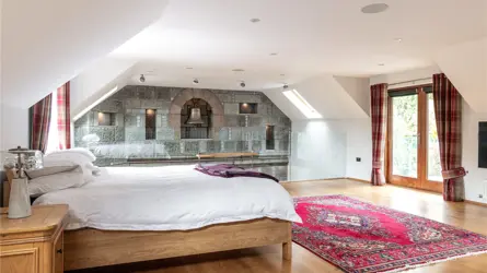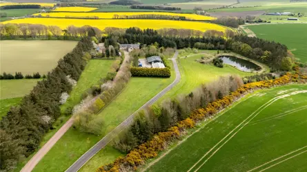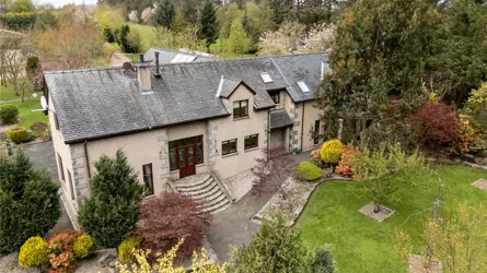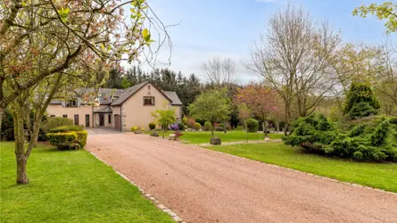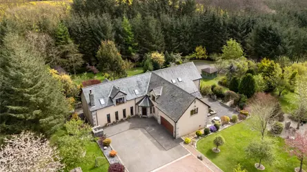 Understood to have been built in 2000, this bespoke home is a truly original property, designed and crafted by the current owner, with a wealth of superb features including, underfloor heating at ground level to the extension, Sonos music system to the living room, bedroom and bathroom. Remote controlled velux windows and blinds and a Lutron lighting system. The accommodation has a versatility second to none. The paddocks, landscaped garden grounds, outbuildings and equestrian facilities offer a wonderful outdoor lifestyle all within an extremely private setting. Located to the South of Mintlaw, ample amenities are available in proximity as are many commuting routes, with Aberdeen Airport just half an hours drive away. The mature landscaped gardens and pond offer an oasis of comfort with relaxation and entertainment uppermost.Detached and spanning over two floors, the property has been extended in 2010 and offers versatile yet luxurious accommodation at every turn. The exterior of the property is a timber pitch roof with slated roof and the build is solid concrete block with pointed granite quoins. Windows and doors are fitted with double glazed units and the facias and soffits are also timber. A blend of build materials has been used in the interior of Beechfield House including glass, metal and timber which contrast throughout many of the rooms, creating attractive decorative features.The hand crafted front exterior door sets the tone for this one-of-a-kind property and the expansive home offers multiple spaces for a large family or for those who enjoy entertaining. The vestibule opens onto a spacious hallway where a WC and study are located. A stylish Oak panel and ornate metal balustrade staircase leads to the upper level. An open doorway from the vestibule guides you to a warm and inviting sitting room where the ceiling transcends the upper floor creating a wonderful lofty ambience. The feature wall of hand-crafted wooden shelving and stonework is really special and the authentic church bell inset adds to unique essence of the home. A set of French doors leads to a stone patio. The real heart of the home is the kitchen dining room with snug set on semi open plan. A comprehensive range of contemporary wall and base mounted units host integrated appliances, offering a striking and most unique finish. A marble topped peninsular unit is the ideal social cooking and entertaining hub including inset drinks fridge and induction hob. Stepping away from the kitchen diner, the snug is a peaceful room with a set of French doors allowing access to outside and a high ingress of natural light to flood in. The sleek metal and oak spiral staircase leads to the upper level. A few steps down and the dining room is equally an attractive and most useful room. versatile in location withing the interior, this room could have a variety of uses as desired and features a working fireplace with timber surround. The elongated windows and set of French doors frame the landscaped gardens beautifully. Completing the ground floor is the large sunroom which is warm and inviting space to relax and enjoy the views to the garden grounds. Two sets of French doors allow access out on the surrounding patio area.Ascending to the upper level the hallway gives access to most of the bedroom accommodation. The exquisite master bedroom is located above the sitting room on the ground floor and features a glass balcony and view to below. A staircase connects the two rooms, and the master bedroom also benefits from access to a large balcony terrace from where the wonderful gardens can be fully enjoyed. The master bedroom also has a sleek and contemporary jack and jill en-suite bathroom. Bedrooms three, four and five are well appointed double rooms with views to the gardens and fitted wardrobe space. Bedroom two is an exceptionally large room with walk in wardrobe space as well as an ensuite shower room and access to a second balcony. With an excellent balance of practical living, contemporary design and flexible living/ entertaining spaces both inside and out along with the three significant metal clad agricultural buildings and the timber clad studio and equestrian facilities this home offers the full package.Beechfield House stands in approximately 14 acres of garden grounds and and the electric gated entrance has an intercom system. The private driveway sweeps through the grounds flanked by trees. The pond area has been allowed to remain wild and natural enticing an array of natural wildlife and birds and access roads have been carefully created to meander through the grounds leading to various peaceful areas where the tranquillity can be fully enjoyed. There is plenty of parking to the front of the house and there is a second parking area also. The expansive and extremely well stocked gardens surround the house are a true testament to the homeowner as the site was originally a bare, every hedge, shrub and tree has been planted over the last 25 years and has grown the established gardens there is today. There is a well stocked orchard with apples, pears and plums and the pond is stocked with Orfe. There is a fleet of Husquarna lawnmowers installed throughout the grounds. Fenced grazing paddocks are ideal for equestrian enthusiasts and there are timber stables and a former menage area. A timber clad studio will remain as well as a large polytunnel. Set away from the house, a large work yard includes three substantial modern metal clad agricultural buildings which offer a wealth of business opportunities, it is worthy of note that the main driveway splits to allow access to these buildings away from the main house. There is also 13.4 KW Solar Panels with Tesla battery storage. Underfloor heating to the newest building and a hardwired security and alarm system for the property and outbuildings.ACCOMMODATIONGround floor - Entrance vestibule, hall, living room, sitting room,family room, dining kitchen, sun lounge, bedroom/study an