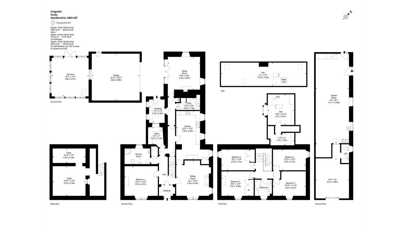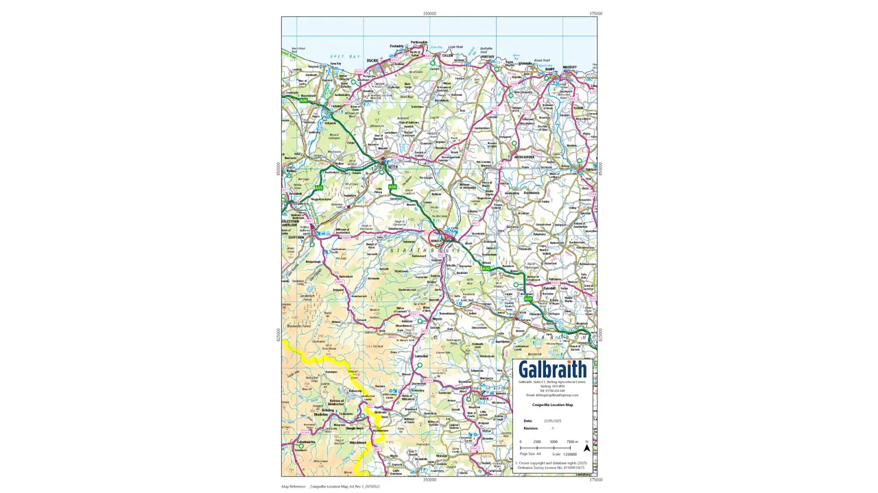 Craigwillie Farm is located in Aberdeenshire, an area renowned for its productive and fertile land. The holding extends to approximately 89.65 hectares (221.52 acres), excluding roads, yards, and buildings, and benefits from excellent access via the public road network. An internal farm track system provides convenient access to all fields.The land is predominately classified as Grade 3(2) with some grade 3(1) according to the Hutton Institute. The land is currently all in grass but is well-suited to a range of agricultural uses, including livestock production, rotational grazing, and arable cropping.The land is registered with SGRPID for IACS purposes and is situated between 120 and 315 metres above sea level and is generally of a North westerly aspect.LOT 1: CRAIGWILLIE FARMHOUSEThe farmhouse is a detached dwelling with accommodation spanning two levels, a large basement, and a loft with space in two areas.In immaculate condition both internally and externally, the farmhouse offers versatile family accommodation, with bedrooms on both the upper and ground floors. It features generous public rooms and a contemporary, newly fitted dining kitchen. In addition, there are several practical rooms, including a study/office, utility room, storage areas, and basement/attic spaces.Externally, there is ample parking surrounding the property, along with a large driveway and a garage that includes a self-contained sunroom to the rear. Opposite the house, the bothy offers potential for alternative accommodation. The house sits within a landscaped garden, which includes an orchard and mature planting.This property is ideal for a family residence, a holiday home, a bed and breakfast, or a home business.Basement - Cellar 4.83m x 4.39mGround Floor - Kitchen 7.09 m x 3.48m, Sitting Room 5.59m x 4.83m, Bedroom 4.85m x 4.37m, Office 2.51m x 2.13m, Vestibule 3.40m x 2.29m, Sitting Room 4.78m x 4.65m, Utility 3.48m x 1.73 m, WCFirst Floor - Bedroom 4.90m x 3.15m, Bedroom 4.83m x 3.12m, Bedroom 4.83m x 3.61m, Bedroom 4.67m x 3.58m, WCAttic - 12.50m x 3.45mOUTBUILDINGSIncluded in the sale of Lot 1 is a charming stone-built bothy (13.11m x 4.9m) with a corrugated roof, a large open fireplace, and toilet facilities. The bothy offers excellent potential as a workshop, entertaining space, or additional storage. The adjoining agricultural buildings are being sold under Lot 2.Also forming part of Lot 1 is access to the property’s electric door double garage (6.98m x 6.88m), located to the rear of the property, along with a bright, south-west-facing sunroom (5.66m x 5.41m), providing a versatile and appealing extension to the space.LOT 2 : LAND & FARM BUILDINGSCraigwillie Farm is well equipped with an extensive range of buildings providing excellent versatility for various uses.1. Workshop (30m x 15m) – Steel portal frame construction, concrete walls, profile cladding, fibre cement roof and concrete floor. The roof and cladding are insulated. Adjacent is a secondary workshop (12m x 18m) of similar construction.2.Dutch Barn (30m x 15m) – Steel portal frame construction, profile cladding, fibre cement roof and aggregate floor.3.Cattle Court (42m x 24m) – Steel portal frame construction, concrete walls, profile cladding, fibre cement roof, concrete floor with internal feed passes.4.Long Byre (42m x 6m) – Traditional stone wall construction, corrugated roof and a concrete floor.5.Silage pit (18m x 24m) – Steel portal frame construction, concrete panel walls, profile cladding, fibre cement roof and concrete floor.6.General Store (18m x 6m) – Steel rafter construction, stone walls, profile roof and concrete floor with vehicle inspection pit.7.Garage and party barn – Stone wall construction, profile roof and concrete floor.8.Grain Store (30m x 15m) – Steel portal frame construction, concrete panel walls, profile cladding, fibre cement roof and concrete floor.9.Small Bothy (8m x 6m) – Traditional stone wall construction, slated roof, and a concrete floor.LANDThe land extends to 89.65 hectares (221.52 acres), comprising 18 land parcels. All the fields are currently in grass being used for the grazing of livestock.ACCESSThe farm can be accessed directly from the public road network.SERVICESCraigwillie is served by a private water supply in addition to mains electricity. Foul water disposal from the farmhouse is via septic tank and soakaway, this being registered with SEPA. In the event that the farm is sold in lots, the seller undertakes to provide a separate supply of electricity to the farmhouse. The property benefits from a sustainable energy setup, with solar panels installed on both the silage pit roof and the General Store (measuring 18m x 6m). These panels provide power to the main farm and also allow for energy export to the National Grid. Additionally, the farm steading is equipped with 3-phase electricity, supporting a wide range of agricultural and commercial uses.SITUATIONCraigwillie Farm is located approximately 1 mile West of Huntly in the Marr Settlement of Aberdeenshire. The farmhouse enjoys a peaceful rural setting with open views across the surrounding countryside. The farm buildings include a mix of traditional and portal frame structures, offering extensive space and potential for a variety of uses. The land, classified as Grade 3(1), 3(2), 4(2) and 5(2) and is capable of producing good yields of cereals and grass, making it suitable for rotational farming and ideal for livestock rearing. To the rear of the farmhouse is a range of traditional and modern farm buildings. The area is well served by a number of agricultural machinery suppliers, merchants, livestock marts and abattoirs. Craigwillie Farm, located near the postcode AB54 4QT, sits in a scenic rural setting approximately 1 mile west of Huntly. Huntly is the nearest town, being the historic home of the Gordon Highlanders Regiment and has a Primary School (Gordon Primary) and a Secondary School (The Gordon Schools) beside Huntly Ca