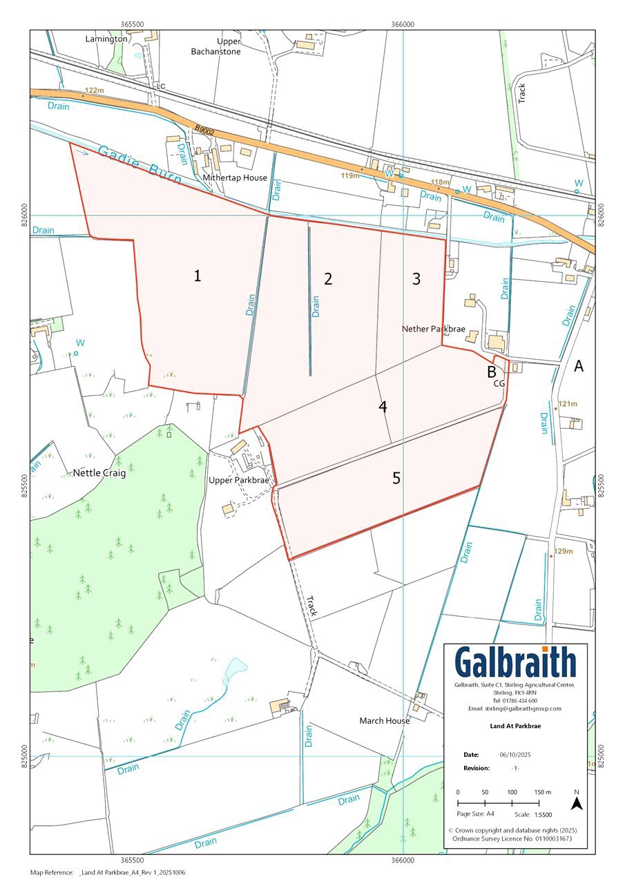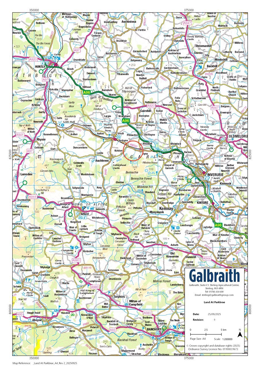 The land at Parkbrae consists of a partially fenced block of agricultural land of approximately 77.07 acres (31.19 hectares) suitable for a wide variety of agricultural uses. According to the James Hutton Institute the land is classified as grade 3(1) and 3(2) and is therefore capable of achieving high yields and growing a wide range of crops. The land is made up of five field parcels rising from approximately 120m to 150m above sea level. The land is in good heart having historically been part of a mixed farming enterprise, benefitting from regular applications of muck and the inclusion of break crops and temporary grass leys into the rotation. The land is partially fenced for the containment of sheep and cattle and benefits from a private water supply.Land at Parkbrae extends to approximately 77.07 acres (31.19 hectares) and benefits from access to the public road network via the access track shown as A/B on the sales plan. The land is conveniently situated 2 miles south east of Insch, 7 miles north west of Inverurie and 20 miles from Aberdeen. The land is encompassed by similar agricultural holdings and woodlands. The area is well resourced to service beef, sheep and arable enterprises.