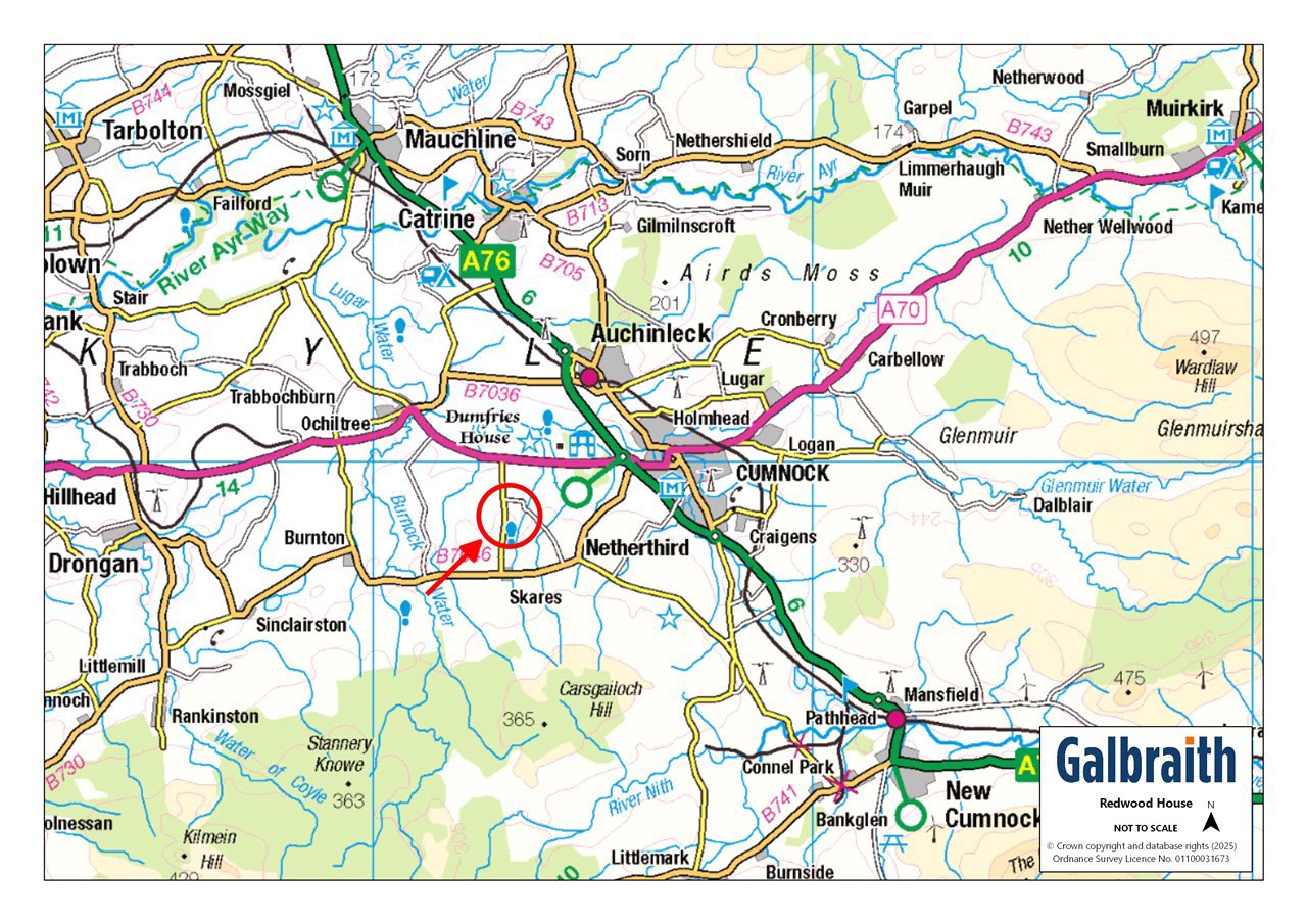 Redwood House is a superb private country property located about 2.7 miles from Ochiltree, East Ayrshire. Local services and facilities are available in both Ochiltree and Cumnock (3.5 miles). Ochiltree and Cumnock have primary schooling, local shops and other services. Secondary schooling is located in Cumnock at the Barony Campus which includes schooling and early childhood centres. The County Town of Ayr is about 13 miles distant with an excellent range of amenities and facilities including cinema, hospital, a wide range of shops and supermarkets and a well regarded private school. Kilmarnock offers a wide range of amenities including schooling, cinema, hospital and an excellent range of shops and professional services and a sports centre with gymnastics and football facilities. Redwood House is an easy drive via the A70 trunk road whilst Glasgow is about 40 miles to the north via the M77 and Edinburgh is about 66 miles. There is a railway station at Auchinleck (5 miles), with regular services to Glasgow and beyond. Glasgow Airport has regular scheduled flights and is 43 miles and Prestwick Airport is 17 miles distant.At Auchinleck Estate there are enjoyable riverside walks to Wallace’s Cave and Peden’s Cave and the River Ayr gorge walk at Mauchline is close by. Auchinleck Mansion House, was built by Lord Auchinleck, James Boswell in the late 1700s. The Scottish classic-style mansion was designed by Robert Adam, one of Scotland’s most famous architects, there is a popular coffee shop (Boswell’s Coach House) within the Estate grounds. Redwood House has views towards the stunning Dumfries House Estate (about 4 miles) and is one of Britain’s most beautiful stately homes with an outstanding collection of 18th century Chippendale furniture and Coach House cafe. The house is open for guided tours, and the 2,000-acre estate, including beautiful walled gardens, an adventure playground, walking paths, is open to the public year-round. The estate is also a focus for a range of training opportunities for young people using traditional skills and crafts.With a pitched slate roof on two storeys, Redwood House is a very impressive country residence protected by extensive garden grounds. It is approached via a shared drive with pillars leading to a large gravelled parking area for several vehicles.Ground Floor: Kitchen, Dining Area, 2 Bedrooms (one en suite), Bathroom, Living / Family Room, Utility Room, Pantry.First Floor: Galleried landing, Master Bedroom Suite with Spa bath, separate shower, dressing room. 2 Bedrooms (Jack and Jill bathroom).Redwood House was designed by the current owner and has been equipped to a high standard. The ground floor is beautifully flooded with natural light, thanks to its open-plan design and south-facing dining area that frames tranquil views across the private gardens. The kitchen offers a range of fitted storage cupboards finished in cream with fitted appliances including integrated dishwasher, a large island unit with LPG gas hob, integrated oven and fitted storage. Set just off of the kitchen, there is a convenient walk-in pantry with four freezers and further storage. It has an impressive living / family room which opens out to the rear patio with a large deck seating area. Two spacious bedrooms with attached bathrooms are located on the ground floor. The utility room has a washing machine, tumble dryer and floor to ceiling cupboards providing ample storage. The ground floor has underfloor heating with panel radiators on the first floor. Stairs lead to the galleried first-floor hallway, where a further living / study area is beautifully illuminated by natural light streaming through Velux windows, creating a bright and inviting space. There are two bedrooms sharing a Jack and Jill bathroom, which then leads to the stunning master suite, a true sanctuary offering a spacious and elegant bedroom with dual doors opening onto a covered balcony seating area. From here, the outlook stretches across the landscaped garden grounds and pond, providing the perfect vantage point to observe wildlife and enjoy the changing seasons. The suite is enhanced by a deep-set spa bath with far-reaching countryside views, alongside a separate walk-in shower, w.c., wash hand basin, and a well-appointed dressing room.Redwood House is fully double glazed with ample storage throughout. The main house has lpg gas central heating with underfloor heating on the ground floor. With substantial and flexible accommodation throughout, the property can be adjusted to suit a variety of interests.Attached to the house, is the fabulous swimming pool complex which adds a resort-like dimension to daily life. This space is heated by a separate boiler. There is a gym area, shower/dressing area and a spiral staircase leads to the master suite.Whether enjoying the warmth of underfloor heating in winter or the refreshing pool in summer, Redwood House embodies a refined yet flexible lifestyle, blending comfort, sophistication, and leisure in equal measure.Patio doors lead to a large deck area providing excellent relaxing and entertaining space with views over the expansive gardens and surrounding countryside to the north and west. The well maintained established gardens wrap around the house and are mainly laid to lawn interspersed with areas of planting with mature trees and shrubs providing a wealth of colour throughout spring and summer and a garden pond.Double Garage:Concrete floor and electric doors.ACCESSThere is a Right of Access over points AB on the plan.There is an annual wayleave payment for the electricity pole.DIRECTIONSFrom Ayr take the A70 towards Cumnock. Pass through the village of Ochiltree and continue for about 1.5 miles and turn right (signed for Skares). Proceed along this road and continue up the hill passing the fork on the left hand side, Redwood House is then on the left hand side after about 0.22 mile.POST CODEKA18 2REWHAT3WORDS//w3w.co/pepper.date.extentFIXTURES AND FITT