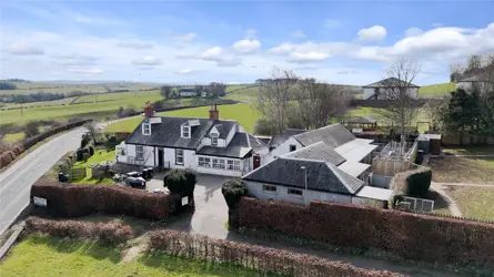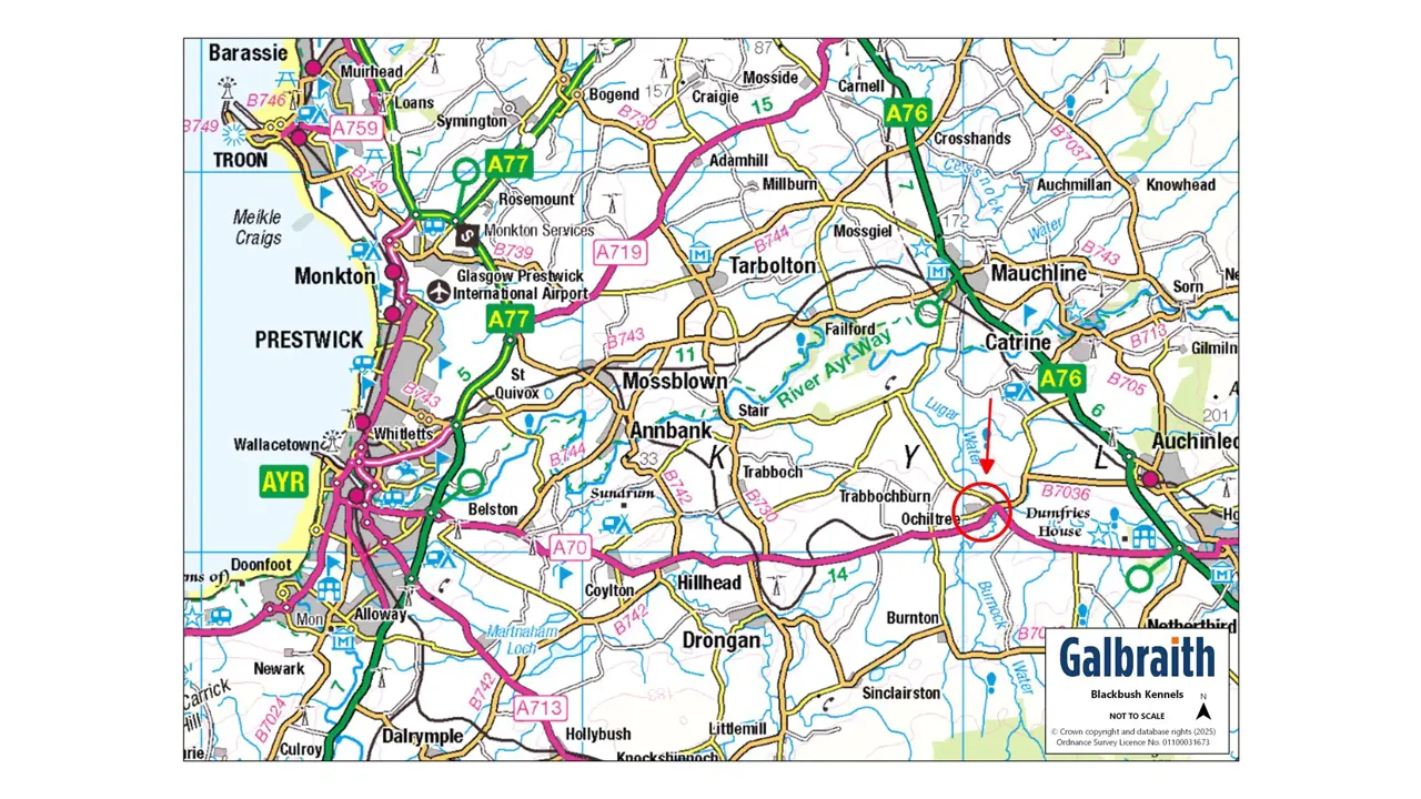 Blackbush Kennels is a Category C listed cottage nestled in a private position on the outskirts of the conservation village of Ochiltree, which has a primary school, local shop and community hub. Secondary schooling is available at Auchinleck (about 3.5 miles). The County Town of Ayr is about 11 miles distant with an excellent range of amenities and facilities including cinema, hospital, a wide range of shops and supermarkets and a well-regarded private school. Glasgow, about 39 miles to the north, is within easily commuting distance via the M77 motorway. There are railway stations at Auchinleck and Ayr with regular services to Glasgow and beyond. Glasgow Prestwick Airport is served by a good range of international flights. Ayrshire is renowned for its range of outdoor pursuits. There are a number of world-renowned golf courses including Royal Troon, Turnberry and Prestwick Golf Club. The racecourse at Ayr provides regular fixtures. Excellent yachting facilities are available at the marinas in Ardrossan, Troon, Largs and Inverkip. Ayrshire is famous as the birthplace of Robert Burns. At Auchinleck Estate there are enjoyable riverside walks to Wallace’s Cave and Peden’s Cave and the River Ayr gorge walk at Mauchline is close by. Auchinleck Mansion House, was built by Lord Auchinleck, James Boswell in the late 1700s. The Scottish classic-style mansion was designed by Robert Adam, one of Scotland’s most famous architects, there is a popular coffee shop (Boswell’s Coach House) within the Estate grounds. Dumfries House Estate (about 4 miles) is one of Britain’s most beautiful stately homes with an outstanding collection of 18th century furniture, beautiful walled gardens and coffee house. Blackbush built in the 1800’s of stone under a slate roof exudes character and period charm, with the potential for modern update to create a truly delightful home. The front door opens into a vestibule with an attractive stained-glass door into the hall. The internal layout is adaptable and offers spacious accommodation over two floors, the ground floor comprises a comfortable living room with wood burning stove set in a wooden surround, ornate cornicing, ceiling rose and laminate flooring which flows into the dining room. The sitting room has a beautiful ornate ceiling, open fire set in cast iron and wooden surround, French doors open into a study/bedroom 5. The kitchen is fitted with base and wall units, integral fridge freezer, dishwasher, electric hob and extractor fan and a lovely porcelain tiled floor. The conservatory is a wonderful space from which to enjoy the countryside views and opens into the garden. Ancillary accommodation in the form of a shower room, porch/storage area and staff w.c., puppy room, dog conservatory complete the ground floor. Stairs rise from the hall to four bedrooms, the master with fitted wardrobes and a walk-in cupboard, the bathroom is fully tiled with bath, w.c. and wash hand basin. There is a separate staircase from the kitchen to a store room.There is a double garage with roller door, power, light and water which is currently being utilised as part of the business. There is access from here to the 25 kennels. (The property has a licence for 30 kennels).The long-established and reputable boarding kennels business is available by separate negotiation with the seller. This presents a fantastic opportunity for those seeking a lifestyle change or an existing business looking to expand.GARDEN Step outside and be captivated by the breathtaking panoramic views that stretch across rolling fields and verdant landscapes from the private garden. To the rear there is a fully enclosed exercise paddock.SOLAR PANELSThere are 16 solar panels.RATEABLE VALUEThe kennels currently have a rateable value of £3,050.FLOOD RISKFlood maps of the area can be viewed at https://map.sepa.org.uk/floodmaps/FloodRisk/SearchThere is no flood risk at Blackbush Kennels.HISTORIC ENVIRONMENT SCOTLAND Blackbush is designated as a Category C Listed Building.ACCESS/THIRD PARTY RIGHTS OF ACCESS/ SERVITUDES ETCThere is a shared right of access over the private road with shared maintenance.DIRECTIONS From Ayr take the A70 towards Cumnock. On reaching Ochiltree take the first road on the left on to Main Street. Turn left (just before the ‘School Patrol’ sign) onto a private road. Blackbush Kennels is at the end on the right hand side.POST CODE KA18 2PT WHAT3WORDSTo find this property location to within 3 metres, download and use What3Words and enter the following 3 words: ///classed.garage.ironicFIXTURES AND FITTINGSNo items are included unless specifically mentioned in these particulars.VIEWINGSStrictly by appointment with the Selling Agents.