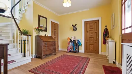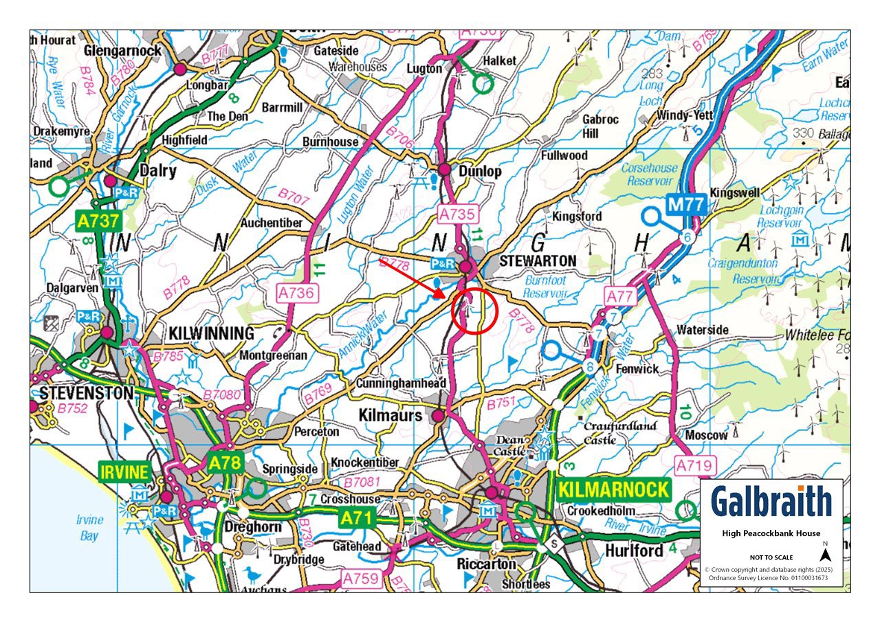High Peacockbank House is a charming C Listed farmhouse set in an idyllic location with superb views close to the popular town of Stewarton in East Ayrshire. Stewarton offers a good range of shops, primary and secondary schooling, local services, a sports centre, cafes and restaurants. Private schooling and a further range of shops, including Silverburn Shopping Centre is available in the south side of Glasgow (about 17 miles). Glasgow city centre is easily accessible via the M77 and Stewarton also has a railway station on the main line to Glasgow with a regular half hourly train service. Glasgow and Prestwick Airports have regular scheduled flight and are 18 and 14 miles respectively.The attractive countryside surrounding High Peacockbank is ideal for outdoor pursuits. Lainshaw Estate and Woodlands is situated close by and offers a network of beautiful woodland grounds and paths for walking and cycling. Ayrshire is renowned for its golf courses which include Turnberry, Royal Troon and Prestwick. Rowallan Castle Golf course is 3 miles distant and includes an events hotel and popular restaurant (The Glasshouse). There are two large equestrian facilities in the immediate vicinity and there is the opportunity for hacking in some of the quiet country lanes. Ayr Racecourse hosts the Scottish Grand National as well as other fixtures throughout the year and there are excellent yachting facilities at the marinas in Troon and Largs.High Peacockbank House is an attractive C Listed farmhouse built in 1787 over two storeys of stone and slate with a cream painted finish. It is set amid extensive garden grounds well stocked and beautifully maintained. It is the original farmhouse of High Peacockbank Farm where there is now a cluster of seven other houses of which two are adjoined to the side elevation of the property. High Peacockbank House is an impressive family home well-appointed and boasting a wealth of period features.The spacious accommodation at High Peacockbank House comprises a beautiful kitchen/dining/family room which is undoubtedly the heart of the home and a most comfortable and homely space for all the family to gather or ideal for entertaining. The kitchen with oak flooring has a 5 door green AGA, a central island, integrated dishwasher and microwave and sliding doors to the garden. The dining and living room overlook the front gardens and orchard and have attractive cornice and pine flooring. The sitting room benefits from full height wood panelled walls and a feature stone fireplace and hearth with gas stove, a glazed door gives access to the garden room with French doors leading to the gardens. Completing the ground floor is a cloakroom w.c. with laundry area.The impressive stone curved staircase sweeps up to the first floor where there are 3 bedrooms. The master bedroom has dual aspect with window seats overlooking the gardens. The family bathroom is generously proportioned and includes a corner bath, separate shower cubicle, wash hand basin set in vanity unit and w.c. There is ample storage and cupboard space throughout the house.High Peacockbank House is approached via a shared driveway which leads to a gravelled chipped drive with sandstone paving where there is ample parking. There is a pond in the front garden with a beautiful orchard stocked with apple, pear, cherry and plum trees, a vegetable garden and summer house. The rear gardens are mainly down to lawn and have commanding views to the Ayrshire coast. There is a lovely west facing patio, greenhouse and potting shed and the garden is stocked with camellias, azaleas, forsythia, hellebores, sweet peas which provide a variety of colour throughout the spring and summer. FLOOD RISKFlood maps of the area can be viewed at https://map.sepa.org.uk/floodmaps/FloodRisk/SearchEach year there is a 0.1% change of surface flooding in the garden.ACCESSHigh Peacockbank House has a right of access over the driveway and maintenance is shared between several users.LISTED BUILDINGHigh Peacockbank House is scheduled by Historic Scotland as a Listed Building, Category C(s).PLANNING PERMISSIONPlanning permission was granted in August 2022 to demolish the single storey rear extension and erect new extension to rear and side (Planning Ref: 22/0287/LB).DIRECTIONS From Ayr take the A/M77 north towards Glasgow. At Fenwick (Junction 8) take the slip road signed for Stewarton. Follow signs at the roundabout for the B778 to Stewarton. On entering the town (about 3.5 miles) turn left signed for Kilmarnock and Kilmaurs. At the top of the hill turn right through the white pillared entrance gates and turn left into the gravelled drive of High Peacockbank House.POST CODE KA3 5JG WHAT3WORDSTo find this property location to within 3 metres, download and use What3Words and enter the following 3 words: ///dragonfly.tweed.bulky