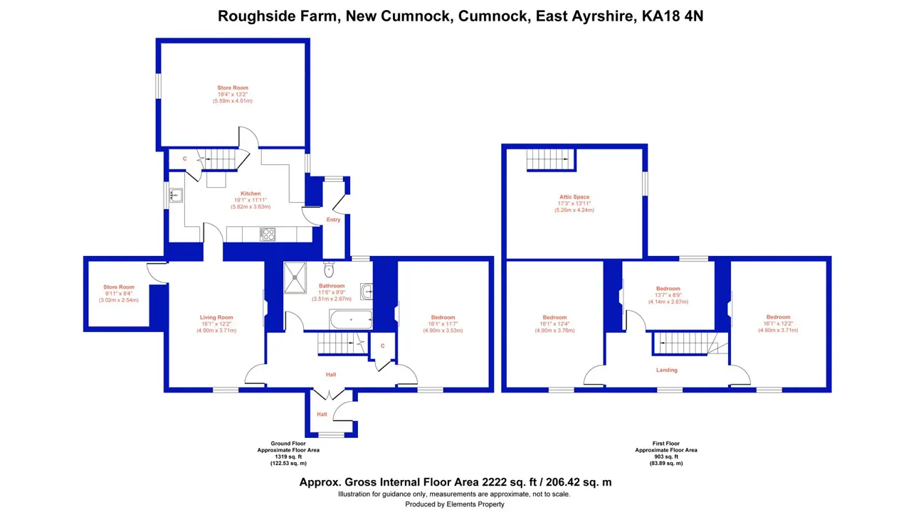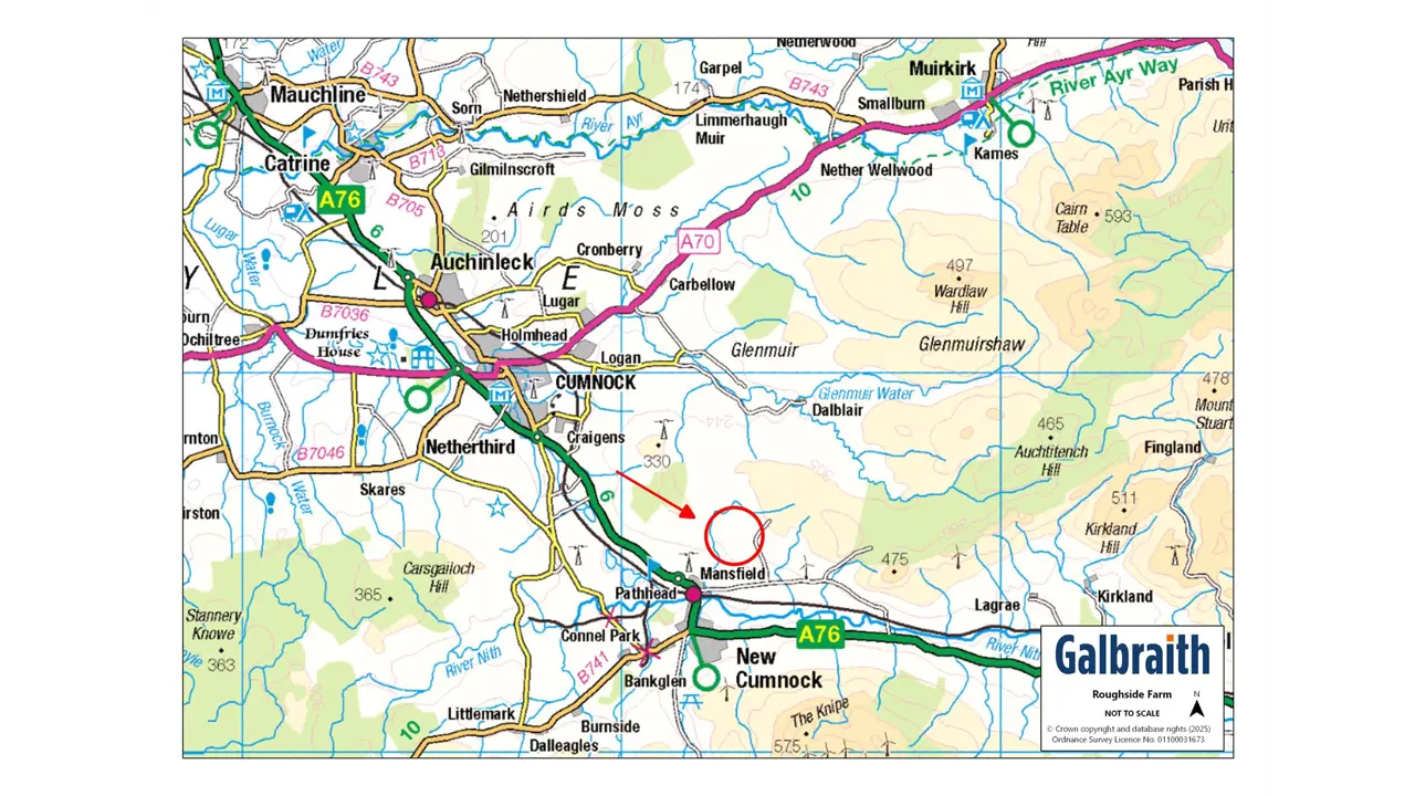 Roughside Farm is an attractive farmhouse comprising a range of modern and traditional buildings with land in an accessible location by New Cumnock. The farm is situated about 7 miles from Cumnock which has a wider range of facilities and the county town of Ayr is about 22 miles to the west. The Barony Campus in Cumnock has primary schooling, supported learning centre and secondary schooling, medical practice and local shops. The refurbished New Cumnock outdoor swimming pool (The Tamar Manoukian Pool) is open for the community to enjoy. There are excellent transport links in the area with a regular train service to Glasgow from New Cumnock and Ayr (22 miles), Glasgow Prestwick Airport is about 26 miles away with regular scheduled flights and Glasgow International Airport is approximately 48 miles. Ayrshire is renowned for its many golf courses, including the world-famous courses at Royal Troon and Turnberry. There is the popular Racecourse in Ayr and excellent yachting facilities at the Marina in Troon. Dumfries House Estate (about 9 miles) is one of Britain’s most beautiful stately homes with an outstanding collection of 18th century furniture, beautiful walled gardens and coffee house. Auchinleck Estate (12 miles) has a popular coffee shop (Boswell’s Coach House) within the Estate grounds, along with enjoyable riverside walks.The New Cumnock Access Network Paths has developed some interesting local walks in the area including the Knockshinnoch Lagoons which goes round a 130 hectare Scottish Wildlife Trust reserve, Burns Cairn and Glen Afton. Blackcraig Hill, is one of Ayrshire’s highest hills at 2,296 feet above sea level, along with three neighbouring hills all over 2,000 feet which can also be climbed. The views down the glen from Blackcraig Hill are particularly stunning on a clear day.Roughside farmhouse is a fine house built of stone under a slate roof with accommodation over two storeys. It comprises sitting room, living room, three bedrooms and kitchen with floor and wall units, integrated electric hob and electric oven. There is a stylish four-piece bathroom suite, complemented by two practical storerooms, offering ample storage or potential utility space. The farmhouse is approached via a concrete drive leading to the house, lodge and the farm buildings.Situated opposite the farmhouse, the lodge built of timber construction under a pitched roof, offers spacious accommodation including three bedrooms, living room, kitchen, shower room, and a sunroom, all enjoying lovely views across the open countryside. Adjoining the farmhouse are stone and slate traditional buildings which provide useful storage and subject to the necessary planning consents may also be suitable for conversion.Outhouse (About 5.56m x 2.32m)Attached outbuilding of masonry construction under a pitched and slated roof.Milk Parlour (About 13.74m x 6.10m)Storage area (Abut 4.64m x 2.99m)Attached structure of stone construction under a pitched roof, clad externally with slate and metal profile sheeting.Long Barn Room 1(About 17.72m x 5.08m)Room 2 (About 6.63m x 4.94m)Room 3 (About 10.05m x 4.94m)Detached structure of stone construction under a pitched and slated roof incorporating 16 solar panels.Hay Barn (About 24.27m x 5.49m)Detached steel portal frame barn of steel frame construction with metal external cladding.Hay/Silage Barn (About 16.37m x 6.86m)Detached structure of timber/steel framed construction with a metal clad external finish.The Byre (About 4.95m x 5.06m)Room 2 (About 5.03m x 4.87m)Detached structure of stone construction under a pitched and slated roof.Cow Shed (About 27.08m x 9.42m)Detached structure of brickwork construction under a pitched roof clad externally with corrugated asbestos sheeting.Arched Roof Barn Detached structure of stone construction under a barrel style roof clad externally with metal profile sheeting.Detached Stone OutbuildingDetached structure of stone construction under a pitched and slated roof.The land extends to about 26.34 acres of Grade 5(2) as per the James Hutton Institute soil classification. The land is currently used for grazing. The field to the front of the farmhouse is currently unfenced at the boundary. Prior to the sale completing the seller will erect an appropriate deer/agricultural fence.Prospective purchasers should note early discussions on a proposed wind farm development at Blackwood Farm, New Cumnock to include seven wind turbines reaching up to 200 metres in height, alongside a Battery Energy Storage System (BESS). Buyers are advised to consult East Ayrshire Council planning department directly.WHAT3WORDSTo find this property location to within 3 metres, download and use What3Words and enter the following 3 words: ///mocked.recliner.handbag