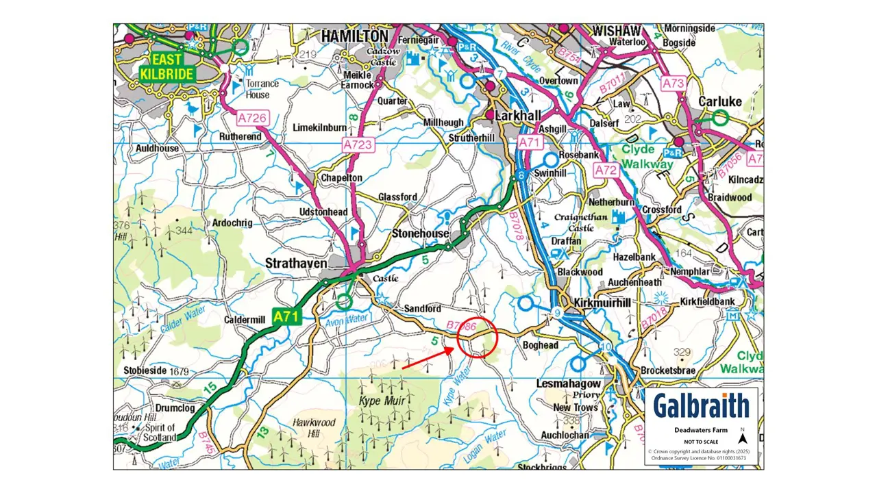 Deadwaters Farm is an attractive farmhouse comprising a range of traditional redundant farm buildings with land in an accessible location in South Lanarkshire.It is situated about 4 miles from Strathaven, 12 miles south east from East Kilbride and about 12 miles from Hamilton, which has a wide range of shops, leisure facilities, arts theatre, cinema and museums. Primary schooling is available in the beautiful conservation village of Sandford (about 1 mile) and primary and secondary schooling are also available in Strathaven. Private schooling is available at Hamilton College, Hamilton. Sandford village is home to one of the oldest mills in Avondale. Strathaven has an excellent range of local services including supermarket shopping, leisure centre and library, along with thriving coffee shops, tearooms, pubs and restaurants. Lesmahagow about 4 miles south also has a wide variety of shops and local services. Glasgow city centre is very accessible, East Kilbride and Hamilton both have railway stations with regular connections to Glasgow and beyond. Glasgow and Edinburgh Airports offer regular scheduled and domestic flights, and are 31 and 46 miles respectively.There are many interesting walks available in the area including the Spectacle E’e waterfalls lying in the Avon Valley at Sandford. The walk was given its name as the result of an incident involving a local man who fell in love with the miller’s daughter. The miller disapproved of the union and ended their relationship. As revenge, the man placed an eye glass in the mill’s thatch, which caused it to catch fire and the mill to be burned to the ground.Strathclyde Country Park (about 14 miles) in North Lanarkshire lies in some 400 hectares of countryside in the valley of the River Clyde. There are a number of golf courses in the area including an 18-hole course at Strathaven Golf Club (about 4 miles) and the racecourse at Hamilton provides regular fixtures. Excellent yachting facilities are available at the marinas at Ardrossan, Troon, Largs and Inverkip.The M74 motorway is easily accessible allowing swift access to the central belt and down south.Deadwaters Farm comprises a traditional stone farmhouse with render finish under a slate roof on one and a half storeys with farm buildings arranged around a rear courtyard. The farmhouse requires comprehensive renovation and the property offers the opportunity for the next owners to modernise to their desired specification. Its present accommodation includes entrance hall, dining room, living room, sitting room, bedroom and wet room shower, kitchen and bathroom on the ground floor with three coombed bedrooms on the first floor.There is a small garden to the front of the property enclosed by a stone wall.BUILDINGSAdjoining the farmhouse is a former stone byre (about 17.83m x 7.65m), with utility area, former dairy parlour and store.Stone barn: About 13.86m x 6.71mThere are further redundant farm buildings (with collapsed roofs).PLANNINGThe sellers have made initial enquiries with the Planning Department for the conversion of two farm buildings and the refurbishment of the existing farmhouse to form 3 detached dwelling houses.Deadwaters Farmhouse and buildings would also suit a private individual who could refurbish the farmhouse and buildings for their own purposes.We would recommend any planning enquiries should be directed to South Lanarkshire Council.LANDThere is about 4.12 acres grazing land, suitable agricultural fencing will be erected by completion. The land is classified as Grade (4.1) A right of access will be granted to a mains water supply.THIRD PARTY RIGHTS OF ACCESSAppropriate Rights of Access will be provided over points A and B on the plan.There is also a Right of Access at point C on the plan to the grazing paddock.DIRECTIONSFrom Strathaven, take the B7086 and continue east for about 3.9 miles, Deadwaters Farm is then on the left hand side.From Glasgow take the M74 southbound towards Carlisle, at junction 9 exit onto Carlisle Road/B7078 towards Kirkmuirhill/Blackwood. Take the B7086 towards Strathaven and Deadwaters Farm is then on the right hand side.ML11 0JHWHAT3WORDSTo find this property location to within 3 metres, download and use What3Words and enter the following 3 words:suitably.moment.situatedLOCAL AUTHORITYSouth Lanarkshire Council, Almada Street, Hamilton, South Lanarkshire, ML3 0AA 0303 123 1015FIXTURES AND FITTINGSNo items are included unless specifically mentioned in these particulars.