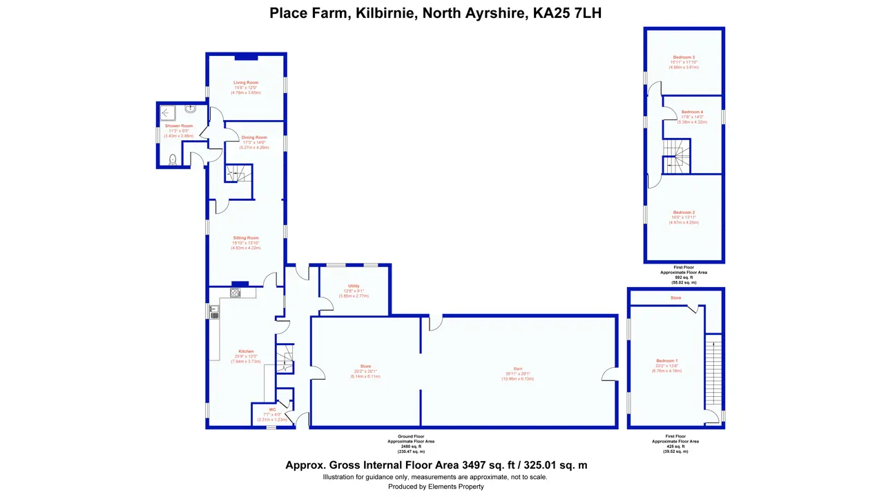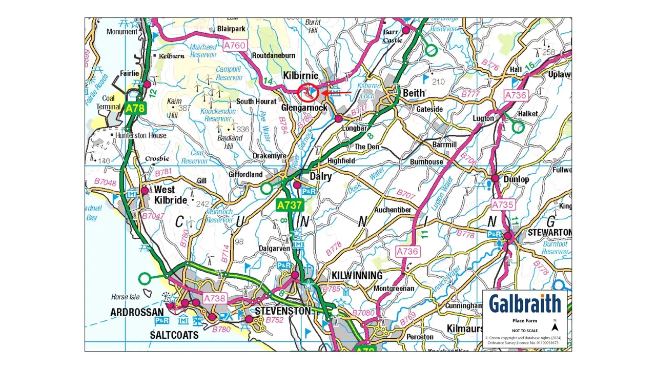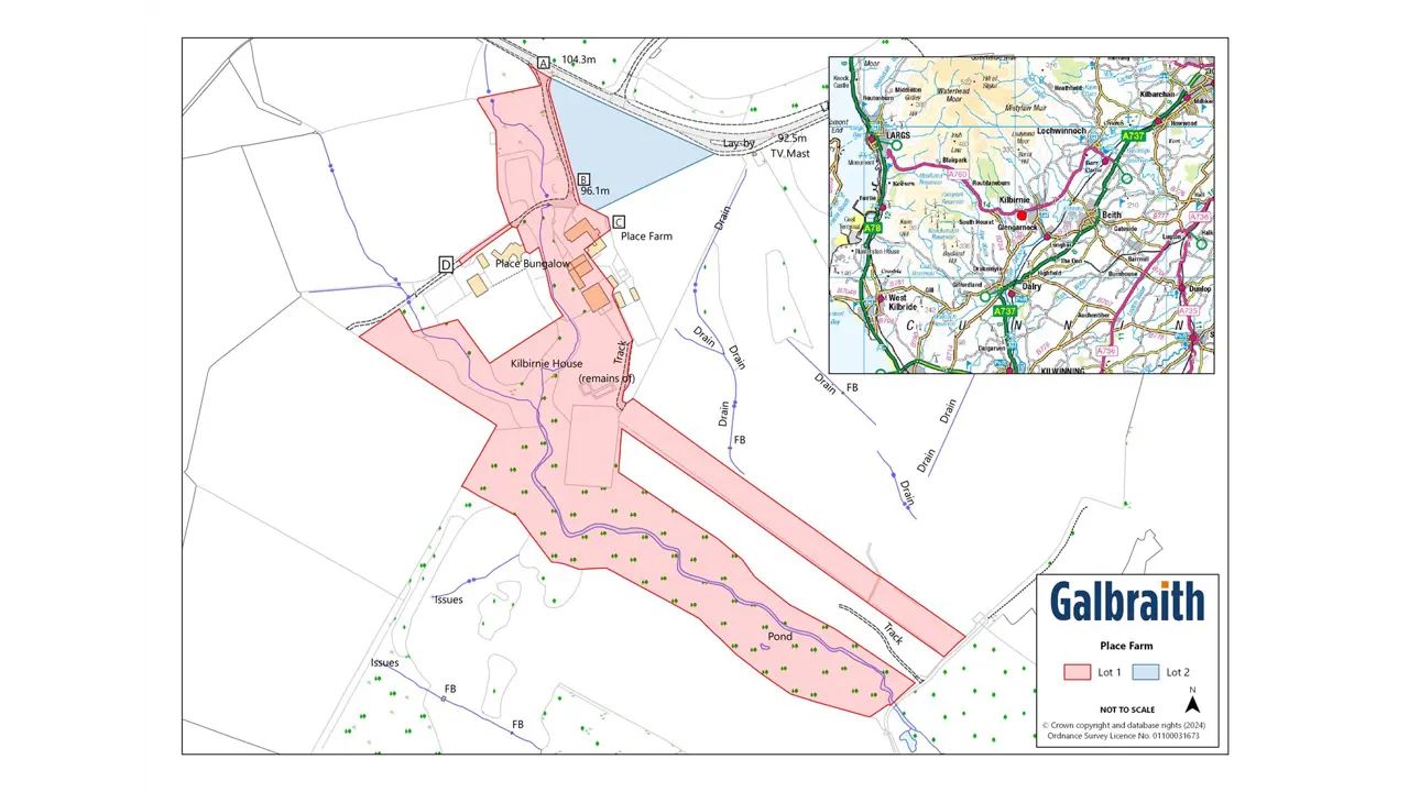 Place Farm is situated west of Kilbirnie town in North Ayrshire. It is nestled in the Garnock Valley with lovely elevated views, around 23 miles south west of Glasgow and approximately 15 miles from Glasgow Airport. Kilbirnie is well served with excellent local amenities including primary schooling, leisure club, library and a supermarket. Secondary schooling is available at the Garnock Community Campus which also has excellent leisure facilities including a swimming pool. The surrounding rolling Ayrshire countryside, offers a network of country lanes, ideal for walking, cycling and hacking, including Clyde Muirshiel Country Park (5 miles). More locally and adjacent to Place Farm is Kilbirnie Place Golf Club. Beith and Lochwinnoch both have courses available. Fishing is available at Kilbirnie Loch which is well stocked with rainbow and brown trout. There is also a waterski and wakeboard club. A passenger ferry ran across the loch at one time. There are excellent yachting facilities at the marinas at Largs, Ardrossan, Inverkip and Troon.Place Farm is an attractive substantial two storey cream painted traditional Ayrshire farmhouse of stone and slate semi-detached construction with part felt roof. It is approached from the public road to a tarmac courtyard with parking for several vehicles. The accommodation internally provides versatile living space. On the ground floor, the entrance porch leads to the entrance hall which provides a dining room and open plan sitting room with tiled fireplace, living room with wood burning stove and slate hearth, large kitchen with fitted units, double sink, electric hob and double oven and space for dining area. There is a Rayburn range cooker (not presently working). There is also a useful utility room, downstairs cloakroom and shower room. Stairs lead to a generous bedroom (there is no heating presently in this room) above the kitchen and there are 3 further bedrooms on the first floor. One wing of the house contains a large barn and store which would suit a variety of different uses. The enclosed floor plan shows the accommodation layout.The rear courtyard is down to tarmac and there are three substantial former farm buildings providing excellent storage. There is also a vehicle inspection pit. There are attractive gardens with an area of lawn and mature planted borders including hydrangeas and hosta.BUILDINGSBarn: 14.31m x 6.33mStone and slate.Adjoining car port: 5.46m x 6.21mCorrugated frame.General Purpose Shed: 5.35m x 18.3 with two lean tos: 6.5m x 18.3m & 9.0m x 18.3mCorrugated frame, concrete and earth floor.Dutch Barn: 6.1m x 19.2m with lean to 10m x 13.2mWith 4 bays, earth floor.LANDPlace Farm extends to approximately 18.89 acres (7.64 Ha) in total and is a mixture of grazing ground, woodland and shrubs. The land is principally classified Grade 3(1) by the James Hutton Institute and rises from approximately 70m to 100m above sea level at its highest point. Within Lot 1 stands the ruins of Kilbirnie Castle and mansion house as described later. The land is registered under the Basic Payment Scheme as Region 1. The payment for 2024 will be retained by the vendors.Should the property be sold in lots, the sellers will apportion the entitlements between the Lots 1 and 2.ACCESSThere is right of access over the drive for the neighbouring properties as marked A - C - D on the enclosed plan. If Lot 2 is sold separately, there will be a Right of Access from A to B marked on the plan.KILBIRNIE CASTLEWithin the grounds, lie the substantial remains of Kilbirnie Castle which dates to the 1400s, the building was destroyed by fire in May 1757. The 19th Earl of Crawfurd, along with his infant daughter (later of Countess of Eglinton) had little time to escape. Some of the buildings were then retained as a hunting lodge. The approach to the castle from the south was a long straight avenue was bordered by high walls once enclosing large gardens. Kilbirnie Castle is said to be on the site where in 1263 the Scots mustered under Alexander III before fighting Norwegian forces in the Battle of Largs. The building is also known as the Place of Kilbirnie, The Place or Kilbirnie House.