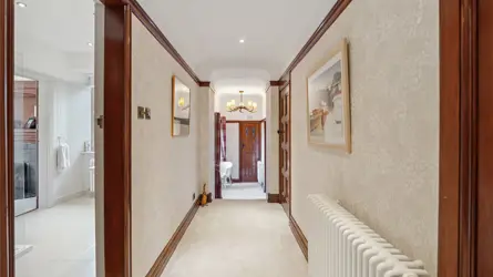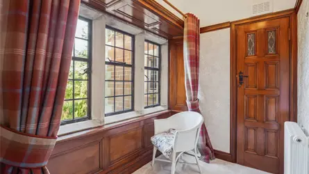 No 3 Carlung House is an exceptionally spacious and beautifully presented first floor apartment in Carlung House, nestled within a lovely wooded setting at Carlung Estate. Located about 1 mile from Scotland’s only Craft Town, West Kilbride, which offers a full range of amenities including primary schooling, doctor’s surgery, shops and services and a variety of sporting facilities. The Barony Centre, set within a restored church is home to a craft exhibition centre, gallery shop and café. There are beautiful sandy beaches at West Kilbride and Portencross (2 miles west) is a small hamlet with a harbour, castle and pier with magnificent views of the Firth of Clyde and coastline. For wildlife enthusiasts, Black Guillemot, Oystercatchers and Cormorants are just some of the sea birds which can be seen. Seamill Hydro Hotel is about 3 miles distant with leisure club and swimming pool. The Ayrshire coastline is renowned for its range of outdoor activities including golf courses which include Royal Troon, Prestwick, Turnberry and Largs and West Kilbride Golf Club, Seamill (1.2 miles). The popular Ayrshire Coastal Path leads along the shore from West Kilbride to Portencross towards Hunterson and on to Largs. There are also some fabulous sea views from Law Hill which sits above the town. The Firth of Clyde offers some of the most scenic coastal sailing in the country and there are marina and chandlery services at both Largs and Inverkip. Main line rail services run from West Kilbride to Glasgow and the A737 allows road access to Glasgow Airport and the M8 into Glasgow City Centre. DESCRIPTION 3 Carlung House is a stunning first floor apartment in this imposing B Listed mansion house. With thoughtfully designed and luxurious accommodation, the property briefly comprises a kitchen/diner, living room, master bedroom, shower room (also connected to the master bedroom), 2nd bedroom and utility. The original Carlung House was destroyed by fire in 1902 and a completely new and much larger magnificent Elizabethan Manorial House was built in 1930-32. The property was split into 5 spacious apartments into the current arrangement in the 1970’s. Constructed of red Northumberland stone with sandstone dressings the property retains many original features including Austrian oak panelling and lead lined windows and over the entrance door is a carved Viking ship.ACCOMMODATION First Floor: Living Room, Kitchen, Two Bedrooms, Shower Room, Utility.The property offers spacious and immaculately presented accommodation, arranged over the first floor of this impressive property. With many character features including panelled walls, hardwood doors complete with stained glass and deep coving. Accessed via a secure communal hallway, the apartment is entered through a hall, the super kitchen/diner which has been carefully planned and designed by Murray and Murray with a range of tasteful fitted wall and base units, integrated appliances including freezer, fridge, dishwasher and wine cooler, with Belfast sink, tiled splashback, tiled floor and Bluetooth ceiling audio system, there is a cosy breakfast bench seating area with plinth heater. The spacious shower room has a large walk-in shower, electric flat towel raditator, tiled floor, w.c. and sink with built in bathroom storage units. This leads to the generous master bedroom with open fire, bay window and curved bath. The impressive living room has magnificent views over the estate gardens and a fabulous open fire. There is a second double bedroom which would make an excellent home office, utility area with plumbing for washing machine, tumble drier and sink and a useful storage cupboard is situated off the hall.GARDEN (AND GROUNDS) Externally the property benefits from a garage complete with power which was built in 2018. Carlung House is approached by a tree lined driveway which leads to a large stone chipped parking area with parking space for multiple vehicles. The wooded communal grounds are extensive and provide the residents of Carlung House with a peaceful parkland setting which boasts a wealth of wildlife including a variety of birds and some deer. There is an area of private grounds belonging to 3 Carlung House.GARAGESingle garage with up and over door, power.DIRECTIONSAt West Kilbride, from the junction at Portencross Road / B7048 Crosshill Brae, proceed north on Irvine Road towards Largs and the entrance to Carlung Estate is on the left hand side after about 0.28 miles.3 Carlung House, Carlung Estate, West Kilbride, North Ayrshire, KA23 9PU WHAT3WORDSTo find this property location to within 3 metres, download and use What3Words and enter the following 3 words: uses.schematic.resettleSOLICITORSWallace Hodge & Co, 6 Burns Statue Square, Ayr, KA7 2EA, Tel: 01292 611177LOCAL AUTHORITYNorth Ayrshire Council Cunninghame House Irvine KA12 8EE Tel: 01294 310000FIXTURES AND FITTINGSNo items are included unless specifically mentioned in these particulars. Fitted carpets, blinds and curtains are included in the sale. The falcon range, light fittings in the master bedroom and living room are excluded from the sale, and may be available by separate negotiation.VIEWINGSStrictly by appointment with the Selling Agents.
