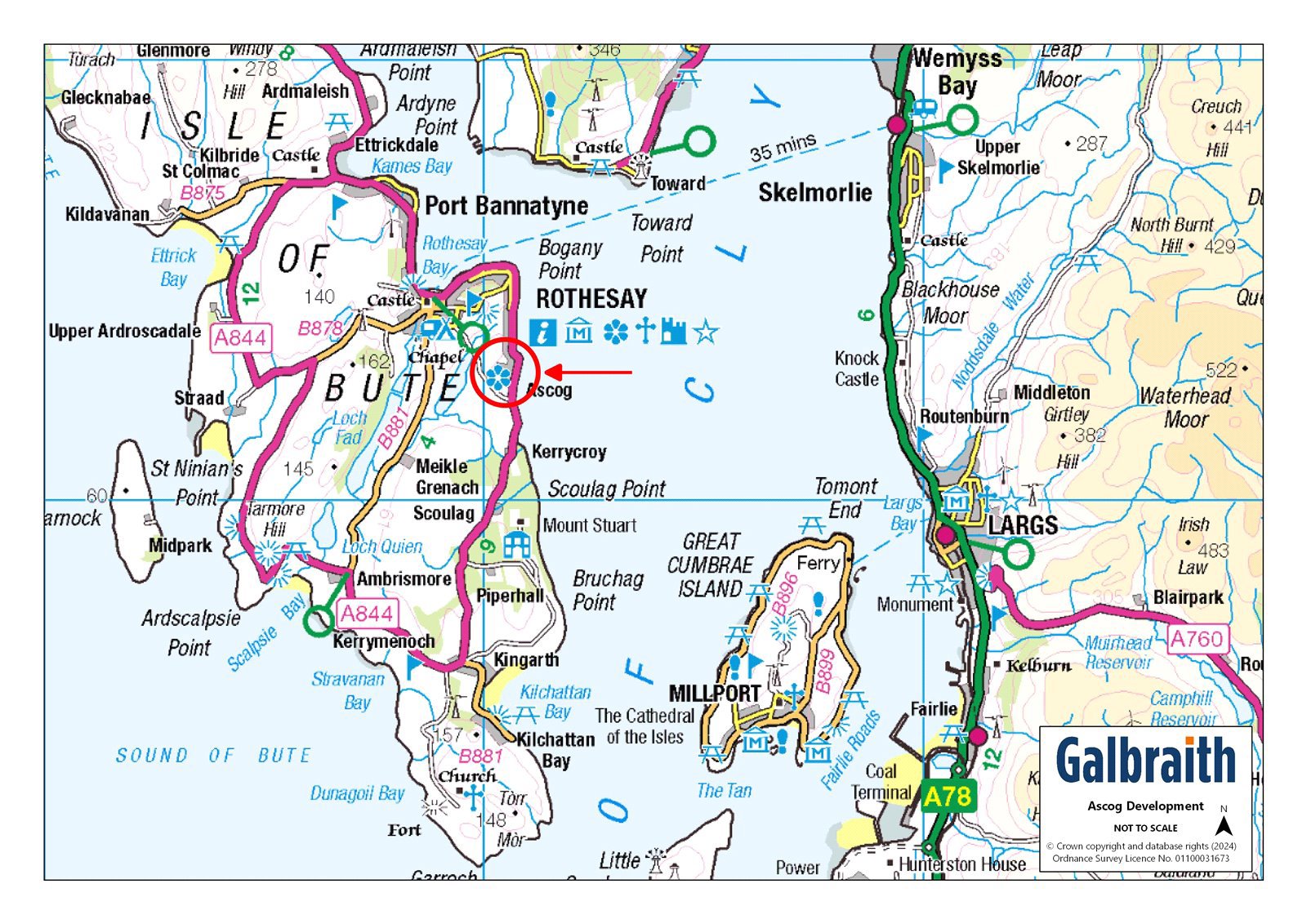 A beautiful and historic island, Bute is situated in the heart of the Firth of Clyde, off Scotland’s verdant west coast. The island possesses areas of great scenic beauty and has been a popular holiday destination dating back to Victorian times and is one of the most accessible islands. Due to its proximity to the Gulf Stream, the island enjoys a particularly mild climate and has become known as the “Madeira of Scotland”. Bute is divided in two by the Highland Boundary Fault (a geological fault), in the north the island is hilly and largely uncultivated and to the south, is more rolling and highly cultivated. The western side of Bute is known for its glorious sandy beaches, many of which enjoy fine views over the Sound of Bute towards Arran.Rothesay (about 3 miles) offers an extensive range of amenities including primary and secondary schooling, a campus of the Argyll College, a good range of shops, a first class community hospital and leisure centre with swimming pool. There is easy access to mainland ferry connections (Caledonian MacBrayne) from Rothesay to Wemyss Bay ensuring that Glasgow City centre and Glasgow Airport can be reached with ease. Wemyss Bay has a direct train link to the city centre whilst Glasgow Prestwick Airport and the popular Ayrshire coastal towns are also easily accessible. A second ferry from Rhubodach on the north of the island to Colintraive on the Cowal Peninsula allows for easy access for visiting Argyll and the west coast of Scotland.The Isle of Bute offers a wide range of leisure and recreation amenities including some excellent walking including The West Island Way which runs the length of the island for 30 miles, and the best views from the island can be seen from Canada Hill. Golf is available on the island’s three courses and the Discovery Centre at Rothesay houses a small cinema together with Visit Scotland information centre.There are exceptional yachting facilities at the marinas in Troon, Largs, Inverkip and Port Bannatyne Marina has 108 berths serving the west coast and the islands.Mount Stewart House and Gardens are open to the public from May to October, with private house tours available through winter, with its enchanting 19th century manor house and 300 acres of fabulous gardens with arboricultural and horiticultural collections, Mount Stewart holds a fascinating exhibition collection together with a courtyard café.The development site sits to the south of the village of Ascog in a desirable position and enjoys lovely coastal views. Formerly a paddock, the field is bounded to the east by a low mixed rubble stone wall, to the north by the gardens of Southpark House, to the south by the gardens of Hawkstone House and to the west by a tree lined embankment. This sought after location, benefits from excellent walks and cycle routes available directly from the property. Rothesay ferry terminal is approximately 3 miles north. The property was granted full planning consent Ref: 06/01710/DET validated 29th May 2012 for 2 detached houses and 2 apartment blocks (8 apartments). There is scope to revise this planning consent subject to meeting any local plan policies and all enquiries should be submitted to Argyll and Bute Council.SERVICESMains gas is available.FLOOD RISKFlood maps of the area can be viewed at https://map.sepa.org.uk/floodmaps/FloodRisk/SearchA small section has a 10% chance risk of surface water flooding in any one year.DIRECTIONSFrom Glasgow, head west on the M8. Continuing past Greenock, head onto the A78 into Wemyss Bay. Take the Caledonian Macbrayne ferry from Wemyss Bay to Rothesay. From the Rothesay ferry terminal drive south along the A844 passing through Rothesay into Ascog. On exiting the village of Ascog, just after Balmory Road entrance, the site is located on the right hand side between the houses of Southpark and Hawkstone.PA20 9EUWHAT3WORDSTo find this property location to within 3 metres, download and use What3Words and enter the following 3 words: https://w3w.co/mint.grandest.mooring