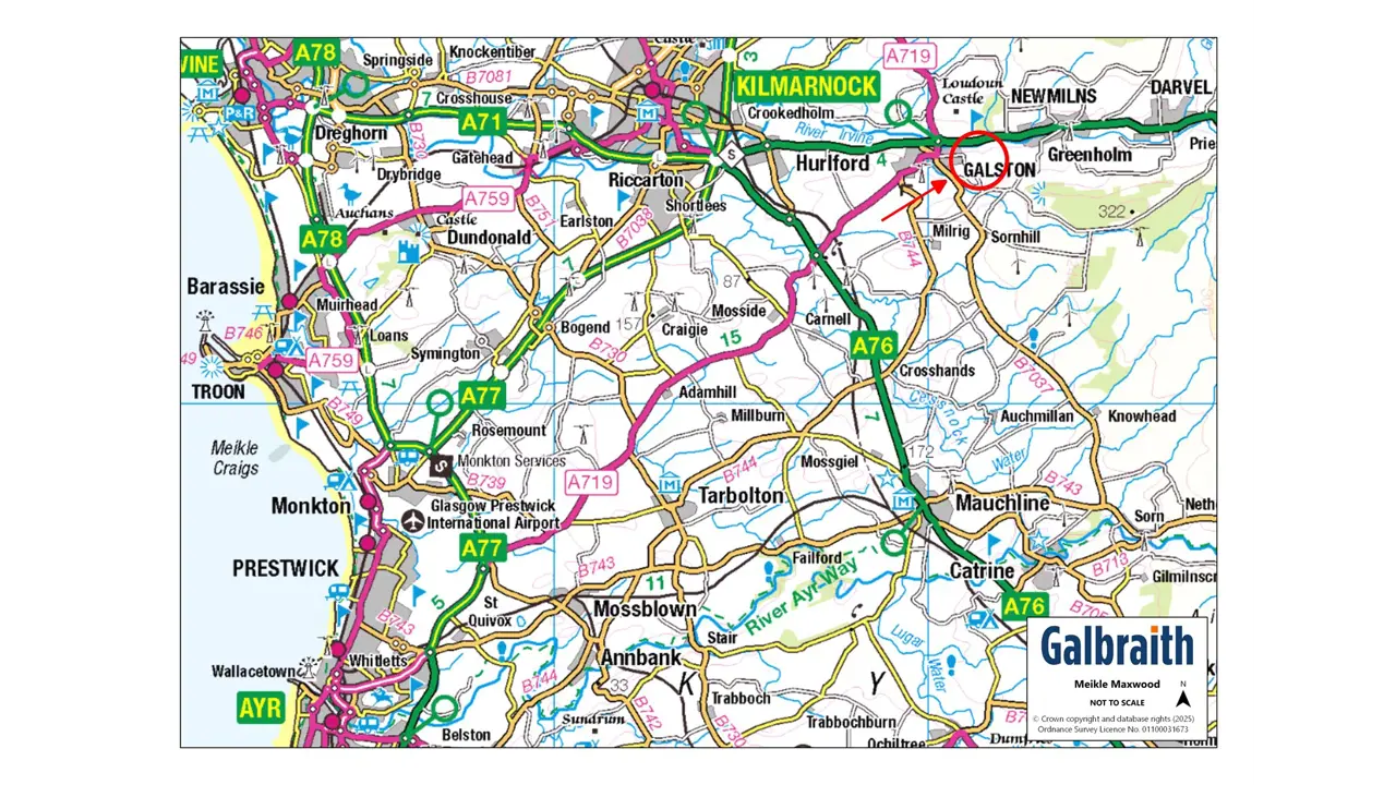 - Galston 1 mile Ayr 16 miles Glasgow 25 miles.