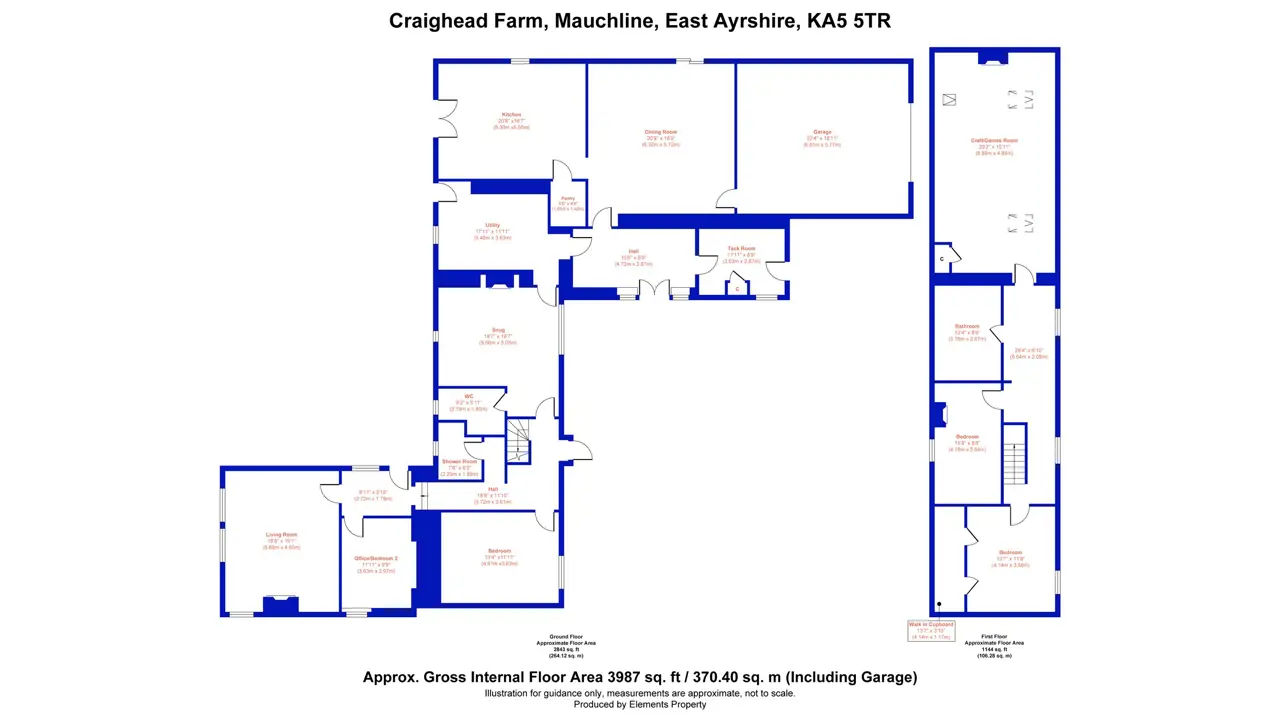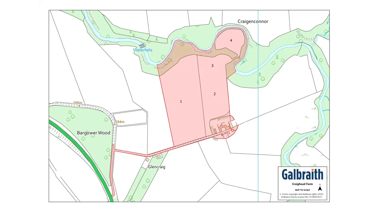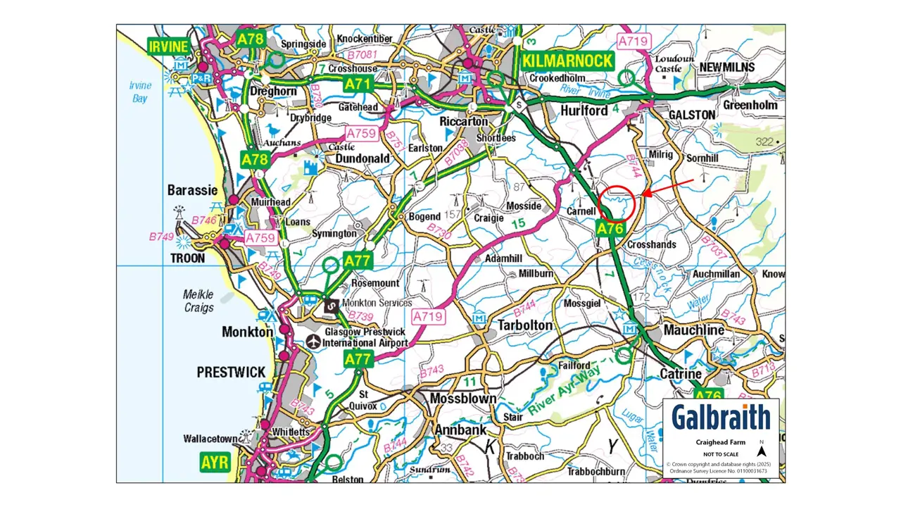 Craighead Farm boasts a convenient setting close to the A76, ideally placed between Kilmarnock and Mauchline, and with onward travel to Glasgow within comfortable reach.Craighead Farm is an attractive farmhouse with useful buildings and land in an accessible location in East Ayrshire. Primary schooling is available at Mauchline (about 3.5 miles) along with a good range of services including doctors surgery, bank and local shops. The farm is situated approximately 4 miles from Galston with secondary schooling and a variety of shops including a superstore.The farm is situated about 6 miles from Kilmarnock with secondary schooling and a wide range of facilities, and is well placed for easy access to Ayr and Glasgow by the A76 and M77. There are excellent transport links in the area with a regular train service to Glasgow from Kilmarnock (about 8 miles) and Auchinleck (about 8 miles), Glasgow Prestwick Airport is about 13 miles away with regular scheduled international flights and Glasgow International Airport is about 32 miles. The towns of Ayr and Kilmarnock offer a wide range of amenities including excellent shopping, restaurants, cinemas and sports facilities. There are good private and state schools in the area too.Ayrshire is renowned for its many golf courses including the world famous courses at Royal Troon and Turnberry, Ballochmyle Golf Course (5 miles) is a popular 18 hole course and the world class 19 hole golf course designed by Colin Montgomerie at Rowallan Castle is some 9 miles away. There is the popular Racecourse in Ayr and excellent yachting facilities at the Marina in Troon. The 44 mile River Ayr Way long distance walk is nearby, and the route travels along by Sorn Castle and the Ballochmyle Viaduct at Mauchline which are both particularly interesting sections of the walk. Mauchline also has a local heritage trail in memory of Robert Burns, The Burns Heritage Trail.DESCRIPTIONCraighead Farm is an attractive and substantial traditional Ayrshire farmhouse of stone and slate on two storeys with a recently completed single storey conversion together with useful stone buildings. It is approached from the drive to a courtyard enclosed by the house and it’s two wings.The house has been extended by the conversion of one wing into additional accommodation comprising a new kitchen, dining room with one and a half height ceiling which overlooks the walled garden, a tack room and double garage. Potential exists within the property for division for the purposes of multi-generational living, guest or holiday let accommodation. There are former farm buildings, presently used as a car port and greenhouse. Craighead Farm is said to date back to 1750. The grounds extend to about 27.9 acres in all.A versatile and generously sized property, likely to attract diverse buyers, with particular appeal to those interested in equestrian activities, development opportunities or livestock farming.ACCOMMODATION Ground Floor: Living Room, Dining Room, Kitchen, Snug, Utility Room, Bedroom, Office/Bedroom 2, Shower Room, separate w.c. Tack Room.First Floor: 2 Bedrooms, Bathroom, Games Room. On the ground floor there is a cosy snug with wood burning stove, spacious living room with wood burning stove overlooking the gardens, bedroom, 2nd bedroom/office, shower room, separate w.c. and utility room with fitted wall units. The new annexe comprises farmhouse house style kitchen with floor and wall units, double oven and microwave, electric hob, dishwasher and space for fridge freezer. The dining room has one and a half height ceiling which overlooks the walled garden area, spacious hall, tack room and garage. The first floor has two bedrooms, Victorian style bathroom with roll top bath and separate shower and a large games room.Craighead Farm has oil fired central heating and the annexe has air source heat pump with underfloor heating.GARDEN The extensive gardens are mainly down to lawn with a pond and patio seating area. The courtyard has ample parking for several cars and vehicles. BUILDINGSAdjoining Farmhouse:Barn: About 4.99m x 13.77mStone and slate with 3 stables and hay store/stable 4, power available (about 4.09m x 3.76m and 3.66m x 3.31m and 5.09m x 3.00m and 3.66m x 3.31m).Stables: About 8.58m x 4.86mStone and slate with 2 stables, wide corridor/storage space, power and water available (about 2.77m x 4.079m and 4.50m x 2.86m).General Purpose Shed: About 12.13m x 18.43mSteel frame with tin clad walls, sand surface. Currently used for equestrian training.Car port: About 9.25m x 4.69m Brick with corrugated roof.Greenhouse: Brick frame with polycarbonate roof. Raised beds and planters, water and electricity.LANDThere are two grazing paddocks extending to 18.41 acres (7.4 ha) in total. The land is principally classified Grade 4(2) and 6(2) by the James Hutton Institute, water is available in both paddocks. To the north, there is also about 3.36 acres amenity woodland.A sweeping bend of the Cessnock Water embraces a secluded 2.15 acre meadow at the valley floor, cradled by a high natural cliff “Craigenconnor”, creating a haven for wildlife including peregrine falcon and deer, a tranquil recreational asset. ACCESSThe neighbouring properties have rights of access over the drive with shared maintenance. DIRECTIONS From Crossroads Roundabout, take exit onto A76, drive for about 1.47 miles and turn left, drive for a further 600 feet, turn right, continue towards the end of the road, Craighead Farmhouse is then on the left hand side.POST CODE KA5 5TRWHAT3WORDSTo find this property location to within 3 metres, download and use What3Words and enter the following 3 words: ///downsize.hours.conductor