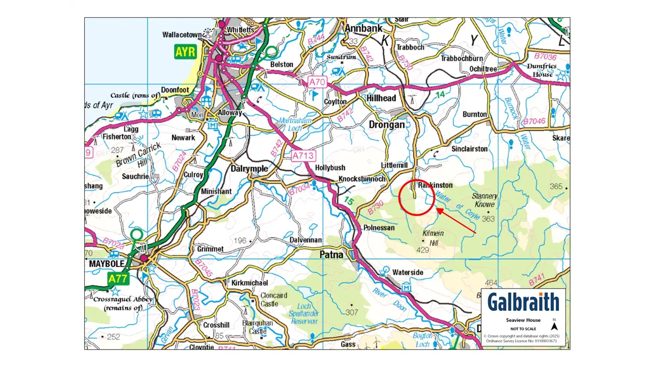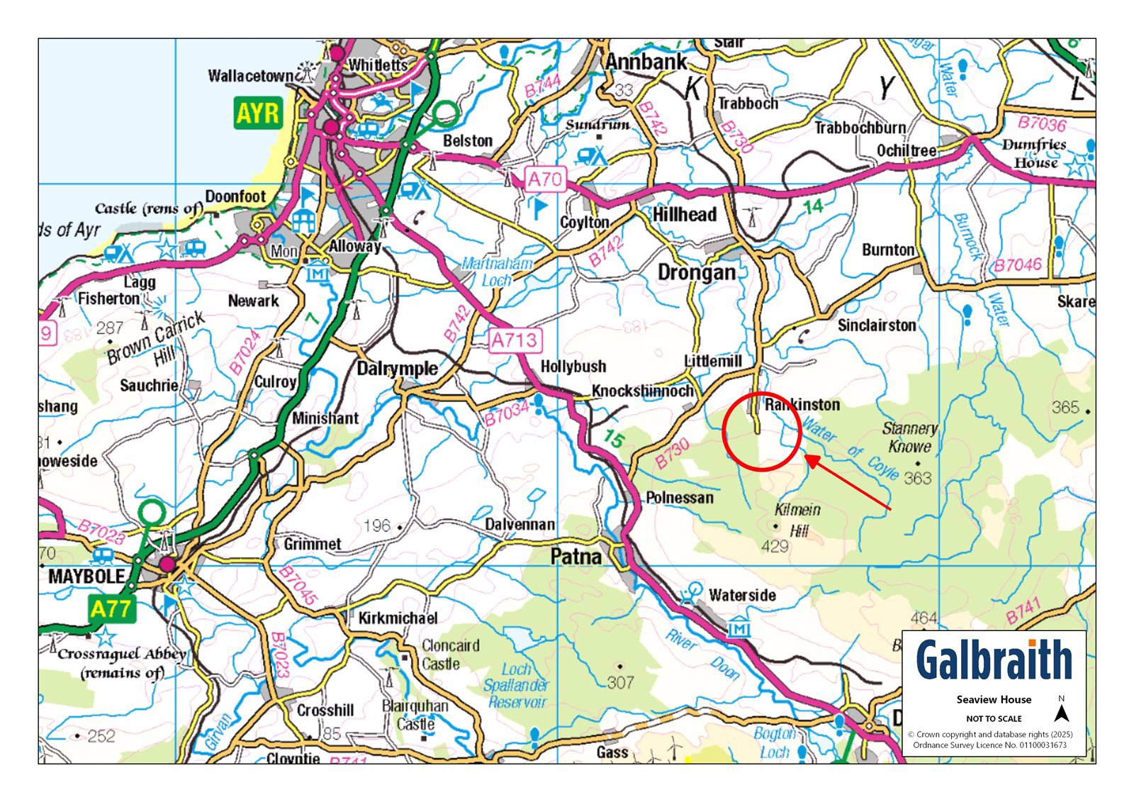 Seaview House is located in a peaceful location about half a mile outside the small village of Rankinston, East Ayrshire, with some lovely panoramic views of the surrounding Ayrshire countryside and beyond to Ben Lomond in the Trossachs National Park. Off road hacking is available in the local forest with a network of paths available for those with equestrian interests. Rankinston is situated approximately 10 miles south east of the county town of Ayr. There is exceptional access to outdoor walks, wildlife, and outdoor activities such as mountain biking. The village has a primary school (Littlemill) and a local Community Centre. There is also a bus link to Ayr every 2 hours. The nearby village of Drongan has a medical practice, village store and bakery. The market town of Ayr has a wide range of shops, supermarkets and leisure facilities.Ayrshire is renowned for its many golf courses including the world famous facilities at Royal Troon, Prestwick and Turnberry. There is a 12 hole golf course at Roodlea (8½ miles away). There are excellent equestrian facilities Ayr Equitation Centre (7 miles) with fine sailing on the Firth of Clyde with yachting marinas at Troon, Largs and Inverkip. Ayrshire has many delightful walks including the River Ayr Way walk which passes through several local towns and villages which each have their own unique network of paths. Dumfries House, a Palladian country house (10 miles) is set in a 2,000 acre estate with an outstanding collection of 18th century furniture, beautiful walled gardens and coffee shop.Seaview House is an attractive single storey extended cottage which was built for the former Mine Foreman of the local village Rankinston, which was at one time a thriving mining community in the 19th century. Built of stone and brick with a cream render finish under a tiled roof. The current vendors have greatly improved and modernised the property sympathetically to the history and character of the house to include an oil central heating tank, under floor heating (wi-fi enabled), re-wiring, walls have been replastered and re-limed, new double glazing, exterior doors replaced, conservatory re-roofed and insulated, 3 bar pressure pump installed, passive ventilation system has been installed in the cottage, offering natural and energy-efficient airflow without the need for fans or electricity to regulate the air flow. The property has a timber gated entrance with a cobbled drive and ample parking. Internally the accommodation is well proportioned with lovely high ceilings throughout offering spacious open living and retains some original features with attractive cornicing and coving. The entrance hall leads into the spacious kitchen / dining area with wood floor, there is a range of cream fitted base and wall cabinets, sink and electric Aga cooker with 4-oven control (the Aga is available by separate negotiation). The kitchen opens out to the conservatory which has French doors to the private gardens. There is a family bathroom with bath with shower over, 4 bedrooms, a spacious and inviting living room with wood-burner on stone hearth and a fitted library enhancing a warm, inviting and cozy atmosphere, shower room, large utility room with plumbing for washing machine, tumble dryer and fridge freezer. There is also a boot room area with door to outside.The adjoining studio/workshop has glass sliding door entrance, concrete floor and has been re-wired (this is a useful addition to the house lending itself for a studio/or hobby room. Ground Floor: Conservatory, Kitchen, 4 Bedrooms, Bathroom, Shower Room, Utility Room and Studio/Workshop.Seaview House offers the opportunity to be self-sufficient with mature and extensive open and covered vegetable gardens, green house, and an established fruit garden. The delightful private gardens which are bounded by hedging and a brick and stone wall, with an area of lawn together with a wide variety of flowers, shrubs and bushes that produce a wealth of colour throughout the summer including buddleia, iris, roses, and rhododendrons, providing a beautiful habitat for local biodiversity. There is a large terrace patio seating area, a pond and a vegetable garden with raised beds. There are fruit trees including apple, blackcurrant, gooseberry and rhubarb. A wildflower meadow area includes a fire pit, children’s climbing frame and willow tunnel structure.Seaview House poses opportunity for further development with the outbuildings currently used for storage and animal stock shelter. Subject to obtaining necessary planning consents, these buildings could offer development potential.Feed Barn: About 2.73m x 2.24m and 2.69m x 3.69 and 4.58m x 2.73m and 2.76m x 1.3m.Brick with corrugated roof.Adjoining glass greenhouse.Foaling Shed: About 5.05m x 4.87mBreezeblock with slate roof.Wood Store: About 4.18m x 3.08m and 3.02m x 2.87m Greenhouse.Garden shed (timber framed).Garden Sauna Cabin and plunge pool (available by separate negotiation). There is about 3.4 acres grazing land served by a burn in a fenced enclosure with a shelterbelt of woodland. The land has been classified as Grade 5(2) by the James Hutton Institute and has been improved with new drainage and fencing. Seaview House holding No. 182/0083. The land is situated about 250.5 metres above sea level. The house has 16 solar panels providing FIT income of about £2,000 per annum.