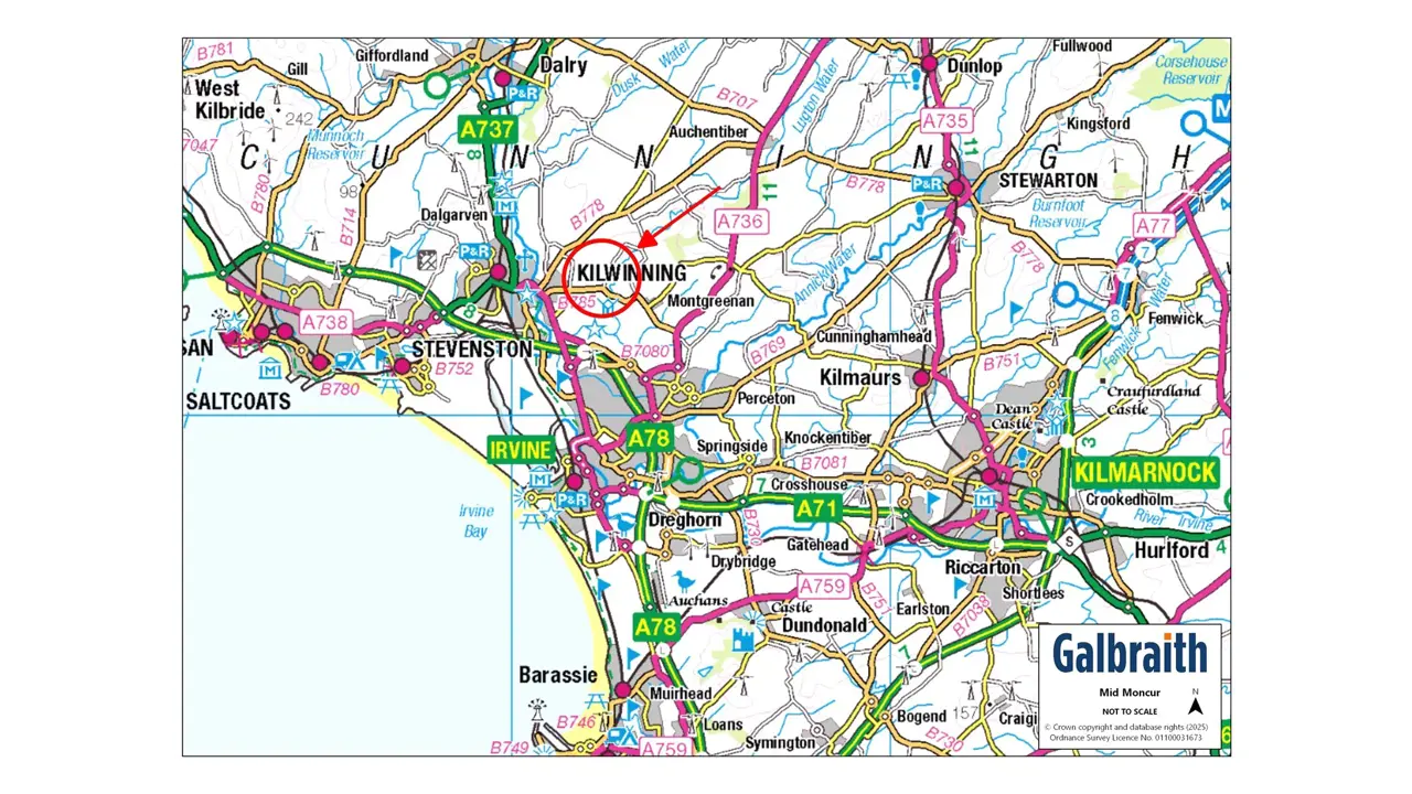 Mid Moncur is situated in a slightly elevated position close to the North Ayrshire town of Kilwinning. Locally there are an excellent range of services and facilities including primary schools and a secondary school whilst more comprehensive service and leisure facilities and retail parks are available in the nearby larger towns of Ayr, Kilmarnock and Irvine. Glasgow is easily reached via the A736 or A737 and Kilwinning also has a railway station on the main line to Glasgow with a regular train service. Glasgow and Prestwick Airports are 23 and 14 miles away respectively.The surrounding countryside is ideal for outdoor pursuits. Nearby Eglinton Country Park offers horse-riding on an extensive network of bridleways, as well as permit fishing for Eglinton Loch and the River Lugton. Ayrshire is renowned for its golf courses which include Royal Troon, Prestwick and Turnberry. Ayr Racecourse holds regular fixtures including the Ayr Gold Cup and Scottish Grand National. Sailing is popular on the Firth of Clyde with yacht marinas at Troon, Largs and Inverkip.DESCRIPTIONLot 1: Mid Moncur is a charming former farmhouse which exudes rustic charm and timeless character. It is built over two storeys of stone under a slate roof and has retained some original features including exposed stone walls, wooden beams and a vaulted ceiling. A degree of sympathetic modernisation would enhance this family home which comprises; a cosy living room with dual aspect windows, wooden flooring, wood burning stove set in a stone surround and beamed ceiling. The kitchen is of an older style and has floor and wall units under a granite worktop and opens into a breakfast room/utility area which overlooks the garden. The dining room opens into the striking vaulted ceiling sitting room flooded with natural light from the triple aspect windows and French doors to the garden, open coal fire set in brick surround and wooden mantel. There is a cloakroom with w.c. and wash hand basin on the ground floor. The staircase with iron spindles and wooden balustrade rises to the first floor which has three bedrooms (master with en suite shower room) and bathroom complete with bath, shower cubicle, w.c. and wash hand basin. The rear garden is mainly down to lawn with some mature trees and there is a 3 acre grazing paddock at the front of the propertyACCESS/THIRD PARTY RIGHTS OF ACCESS/ SERVITUDES ETCThe farmhouse and Plots 3 and 4 will have shared ownership and maintenance of the access drive (hatched black on the plan).IMPORTANT NOTEJapanese Knotweed was identified in the rear garden of the farmhouse (Lot 1) some 15m from the house. The seller has dug it out and removed it from the property.