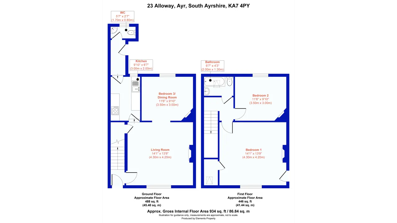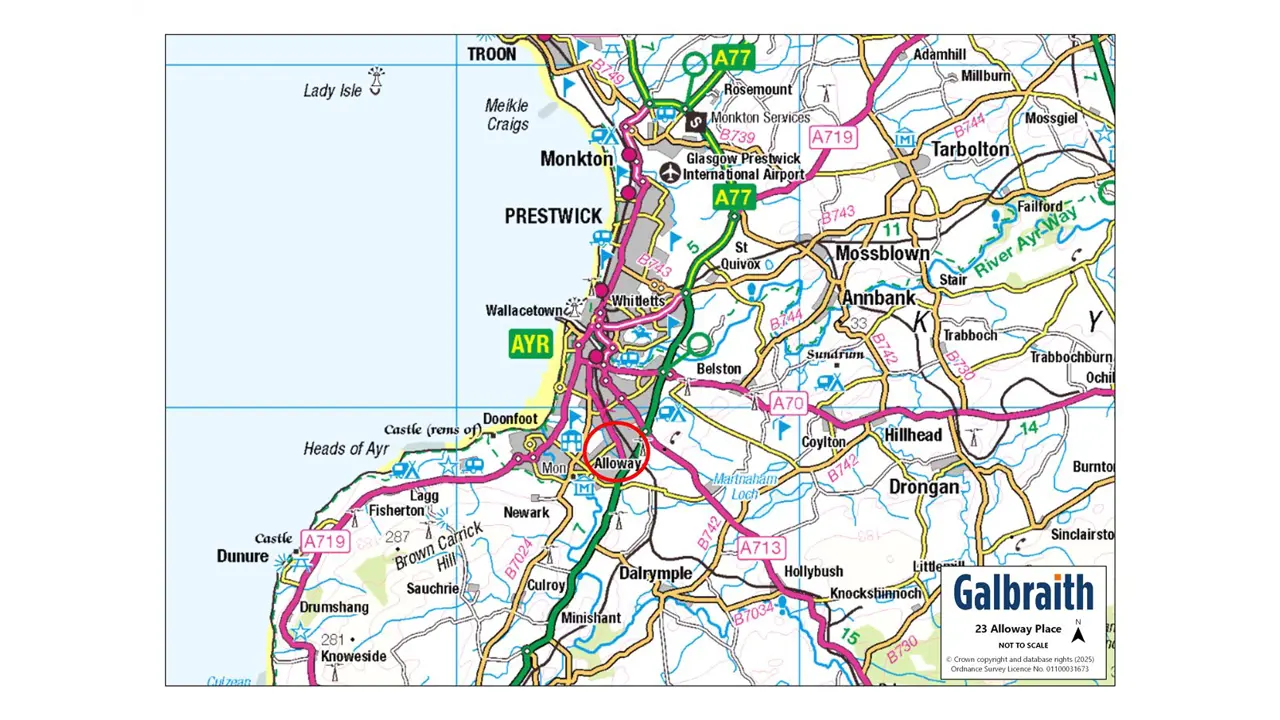 23 Alloway is a delightful, terraced house situated opposite Burns Cottage and Museum in the picturesque historic village of Alloway in South Ayrshire. There is a post office with general store, pharmacy, coffee shop, gift shop and the village hall are in the close vicinity. Alloway Primary school located within walking distance as are the church, Burns Experience, the cricket and rugby club, Rozelle Park and Brig O Doon Hotel. Ayr has a variety of high street shops, bars and restaurants as well as many professional services and recreational facilities. The popular racecourse in Ayr hosts the Scottish Grand National and there are yachting marinas at Troon, Ardrossan and Largs. A number of Scotland’s most famous Links golf courses including Royal Troon, Turnberry and Prestwick are close at hand. In addition to pleasant beach walks along the promenade and the nearby parks, there are some delightful river walks along the River Ayr including a deep wooded gorge ascending to a viewpoint known as Wallace’s Seat. Glasgow is easily accessible via the A/M77 and there is a regular train and bus service. Prestwick and Glasgow airports are 6.5 and 42 miles respectively.23 Alloway is built over two storeys of solid brick with a white render finish under a red tiled roof. There is a small off street front garden leading to the entrance. The house comprises generously proportioned rooms, the living room has an open fire set in wooden fireplace, two arched alcoves with storage below, large under stairs storage cupboard and triple windows overlooking the front. The kitchen is off the living room and is fitted with wall and base units, electric cooker and space for fridge/freezer/washing machine etc. From the kitchen there is access to the rear of the property and a cloakroom/w.c. Also off the living room is a third bedroom or dining room which has an open fire and window overlooking the garden. Stairs from the hall rise to two double bedrooms both with feature fireplaces, one with walk-in cupboard and small shelved cupboard which share the family bathroom. ACCOMMODATION Ground Floor: Living Room, Bedroom 3/Dining Room, Kitchen, w.c.First Floor: 2 Bedrooms, Bathroom.GARDEN The rear garden is mainly down to grass with some established shrubs and a patio area.Outhouse 1 (About 1.91m x 1.65m) Brick built with tiled roof. Ideal for garden storage.Outhouse 2 (About 1.84 x 0.93m)Brick built with tiled roof. Ideal for garden storage.