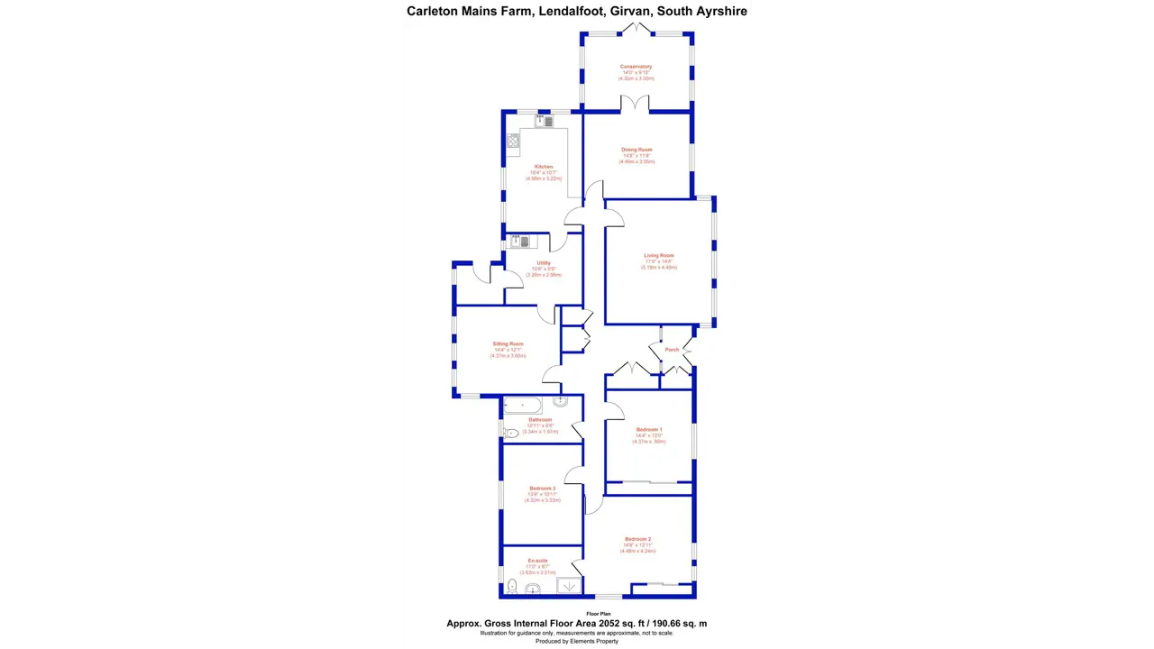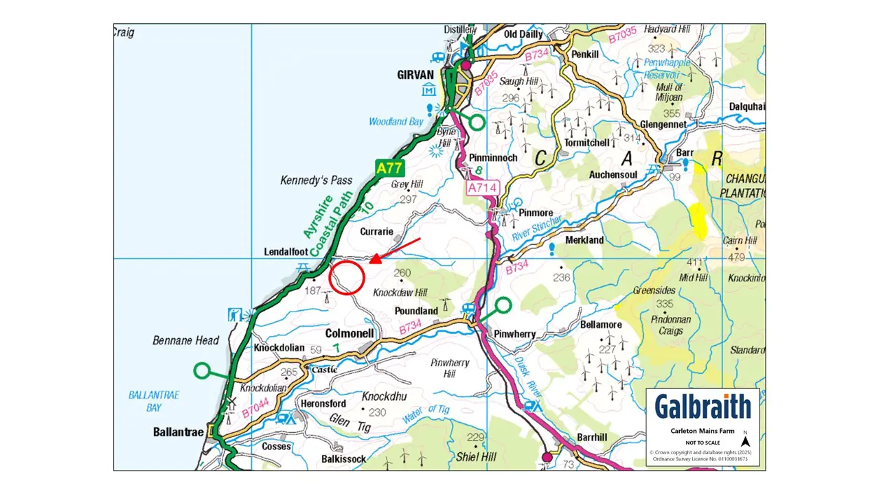 Carleton Mains Farm is a fine detached bungalow with grazing land and buildings overlooking the Mull of Kintyre with stunning sea views across Ailsa Craig, Kyles of Bute, and Ireland.The coastal town of Girvan lies about 6 miles to the north east, lying south of Ayr between the Galloway Hills and the sea and was originally a popular fishing port. The harbour, built within the mouth of the Water of Girvan, offers one of the few safe havens along the coastline, and remains active to this day. The town has a good range of local shops, supermarkets, recreational and professional services and has a local primary and secondary school. There is also a medical centre.The main county town of Ayr (about 28 miles) offers a wider variety of shopping, restaurants and sports activities. Private schooling is available at Wellington School and offers exceptional all-round education from nursery to senior school.The Ayrshire coast is famous worldwide for golfing with championship courses at Turnberry (12 miles) , Prestwick and Troon. There is also excellent sailing along the Firth of Clyde and the River Stinchar River offers salmon and sea trout fishing.Carleton Mains Farm provides a rare opportunity for a purchaser seeking an idyllic private rural location in an elevated setting with superb views across the Mull of Kintyre and beyond.The bungalow was built around 26 years ago on a single storey, with a tiled roof and render finish offering well-presented and spacious accommodation. Entering from the porch, this leads to the kitchen with fitted floor and wall units, single sink, integrated double oven and separate LPG 5 ring hob, with space for fridge freezer and dishwasher. There is a cosy sitting room with electric fire surround on a marble hearth, generous living room with bay window and spectacular views over the rolling Ayrshire farmland towards Ailsa Craig, dining room and conservatory with French doors to gravelled seating area, three bedrooms (master bedroom with en suite shower room) and family bathroom. There is a useful utility room with plumbing for washing machine and tumble dryer. The room layout and dimensions are laid out in more detail in the floor plans.Situated in a private and secluded setting, the drive leads to a large south facing courtyard. Carleton Mains Farm is complemented by useful outbuildings and there is a well maintained lawned garden with a shelterbelt of trees.OUTBUILDINGSThere are useful farm buildings forming a fine south facing courtyard:Barn: 7m x 18mStone construction under fibre cement roof, sliding door.Garage: 5.58m x 4.86mStone under fibre cement roof, power, electric up and over door.Store: 5.15m x 3.58m and 3.79m x 5.12mStone under fibre cement roof.Byre: 6.635m x 28.08m and 6.67m x 9.49mStone and brick with bays, fibre cement roof, water supply.Lean To: 3.31m x 16.41mWooden frame construction with tin cladding under fibre cement roof, earth and cobbled stone surface.General Purpose Shed: 10.58m x 26.43mSteel portal frame construction, breeze block walls, Yorkshire boarding, concrete floor under a fibre cement roof with power.The detached stone barn has the potential to convert into further living accommodation subject to the necessary planning consents.LANDThere are two grazing paddocks extending to about 4.65 Ac in total. The paddock lying west, has access to a burn. The land is principally classified Grade 3(2) and 4(2) by the James Hutton Institute.ACCESSThere is a right of access in favour of a neighbouring farmer over the drive between points A to B on the plan.DIRECTIONSFrom Ayr travel south on the A77 towards Girvan and continue through the town. At Shallochpark roundabout turn right towards Stranraer and continue for about 5.5 miles to Lendalfoot. At Lendalfoot, take the second road on the left hand side (signed Whithorn Way) and continue up the hill for about third of a mile and turn left onto the track for Castle Mains Farm (opposite the white cottage). Proceed up the drive to the farm. KA26 0JLWHAT3WORDSTo find this property location to within 3 metres, download and use What3Words and enter the following 3 words: https://w3w.co/fleet.fines.extension