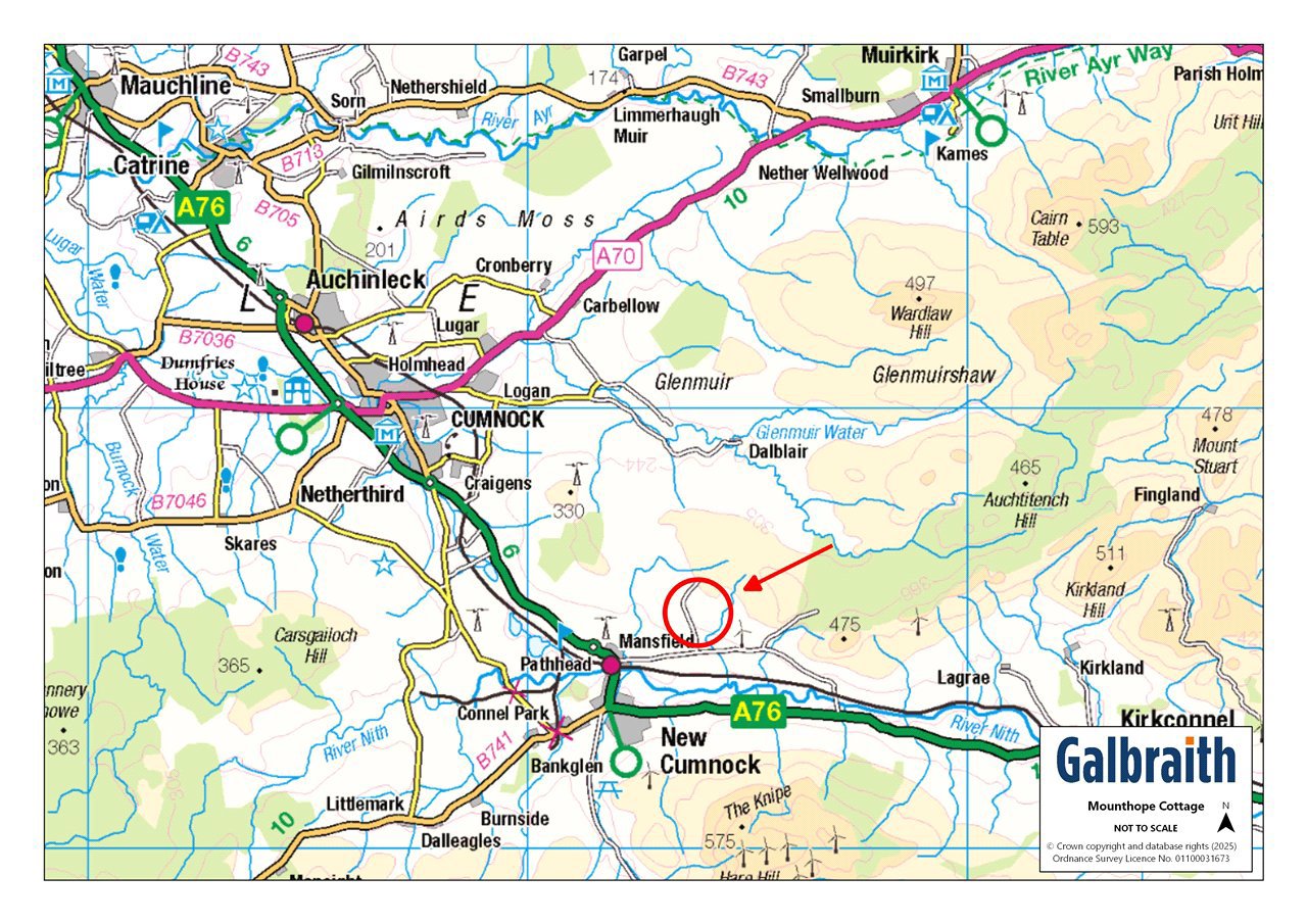 Mounthope Cottage sits in an elevated position by New Cumnock. New Cumnock (about 2 miles) has a range of local shops and services, nursery, primary schooling and a health centre. Cumnock which has a wider range of facilities and the county town of Ayr is about 22 miles to the west offering excellent amenities including a good private school. The Barony Campus in Cumnock (about 8 miles) has primary schooling, supported learning centre and secondary schooling, medical practice and local shops. The New Cumnock outdoor swimming pool (The Tamar Manoukian Pool) is open for the community to enjoy.There are excellent transport links in the area with a regular train service to Glasgow from New Cumnock and Ayr (22 miles), Glasgow Prestwick Airport is about 26 miles away with regular scheduled flights and Glasgow International Airport is approximately 48 miles.Ayrshire is renowned for its many golf courses, including the world-famous courses at Royal Troon and Turnberry. There is the popular Racecourse in Ayr and excellent yachting facilities at the Marina in Troon. The enchanting Dumfries House Estate (about 9 miles) is one of Britain’s most beautiful stately homes with an outstanding collection of 18th century furniture, beautiful walled gardens, pleasant walks and a coffee house. Auchinleck Estate (12 miles) has a popular coffee shop (Boswell’s Coach House) within the Estate grounds, along with enjoyable riverside walks.The New Cumnock Access Network Paths has developed some interesting local walks in the area including the Knockshinnoch Lagoons which goes round a 130 hectare Scottish Wildlife Trust reserve, Burns Cairn and Glen Afton. Blackcraig Hill, is one of Ayrshire’s highest hills at 2,296 feet above sea level, along with three neighbouring hills all over 2,000 feet which can also be climbed. The views down the glen from Blackcraig Hill are particularly stunning on a clear day.Mounthope Cottage is a traditional stone and slate cottage which is currently not habitable. It requires extensive repair and upgrading, or alternatively, subject to the appropriate consents being obtained, demolition and rebuilding. The flat roof extension has been badly damaged in a recent storm. The cottage was originally the Factor’s cottage for Mansfield Estate and it has been in our client’s ownership for some 57 years.Its present accommodation includes entrance porch, kitchen, sitting room, living room, bathroom and store room on the ground floor with stairs to two attic coombed rooms. Externally there is a boiler house.The grounds total about 0.42 acres in all bounded by a stone wall to the east. There is off road parking.BuildingsShed: About 6.25m x 5.77m and 9.52m x 6.10mCorrugated frame with inspection pit.AccessThe road leading from Mansfield Road is the responsibility of all residents.Directions From the A76 just North of New Cumnock at Pathhead, continue straight on to Mansfield Road. Continue along this road for about 0.8 miles and turn left at the sign for Hall of Mansfield. Continue straight ahead for about 0.5 mile and Mounthope Cottage is on your right hand side.What3Words: scrolled.flops.fries Postcode: KA18 4NTNote There is a proposed development at Blackwood Farm, New Cumnock to include seven wind turbines reaching up to 200 metres in height, alongside a Battery Energy Storage System (BESS) and a single substation.Viewings Strictly by appointment with the Selling Agents.