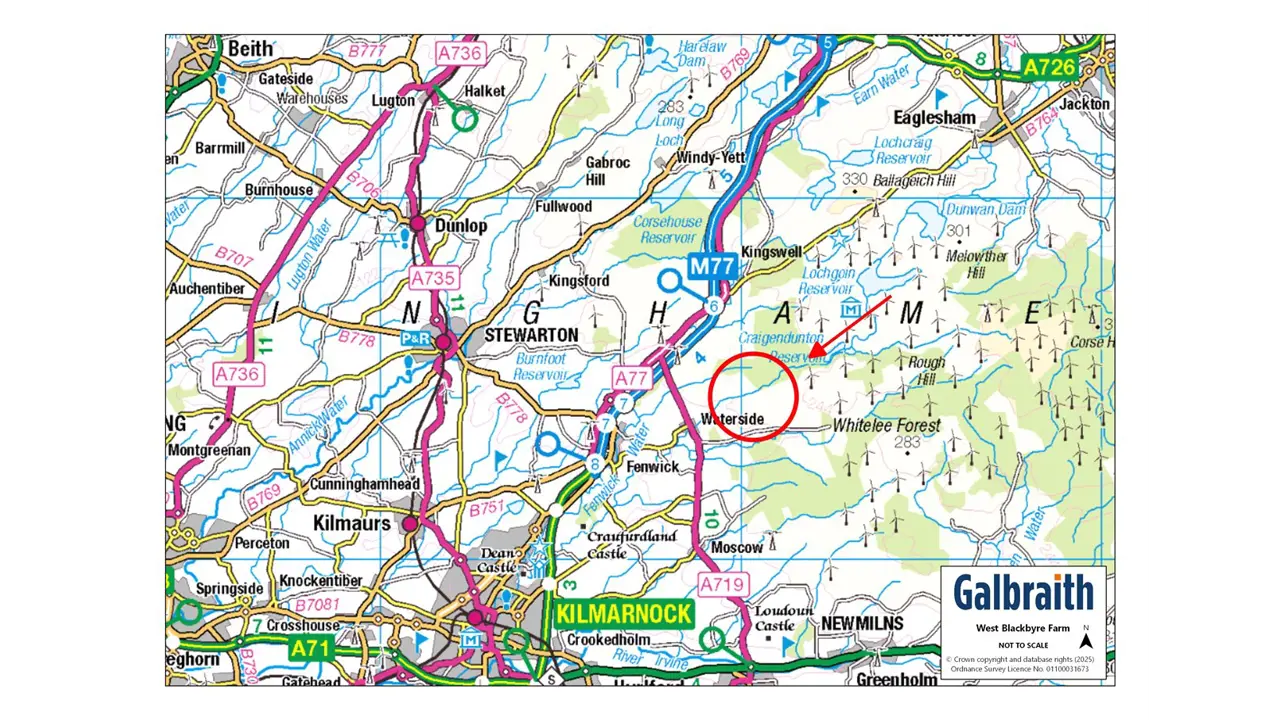 West Blackbyre is located close to the small rural village of Waterside, approximately 5 miles north of Galston. The village lies on the Craufurdland water which meanders through the north of the farm and historically provided employment to the area when it powered a local carding mill. An OS map of 1856 shows that whin stone and sandstone quarries were located downstream of the mill. Despite its rural location, Waterside is a popular base for commuters to Glasgow and offers access to the city centre via the M77. Nearby Galston offers a variety of local amenities including a doctor’s surgery, chemist, supermarket and both primary and secondary schooling. Private schooling is available at Belmont House, Hutchesons’ in Glasgow and Wellington in Ayr. A wider range of high street shops are available in Kilmarnock (6 miles) and Silverburn Shopping Centre, with over 100 shops, restaurants and cinema is just 13 miles away. The farm is situated in an area suited to dairy, beef and other mixed farming enterprises and is well served by the agricultural supply industry with Ayr Market 20 miles to the south.West Blackbyre presents an excellent opportunity to acquire a compact farming unit in rural East Ayrshire. The farm comprises a versatile livestock unit, equipped with a spacious attractive five bed farmhouse, a range of modern and traditional farm buildings and farmland which extends to approximately 68.22 Ha (168.58 Ac) in total including roads, yards and buildings. West Blackbyre has been in the seller’s ownership for a number of years and the current farming enterprise is centred around sheep with the land in a grassland rotation providing feed and forage for the farm business.METHOD OF SALEThe sale of West Blackbyre Farm offers purchasers an opportunity to acquire the farm either as a whole or in two lots:Lot 1: West Blackbyre Farmhouse, farm buildings and 30.95 Ha (76.48 Ac) of landLot 2: 35.65 Ha (88.09 Ac) of landPlease note that Lot 1 will not be sold prior to Lot 2.LOT 1West Blackbyre FarmhouseWest Blackbyre Farmhouse is of traditional stone construction with a harled and painted white finish set under a pitched slate roof. The substantial farmhouse comprises adaptable accommodation with the welcoming porch/sunroom giving access to the hall. The living room has a wood burning stove set in an attractive white surround and two arched wall alcoves. There is a superb open plan sitting room with wood burning stove opening to the dining kitchen with modern units, central island and AGA. From the kitchen there is a storage room, utility room and shower room. There is one ground floor bedroom with en suite shower room and completing the downstairs is a cloakroom/w.c. Stairs from the hall rise to three generously proportioned bedrooms and a stunning bathroom with claw-foot bath and separate shower cubicle. A second staircase off the kitchen gives access to one bedroom and an open seating area and office.Farm BuildingsSituated to either side of the farmhouse, the traditional range is constructed of harled stone under pitched corrugated and slate roofs with concrete floors comprising:• Former byre (13.62m x 4.85m)• Workshop (5.41m x 2.52m)• Store (5.61m x 10.58m)• Detached former garage/log storeModern RangeCattle Court (23.86m x 15.06m) - a four bay steel portal frame construction under a corrugated metal roof with brick walls and a combination of slats and concrete floor. Central feed passage and part self-locking yokes on feed barriers.Hayshed (24.63m x 6.92m) - a traditional six bay of steel portal frame construction, tin cladding set under a fibre cement roof with concrete floor.Lean-to Cattle Court (17.31m x 5.73m) of steel portal frame construction with corrugated roof, earth floor and metal feed barrier.Silage Clamp (27.5m x 5.89m) - brick and concrete panel walls with asphalt floor and effluent tank with capacity for 5,000 gallons.Redundant Slurry Store – ‘Howard Harvestore’ - Three ring store with capacity for 130,000 gallons.The LandThe land contained within Lot 1 extends to approximately 30.95 Ha (76.48 Ac) and is mostly of a ploughable nature but is currently down to grass and is used for sheep grazing and fodder production. The land is contained within one block, split across 9 field parcels, with an area of glen along the Craufurdland water. The land has been classified as predominantly Grade 4 with sections of Grade 5(1) and Grade 5(3) by the James Hutton Institute. The fields are well laid out and of a generous size, easily accommodating modern machinery, and benefit from access either internal tracks or directly from the farm steading. The land rises from 148m above sea level at its lowest point to 172m at its highest point.LOT 2The land at Lot 2 extends to approximately 35.65 Ha (88.09 Ac). The land is contained within one block, split into 7 field parcels and is situated to the east of Lot 1. The land has been classified as predominantly Grade 4 with sections of Grade 5(1) and Grade 5(3) by the James Hutton Institute. The farmland predominantly is ploughable but is currently down to grass and used for sheep grazing and fodder production. There is an area of glen along the Craufurdland water and the land rises from 168m above sea level at its lowest point to 202m at its highest point.NITRATE VULNERABLE ZONE (NVZ)West Blackbyre Farm is not included within a Nitrate Vulnerable Zone.IACS / BASIC PAYMENT SCHEME (BPS) 2025All the farmland is registered for IACS purposes. Any payments relating to the 2025 scheme year will be retained by the Seller. If applicable, the Purchaser(s) will be responsible upon occupation of the subjects of sale to comply fully with the Statutory Management requirements to maintain the farmland in Good Agricultural and Environmental Condition (GAEC) as laid down under the Cross Compliance rules of the Basic Payment Scheme (BPS) for the remainder of the scheme year. The Seller may enter discussions with the Purchaser to transfer the right 