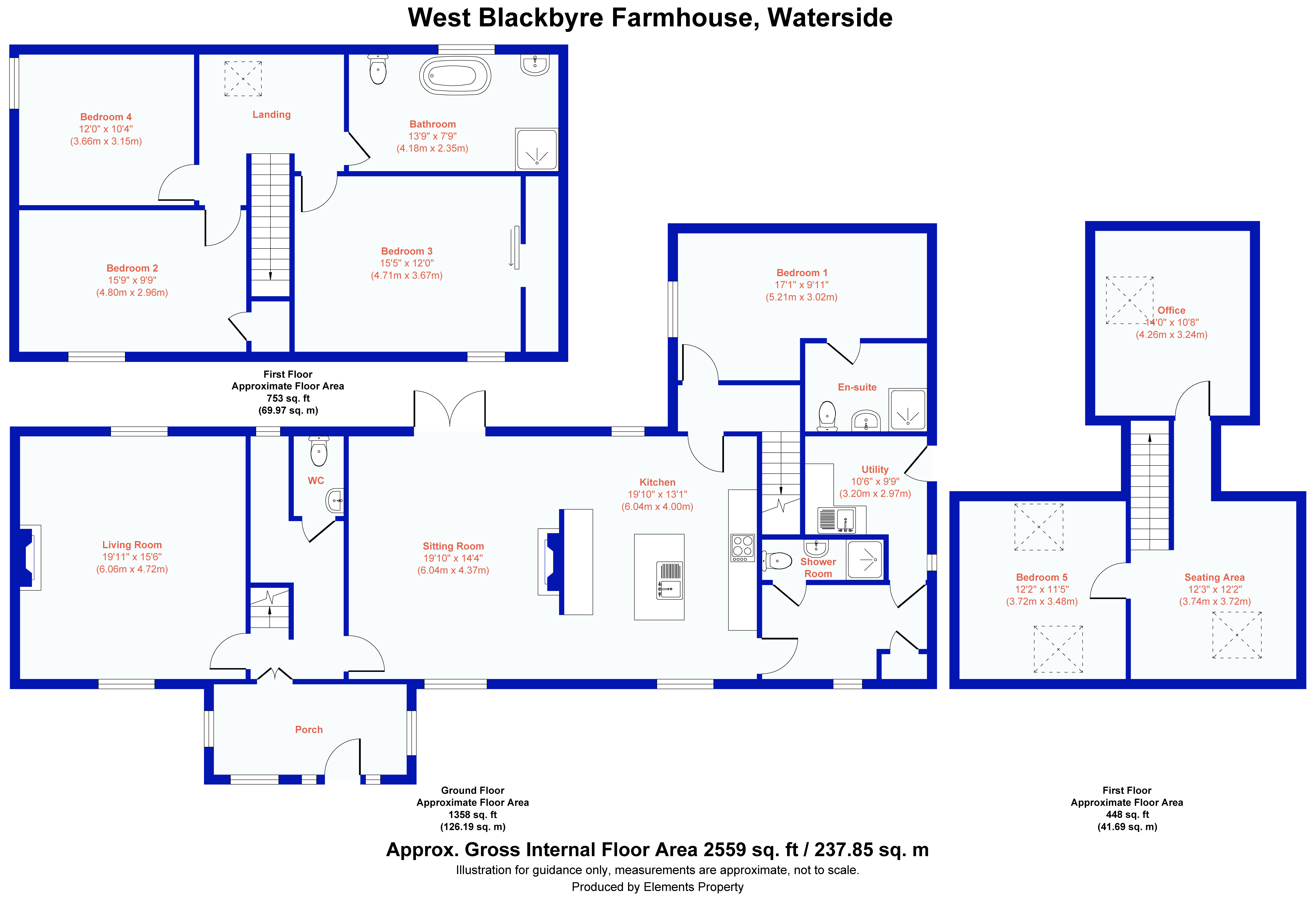 - Farmhouse (five bedrooms, three public rooms).