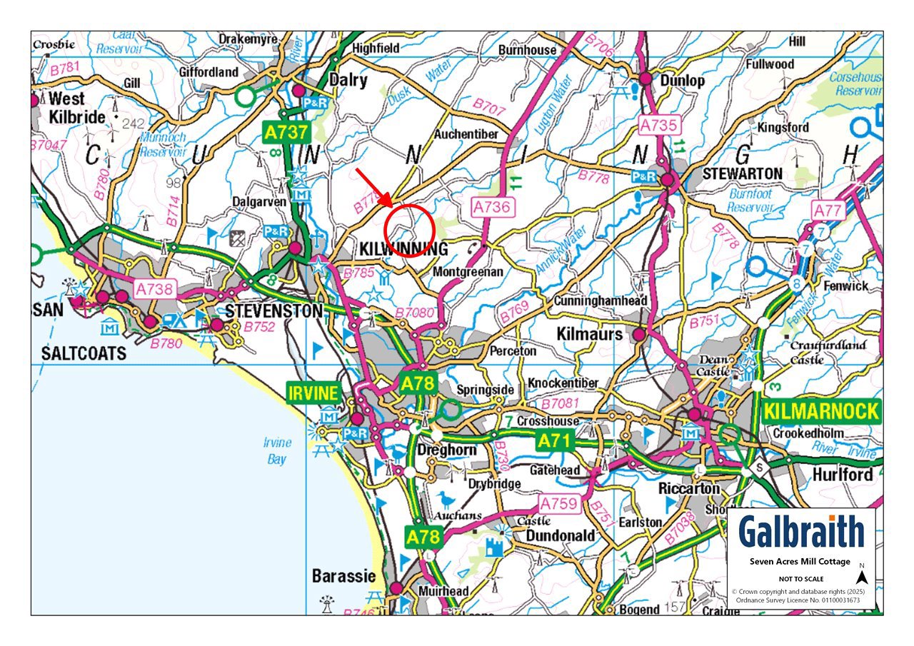 Seven Acres Mill Cottage is situated in a quiet, peaceful location on the banks of the meandering River Lugton in North Ayrshire yet well placed for commuting. It is some 24 miles from Glasgow, easily accessible by the A736 Glasgow Irvine Road. Kilwinning, about 2 miles distant is well serviced with a wide range of local shops and facilities including restaurants and coffee shops. Schooling is available at both Kilwinning and Irvine. Independent schooling is available at Wellington in Ayr and Hutchesons in Glasgow. The railway station in Kilwinning is on the main line between Ayr and Glasgow with regular services. Prestwick and Glasgow Airports are easily reachable being 14 and 19 miles distant respectively. Eglinton Country Park with delightful walking trails and bridleways and permit fishing is available at Eglinton Loch (freshwater loch) and the River Lugton. There are good equestrian facilities localling including Fergushill and Greenacres Riding Centres and Muirmill Equestrian Centre is about 12.5 miles distant. Ayrshire is renowned for its golf courses which include Royal Troon, Prestwick and Turnberry. Sailing is popular on the Firth of Clyde with yacht marinas at Troon, Largs and Inverkip. Ayrshire is known for its beautiful sandy beaches, Troon and Irvine have lovely sweeping sandy beaches with stunning views over the Isle of Arran. Seven Acres Mill Cottage is a charming one and a half storey country cottage full of character with versatile living space and low maintenance gardens. The rich history of the cottage enhances its appeal along with the modern day comforts making it a wonderful place for a tranquil rural lifestyle. The land at Seven Acres and the associated mill was owned and operated by the monks of Kilwinning Abbey until it passed into secular hands in the 16th century. Seven Acres Mill Cottage is thought to have been built sometime in the late 1700s to early 1800s to house the mill owners. The mill ceased production in 1960, and approximately 20 years ago Seven Acres Mill Cottage went through a significant renovation turning it into a private rural home steeped in local history.The accommodation comprises a large welcoming hallway with American hardwood flooring which is currently utilised as a dining room. The living room is a warm and welcoming space, filled with natural light from its dual-aspect windows. At its centre, a woodburning stove rests within the original stone surround, framed by a sandstone fireplace. A perfect spot to unwind as the fire crackles on quiet evenings. It’s a room that invites you to slow down, curl up, and feel at home. The living room then leads to the galley style dining kitchen which is fitted with a range of floor and wall mounted units, electric oven, hob and extractor fan, fridge/freezer, washing machine, dishwasher and a useful pantry. The exposed stonework wall adds a touch of rustic charm, echoing the home’s history and lending warmth and character to the space. The master bedroom (currently used as an office/music room) has laminate flooring and a recently installed en suite bathroom with wash hand basin set in vanity unit, bath and w.c. The shower room is fully tiled and flooded with light from the Velux window and a stained-glass effect window and comprises a shower with dual head, wash hand basin set in vanity unit, w.c. and heated towel rail. Stairs rise from the hall to three bedrooms each with bespoke built-in wardrobes. Externally, Seven Acres Mill Cottage benefits from a south-westerly facing terrace with wood store lean-to, perfectly positioned to enjoy the gentle murmur of the nearby River Lugton, a tranquil backdrop for outdoor living. An original mill stone is set in the ground and currently an impressive setting for the clothes drier. A substantial mono-block driveway provides private parking for multiple vehicles. The garden grounds lie predominantly to the front and sides of the cottage, where well-tended vegetable beds and mature apple trees, heavy with fruit, lend a charming and productive character to the landscape. In addition there are two original metal wheels from the mill positioned at the front of the property enhancing the character and charm of this lovely mill house.Metal Shed (About 1.3m x 2.3m)Provides outdoor storage space.