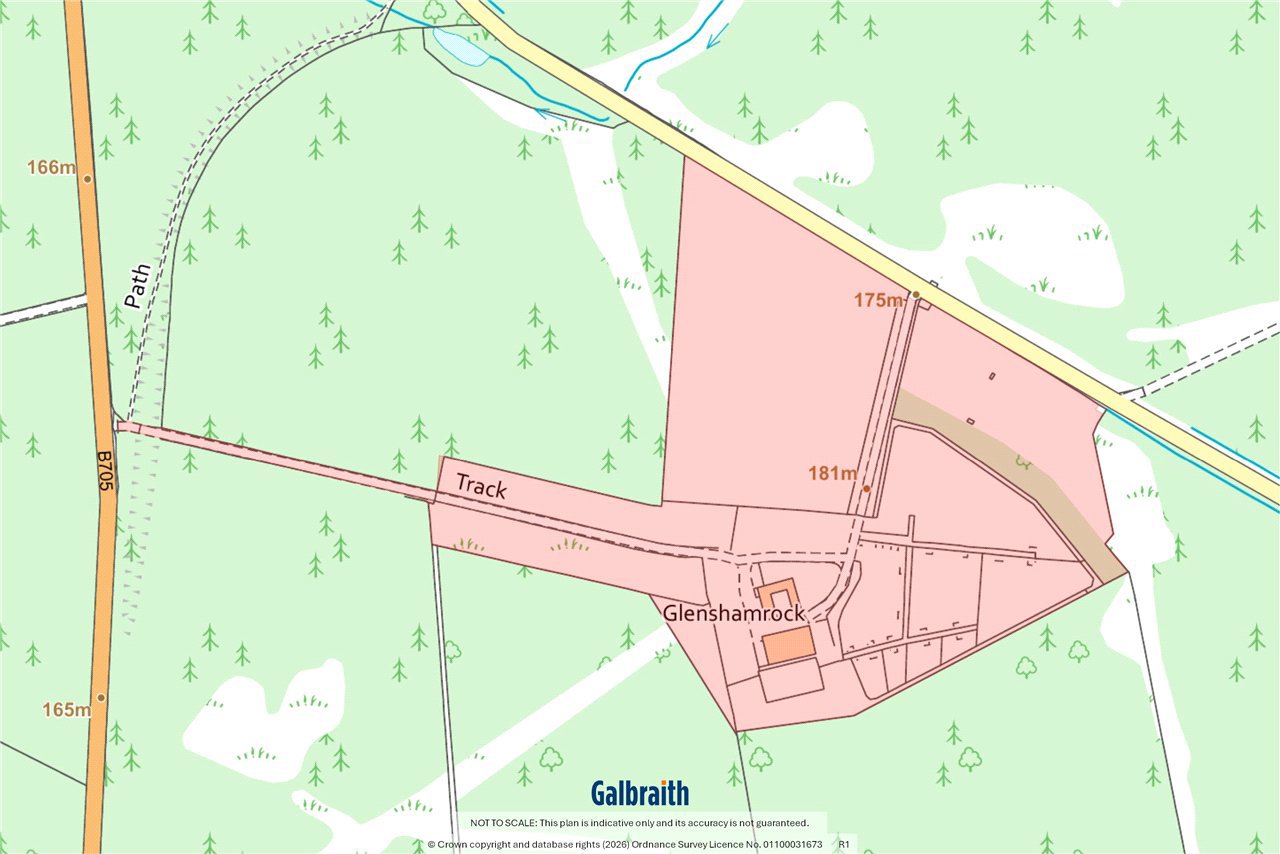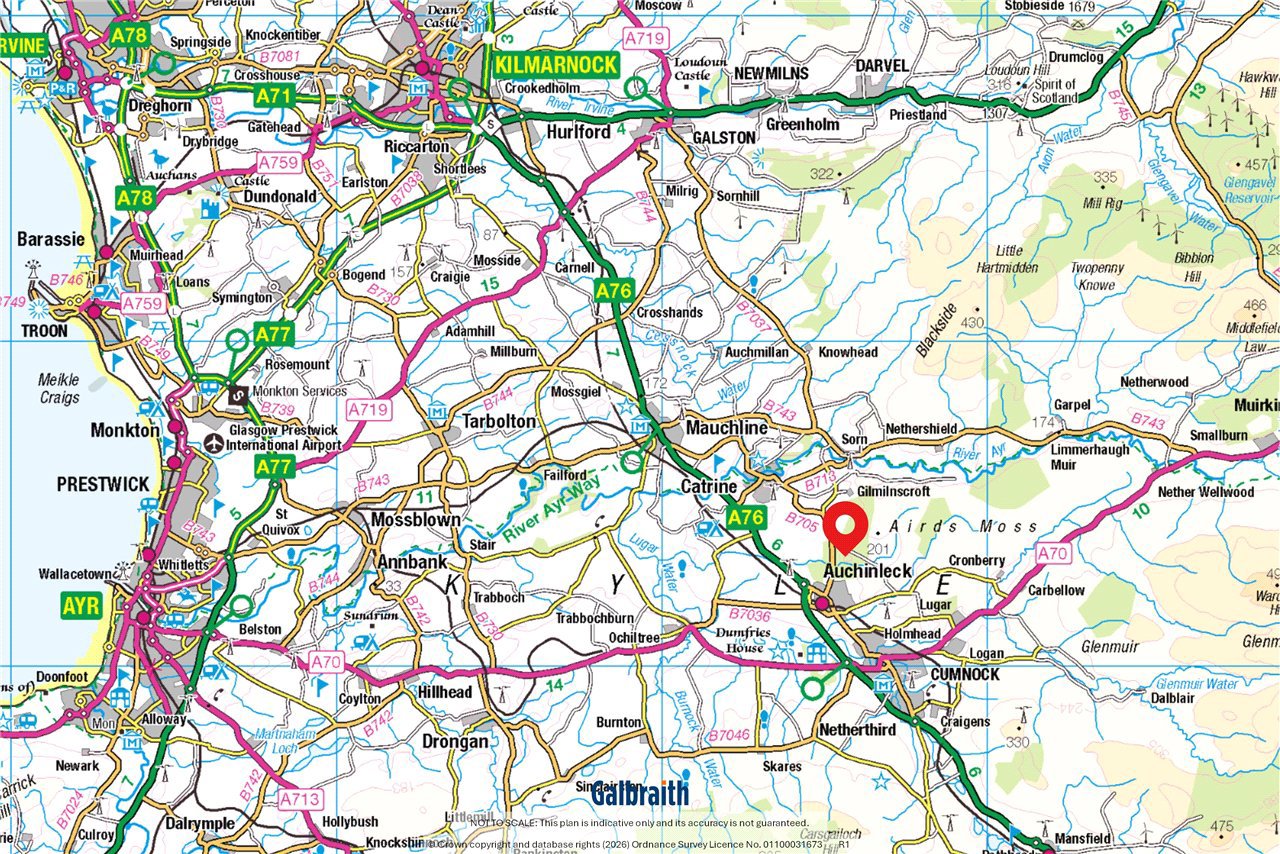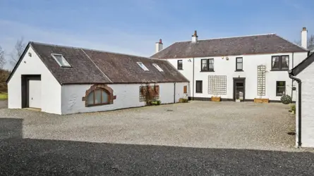 Glenshamrock is privately situated in a secluded location in scenic rural Ayrshire within a short distance of the local town of Auchinleck in East Ayrshire and within easy reach of Glasgow and the central belt. Auchinleck has a good range of local facilities which include supermarket, hotel, butchers and bakers. The popular and well regarded Lochside House Hotel and Spa is 7 miles distant. There is a railway station with connections to Glasgow, Kilmarnock and Ayr. The Barony Campus in Cumnock (about 3 miles) which opened in 2020 incorporates both primary and secondary schooling. It has a modern sports centre and outdoor facilities providing enhanced leisure and recreational facilities to the local community. There is a private school, Wellington in the county town of Ayr (about 15 miles). Ayr has a variety of excellent shops and supermarkets, out of town retail park, leisure facilities including theatre and cinema along with a stunning long sandy beach. There are many riding and walking opportunities to be found in the local area including the Lugar Water walk, a scenic waterside pathway from Ochiltree to Auchinleck passing through Dumfries House Estate.Auchinleck Estate is nearby and there is a popular coffee and gift shop (Boswell’s Coach House) within the estate grounds along with enjoyable riverside walks. Auchinleck Mansion House, was built by Lord Auchinleck, James Boswell in the late 1700s. Dumfries House Estate also close by is arguably one of Britain’s most beautiful stately homes with an outstanding collection of 18th century furniture, walled garden and coffee house.Glenshamrock Farm is a most attractive substantial farmhouse constructed in the nineteenth century of stone over two storeys under a pitched slate roof. It is approached from a minor public road to its own private drive to the u-shaped gravelled courtyard with extensive parking area. The house has been extended and features luxurious and spacious living accommodation including an annex in one wing which is ideal for multi-generational living or guest accommodation whilst the other wing of the house contains a workshop and garages with an electric door in the gable end. There is a useful range of outbuildings including the first-class equestrian facilities, riding arena and grazing land extending to approximately 19.52 acres. The property is surrounded by mature coniferous woodland (in other ownership) affording Glenshamrock complete privacy. The bright and spacious accommodation has been beautifully upgraded recently to include an impressive new fitted kitchen with floor and wall mounted units, large central island, oil fired Aga and integrated dishwasher, fridge/freezer and electric oven, the vaulted beamed ceiling has Velux skylights and patio door opening directly onto the terrace, herringbone flooring, one exposed stone wall with gas stove (not connected) adding character and charm to this large family/entertaining space. A passageway from the kitchen leads to the cosy snug, a shower room with large walk-in shower, beautifully appointed living room with wood burning stove, set in exposed brick fireplace and French doors leading to the garden. From the living room there is access to a sitting room/gym which has direct access to the garden. There is a useful laundry room with fitted units and a sink. Stairs rise to the first floor where there are five double bedrooms and a bathroom which also leads to the master bedroom. The attached annex is off the entrance hall and comprises a living room overlooking the patio through full height windows. It has bespoke built-in book shelving and a spiral staircase with frameless glass balustrade to a gallery which could be used as an office/reading area or sleeping platform. There is a generous double sized bedroom and en suite shower room with walk-in shower and fitted bathroom furniture. The other wing of the house houses the workshop, store room and garage with electric roller door, power and light. This space could also be developed (subject to necessary planning consents).The garden is mainly laid to lawn bounded by hedging and there is a large flagged patio with summer flower beds. To the rear of the house the gravelled courtyard provides parking for several vehicles.OUTBUILDINGSStable Block: About 21m x 10mConcrete frame, profile sheeting roof with concrete floor, sliding door entrance. 6 bespoke built stables and a wash bay and hot water shower (plumbed for water feeders). Multiple power and light.Shed: About 22m x 17mOpen fronted shed, brick, timber, corrugated iron and concrete floor. Sliding door through to stables. Multiple power sockets and light.Hay Shed: About 5.5m x 16.5mSteel, timber and corrugated iron. Multiple power sockets and overhead lighting. .There is about 19.52 acres of grazing land, and several weight-management paddocks, and grazing paddocks for horses with granite dusk tracks and post and rail fencing. The land is principally classified as Grade 4(1) by the James Hutton Institute. There is a pretty area known as ‘the Grove’ at the rear of the property, planted with trees and during the summer months a pathway is cut away and can be used for walking and exercising the animals.Arena: About 25m x 45mAn all-weather silica and sand floodlit riding arena.