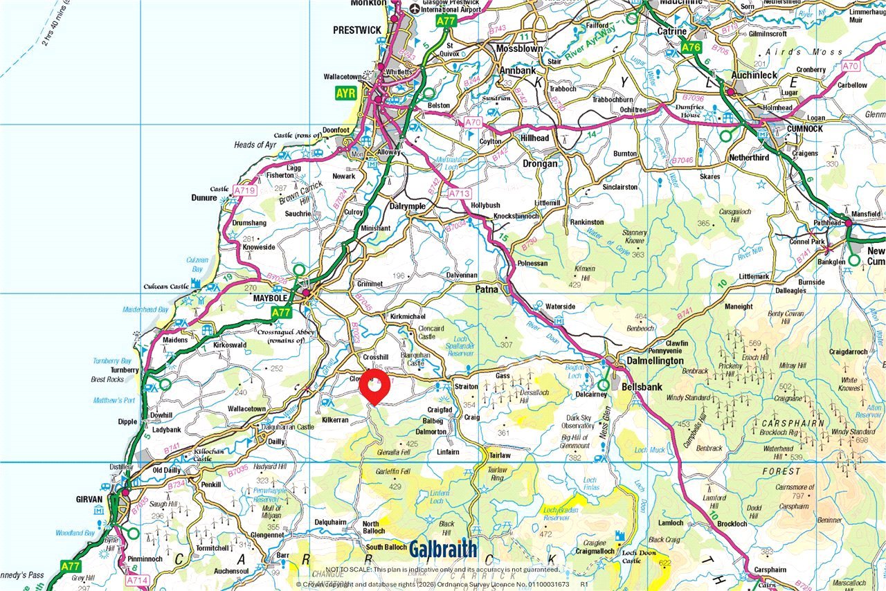 Shawsknowe enjoys an unrivalled secluded and scenic situation in the South Ayrshire hills. The village of Crosshill is about 2.8 miles with primary schooling, post office, bowling club with Dalduff Farm country farm shop being a short distance away. The attractive conservation village of Straiton (about 3 miles) with Bennan Hill forming a stunning backdrop to the village also has local amenities including café and community shop, a play park and a well-regarded primary school.The County Town of Ayr (about 13 miles) has an excellent range of shops, leisure and sports facilities and art galleries. There is secondary schooling in Maybole whilst the nearest independent school is Wellington, Ayr. The railway station in Maybole provides regular services to Glasgow and Stranraer. Glasgow is within easy reach via the newly improved Maybole bypass and Glasgow Prestwick Airport (20 miles) offers regular international flights.There are excellent country walks and cycling paths around Crosshill including the Barony Hill walk and Maxwellston Hill, Dailly. The Changue Forest Trail (10 miles) is one of the many designated cycling and walking routes in the area. For horse riding the many forest trails provide miles of quiet off road hacking in stunning upland landscapes. Bargany Gardens (8 miles) is open during May. Culzean Castle & Country Park (10 miles) is home to the cliff-top castle, woodland walks, swan lake, play parks, gift and coffee shop. There are several lovely walks at Straiton (5 miles) with Lady Hunter Blair’s Walk (a beautiful wooded glen and waterfall), outdoor pursuits and livery is available at Craigengillan Estate (13 miles). It is also part of the Galloway and South Ayrshire UNESCO Biosphere covering 9,800 square kilometres of south-west Scotland. Outwith the Dark Sky Park, a Transition Zone has been identified with a radius of 10 miles from the Park’s boundary, Shawsknowe lies within this zone. This transition zone is advisory and intended to protect the dark skies night environment within the Dark Sky Park from light pollution emanating from this Zone. The River Stinchar is an excellent productive salmon river and is renowned for its autumn run. To the west, is Turnberry, with world class golfing facilities, luxury hotel and spa.Shawsknowe is offered for sale as a whole or in 2 lots.Please note that Lot 2 will not be sold prior to the sale of Lot 1.Lot 2 about 51.15 acresThe land at Lot 2 extends to approximately 20.70 Ha (51.15 Ac). The land is contained within one block, split into 7 field parcels with stockproof fences and dykes and is currently down to grass and used for grazing purposes. The land is classified as predominantly Grade 4(2) with some 4(1) by the James Hutton Institute and serviced by a natural water supply. The land rises from approximately 176m to 222m above sea level at its highest point.AccessIf Lot 2 is sold separately, a Right of Access will be granted over Point A on the plan. There is a Right of Access over Point B on the plan.Planning NoteProspective purchasers should note Planning Permission is being applied for on a wind farm development at Back Fell Wind Farm Straiton to erect 14 wind turbines reaching up to 200 metres in height, alongside a Battery Energy Storage System (BESS). Planning Ref: 25/00334/DEEM, 5 February 2026. Buyers are advised to consult South Ayrshire Council planning department directly.DirectionsFrom Ayr, take the A77 south towards Maybole. After Minishant, turn left onto the B7045 then turn right onto an unnamed road signed for the Walled Garden then turn left at the junction onto the B7023. Continue through Crosshill onto Dalhowan Street and at the junction go straight ahead. Continue for about 1.5 miles and the property is then on your left hand side. Proceed through the gates and up the drive to Shawsknowe.//w3w.co/steepest.confined.cringe Shawsknowe, Maybole, South Ayrshire Post Code: KA19 7QG