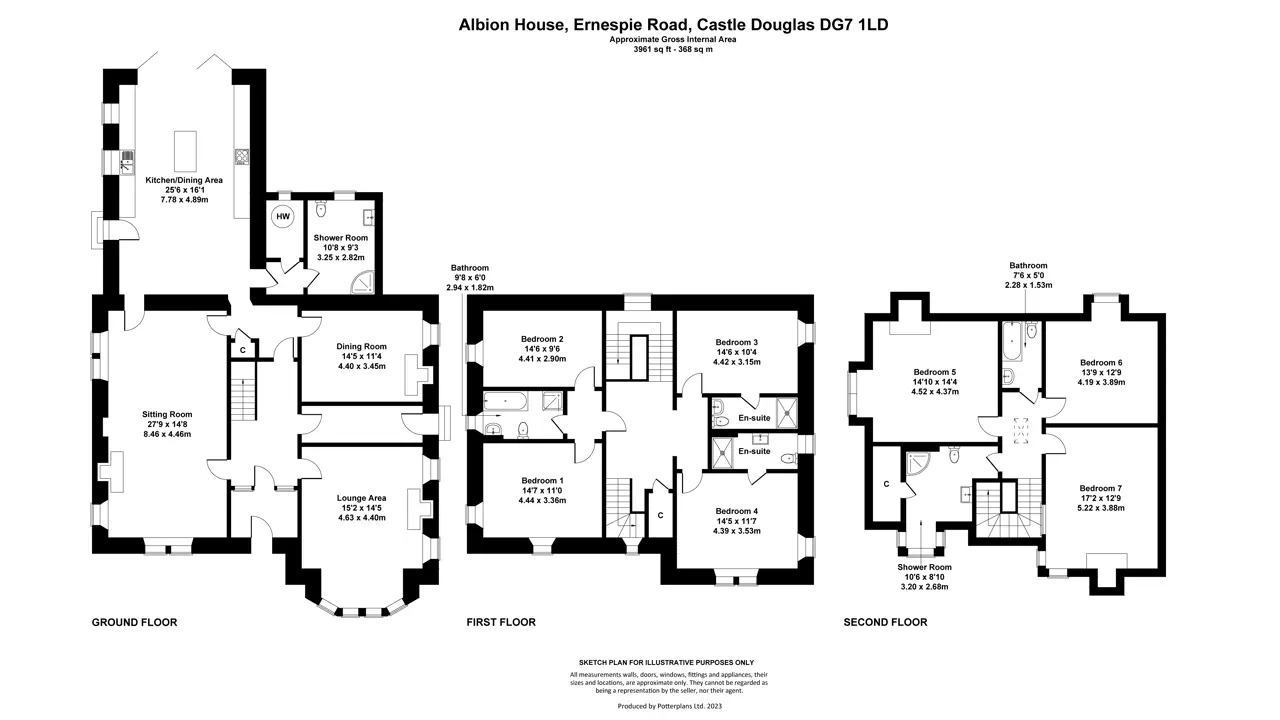 SITUATION Albion House sits on Ernespie Road, the last in a tree-lined street of elegant villas. Castle Douglas is a bustling market town, designated as Dumfries and Galloway’s Food Town due to the number of independent food and drink producers in the area. A popular tourist destination, the town has two supermarkets, a renowned livestock market, modern health centre, primary and secondary schools. There is a vibrant main street, King Street, which is home to numerous independent retailers including award winning butcher shops, gift shops and furnishings stores. Numerous cafes, restaurants and bars provide refreshment. There are regular farmer’s markets, an annual agricultural show, The Stewartry Show, and various civic events throughout the year.Dumfries is the regional capital and provides further amenities including a major hospital, university campuses, and retail parks. There are mainline train stations in both Dumfries and Lockerbie connecting north and south. Glasgow and Edinburgh airports are reachable in around 2 hours by car. There are also regular bus services to and from Dumfries, with a stop just outside the grounds of Albion House. The region is known for its outdoor pursuits including country sports, hillwalking, equestrian and mountain biking on the Seven Stanes trails throughout the region’s many forests.DESCRIPTION Albion House is one of the largest houses in Castle Douglas. With accommodation over 3 floors, the house is ideal for family life, including multi-generational living. The current owners have reconfigured the ground floor space to provide a large modern open plan kitchen and dining area which leads out through large sliding glass patio doors to the wraparound raised terrace, which has glass balustrading and is the perfect place for summer parties to spill out to enjoy the sunshine. Generous reception rooms give plenty of scope for both formal and informal entertaining. Seven bedrooms over the first and second floors mean there is no shortage of space for a large family plus overnight guests. The current owners run Albion House as a successful holiday let. Two boilers run the gas central heating, one on the ground floor and one on the second floor.Outside is a very large garden, with a brick built outbuilding which could perhaps be converted to extra accommodation subject to obtaining all necessary consents. There are two entrances to the property, and the east gate lends itself perfectly to the potential building plot. The current owners have taken pre-planning advice from Dumfries & Galloway Council which indicates that they would consider permission for a single dwelling house, subject to the normal planning application process.ACCOMMODATION Ground Floor: Entrance Vestibule. Hallway. Sitting Room. Living Room. Dining Room (currently used as a playroom). Dining Kitchen. Utility Room. Cloakroom WC.First Floor: 2 En Suite Bedrooms. 2 Further Bedrooms. Family Bathroom. Second Floor: 3 Bedrooms. 2 BathroomsGARDEN AND GROUNDSStone gate piers and double wrought iron gates lead from Ernespie Road to a generous gravel sweep to the front and side of the house. The front area is bound by hedging, giving privacy from the road. To the rear and eastern side, the garden is mainly laid to lawn, with a number of mature trees and shrubs. A brick outbuilding provides useful storage and has conversion potential for either residential or workspace use. Two garden sheds sit beyond this. A second entrance at the eastern end of the grounds leads in to the area designated as a potential building plot.