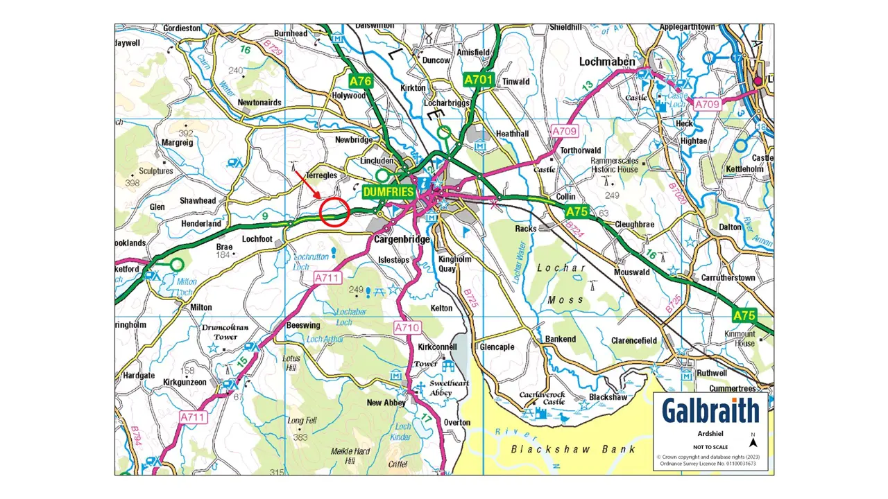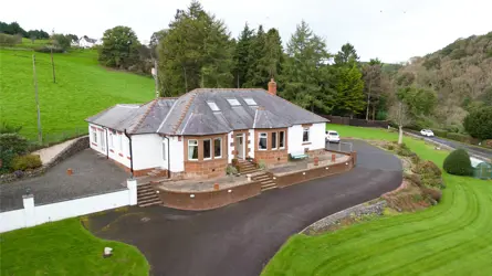 SITUATION Sitting to the west of Dumfries in a delightful rural location, Ardshiel is approximately 3.8 miles from the centre of Dumfries and just a short distance to the Dumfries & Galloway Royal Infirmary. The property benefits from a stunning elevated rural location with far reaching countryside panorama, yet just a short distance to the town itself. Kilnford Farm & Coffee Shop is also just a short distance from the property. Dumfries is the regional capital with an extensive range of amenities typical of a town of this size including high street shops, retail parks, supermarkets, primary and secondary schools, parks and leisure facilities, golf clubs, cricket club, rugby club, and the famous Queen of the South football club. The Crichton Campus is home to Dumfries & Galloway College, and the southern campuses of the University of Glasgow and the University of the West of Scotland. Dumfries railway station connects with Glasgow, Edinburgh and Carlisle. There is a mainline station at Lockerbie, around 16.6 miles with connections to Glasgow, Edinburgh, Newcastle, Manchester, Birmingham and London. Domestic and international flights are available from Edinburgh and Glasgow airports, both around 86 & 80 miles distant.DESCRIPTION Originally constructed in the 1940s Ardshiel occupies a stunning, elevated edge of town site with uninterrupted far reaching views to the North. The property was purchased by the current owners in 1992 and has since been extended, around 2002/2003 both to the first floor. Also to the ground floor with a wet room addition together with the impressive sun room to the rear, taking full advantage of the southerly aspect. Ardshiel offers an exceptional home in a desirable “best of both location” with a very much rural feel, yet a short distance from all the key amenities provided by Dumfries. The property itself offers a fine balance of bedroom and reception/entertaining space ideal for family living but could easily be adapted to suit the buyer’s individual needs. The majority of the accommodation space sits on the ground level with two of the principal reception rooms to the front of the property enjoying stunning far reaching views. To the rear is the delightful Garden Room, added in 2002 this provides an extensive space to relax or a space that could be ‘sub divided’ to serve multiple uses to a family. The kitchen/breakfast room has a range of fitted floor and wall units with electric hob and overhead extractor, ample space for a table and chairs from which you can enjoy the views. Continuing from the kitchen is the Utility Room, space for washing machine, fridge freezer and also houses the boiler and sliding door to access the W.C. The ground floor benefits from 3 bedrooms one with en suite wet room (this was added by the current owners), one bedroom offers extensive fitted wardrobe space, the other connects to the Garden Room to the rear – this could also be adapted to provide an office or hobby room. A central staircase provides access to the first floor with space for working from home. The first floor provides 2 bedrooms and a central shower room with large store room. Each room provides a bright space with Velux roof lights. Externally the property sits within beautiful grounds and has an impressive large outbuilding with adjoining store & w.c with electric doors and fully serviced with potential to adapt subject to releavnt consents) A number of further outbuildings including coal store, log store and garden tool storage space. A unique opportunity to acquire a stunning property in an appealing edge of town location with many desirable attributes. (Photos completed summer 2023) ACCOMMODATION Ground Floor: Entrance Porch. Hallway. Living Room. Kitchen/Breakfast Room. Utility Room. Bedroom. Bathroom. Dining Room. Office/Bedroom. Bedroom En Suite wet room. Garden Room. First Floor:Bedroom. Shower Room. Bedroom. GARDEN (AND GROUNDS) Beautifully presented gardens surround the beautiful Ardshiel. The driveway leads initially to access the Double Garage but continues to the front of the property and to the side and rear where there is ample parking for numerous vehicles. The grounds were extended with the purchase of an additional piece of ground (2002) to the side of Ardshiel by the current owners (on a separate title). The site extends to about 1.28 acres in all currently laid to lawn primarily with some mature planted shrubs beds which soften the landscape beautifully and larger mature trees which provide further privacy to the site. To the rear a south/west facing patio can be accessed directly from the sun room, a beautiful area to relax or socialise with friends and family. The new buyer, should they wish, may pursue the opportunity to develop the adjoining site subject to local planning consents.