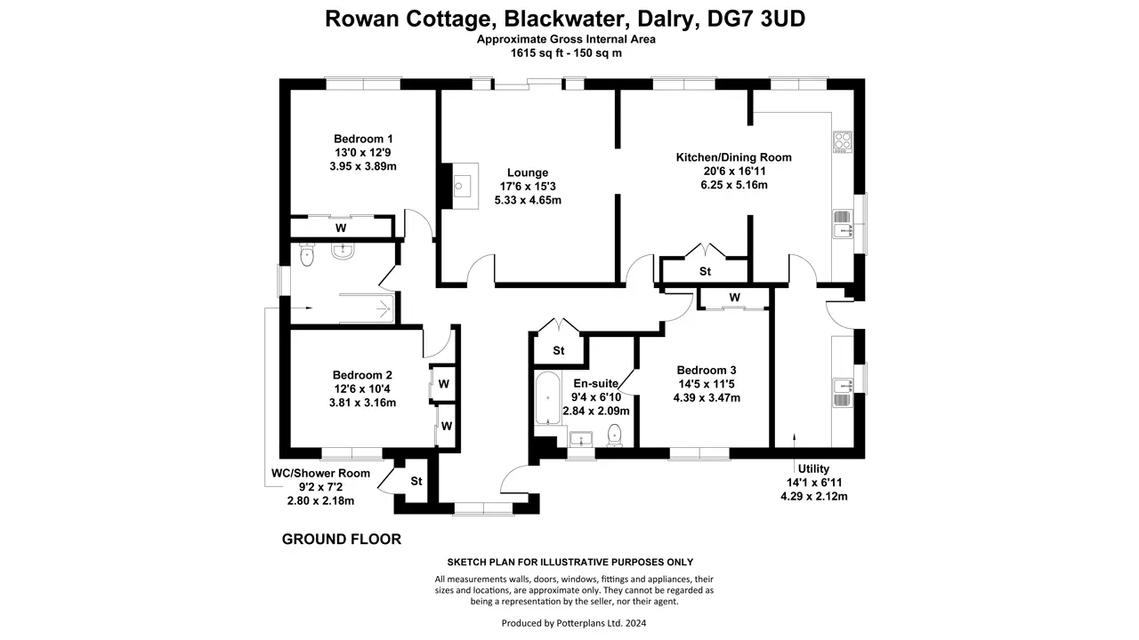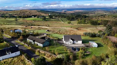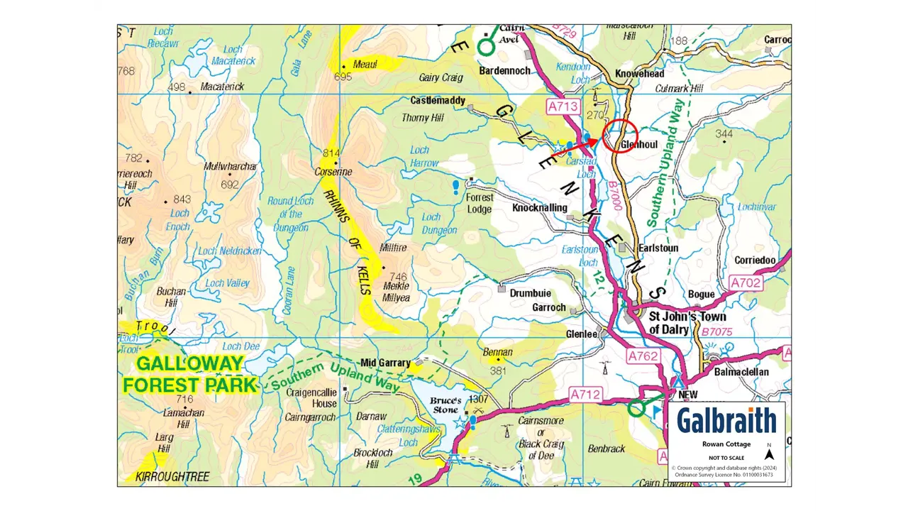 Rowan Cottage sits high just off the B7000, locally known as The “High Carsphairn” Road, looking down on the beautiful Glenkens valley (or glen as it is in Scotland) with panoramic views north and south. The property is about 5 miles north of St John’s Town of Dalry, which is a thriving village with a range of amenities including a Parish church, 24hr fuel garage with Londis supermarket, village shop/post office, 2 hotels including the very highly regarded Clachan Inn and both primary and secondary schools. New Galloway is located about 3 miles away at the northern end of Loch Ken and offers Kells primary school, The CatStrand Community and Arts Centre (which has a programme of events, workshops, and classes year round), Glenkens Medical Practice and village shop. A broader range of facilities can be found in Castle Douglas, which is known as Dumfries and Galloway’s Food Town and has two supermarkets with a third under construction at time of writing, and many local individual shops and businesses providing a varied selection of gifts, foods and services. There are both primary and secondary schools in the town along with supermarkets, health centres, cottage hospital, veterinary services and a thriving livestock market and golf course. Dumfries is the principal town in the area, and provides a wider range of schools, shops, retail outlets, and other services including the region’s main hospital, the Dumfries and Galloway Royal Infirmary. Also in Dumfries there is the Crichton Campus providing further higher education courses.The South West of Scotland is well known for its mild climate, attractive unspoilt countryside and the diversity of sporting and recreational pursuits, and is a popular tourist destination. There is good hill walking opportunities in the Southern Uplands as well as the nearby Galloway Hills, and cycling along some of the new designated cycle routes as well the Seven Stanes mountain bike routes, including Ae Forest and the Galloway Forest Park. The Galloway Forest Park which is known for its beauty and tranquillity, being the centre of the Galloway and Southern Ayrshire Biosphere and Britain’s First Dark Sky Park, which provides astronomers with phenomenal views of the stars. Loch Ken is renowned for its water pursuits, water skiing, sailing, fishing and many others, and The Galloway Activity Centre (just a short distance away) offers a variety of learning courses. DESCRIPTION Rowan Cottage is a lifestyle property capable of providing the perfect setting for a variety of uses. A spacious modern bungalow, built by the current owners, offers family accommodation including 3 double bedrooms, one with en suite bathroom, a large living room which is open to the bright and airy dining kitchen. A useful utility room off the kitchen is perfect for laundry and storing outdoor footwear. All the windows to the rear enjoy the wonderful views, with patio doors leading out from the living room. A large multi-fuel stove provides a cosy focus to the room, but also powers the central heating and hot water. A stylish family shower room completes the accommodation. There is generous storage throughout the property with large double storage cupboards both in the kitchen and generous hallway, as well has ample built in wardrobe space in the bedrooms.Outside there is a large garden mainly laid to lawn to the side and rear, which can be enjoyed from the patio. To the front is a large parking sweep, which leads in from the entrance drive. The driveway runs past the former youth hostel building, which is a useful store of approximately 180m2, with various rooms, plus a large ‘party room’ complete with bar and bench seating. A deck leads out from the party room from where the wonderful views can be enjoyed. The hostel is a fantastic space for extra storage and for teens to be entertained on wet days or summer evenings. It comes with plumbing and power.The land fans out behind the house and hostel and can be seen from the house and garden, giving peace of mind if you had grazing horses or other livestock. There is plenty of scope for building stables and field shelters.All things considered, Rowan Cottage offers a rare opportunity of a turn-key condition house coupled with land for which the possibilities are endless (along with the views!).ACCOMMODATION Ground Floor: Entrance Hall. Living Room. Kitchen with large Dining Area. Utility Room. Master Bedroom with Ensuite Bathroom. Two further Double Bedrooms. Family Shower Room.GARDEN AND GROUNDSFrom the B7000 a wide entrance opens to the driveway, which leads past the former youth hostel building and on round to the front of the house ending in a large parking and turning sweep. A second entrance has a set of timber gates leading from the front garden to the road. To one side is a log store which would be an ideal location for a garage. To the side and rear, the garden is mainly to lawn and edged with trees, all of which have been planted by the current owners. A double set of steps lead down from the living room patio doors to the patio at the rear, perfect for enjoying the garden and views on warm summer days, and for entertaining family and friends. The land, which fans out behind the house, is divided into various paddocks which can be grazed by a variety of livestock. There is a small area of woodland and two ponds. Beyond, is open farmland and countryside.