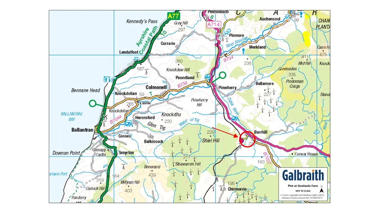 The building plot is located approximately one third of a mile south of the village of Barrhill, South Ayrshire. It is about 12 miles from the town of Girvan and 33 miles from the County Town of Ayr. Glasgow is located some 74 miles away via the M77 and Glasgow Prestwick Airport (38 miles) offers regular international flights and Glasgow Airport is (75 miles). The private airfield at Castle Kennedy is about 18 miles distant.Barrhill village has a local shop, primary school, together with early years centre, with secondary education available at both Girvan and Newton Stewart. Transport links in the area are good with a regular local bus/taxi service as well as a railway station in Barrhill with connections to Ayr, Glasgow and Stranraer. Girvan has a further range of shops, supermarkets, primary and secondary schooling and a community hospital. Newton Stewart also has a good range of shops, cafes and various services. To the north is Turnberry, with world class golfing facilities and a luxury hotel and spa. There is also an excellent 18 hole course at Girvan Golf Course. Ayr is the County Town on the Firth of Clyde with a wide range of amenities, theatre, cinema, excellent shopping, first class private and state schools together with a range of restaurants and sports facilities.The popular racecourse in Ayr is host to the Scottish Grand National and there are exceptional yachting facilities at the Marinas in Troon, Largs and Inverkip. Salmon and trout fishing are available in the area’s lochs and rivers close by. The River Stinchar is a famous salmon fishery and is renowned for its autumn run.The South Ayrshire hills are a popular destination for those seeking outdoor pursuits. There are a number of excellent designated walking routes in the area and some excellent cycle paths including the nearby Galloway Forest with the National Route 7 passing through it. The Merrick is southern Scotland’s highest mountain at 2,800ft and the long distance walking route, the Ayrshire Coastal Path runs from Glenapp (south of Ballantrae) to Skelmorlie in North Ayrshire. There are country walks in the area around Barrhill, including The Martyrs' Tomb Walk following the banks of Cross Water out the village.Planning Permission was granted on 25th April 2025 with the proposed design being arranged over one floor from the conversion of a brick agricultural shed. The building was originally the Barrhill Cattle Market. The local area has a long-standing connection to the cattle industry, particularly with the development of the Ayrshire breed of cattle.The proposed finishes include the existing brickwork structure to remain as is, with black cedral vertical cladding, black UPVC windows and doors together with black UPVC rain water goods. The plot extends to about 2.81 acres in all, with a generous drive and parking area, garden grounds and a 2.26 acre paddock to the south of the building plot.ACCOMMODATION AS PROPOSED3 Bedrooms (1 en suite), open plan Kitchen/Living/Dining Room, Bathroom, Utility Room, Porch, Plant Room.PLANNING CONSENTPlanning Reference 25/00179/PNF, decision granted 25th April 2025. A copy of the planning consent and plans are available on request from the Selling Agents.SERVICESElectricity and water are available close by.FLOOD RISKFlood maps of the area can be viewed at https://map.sepa.org.uk/floodmaps/FloodRisk/SearchThere is no risk of flooding at this site.DIRECTIONSFrom Ayr take the A77 south, signed for Stranraer. At the Shallochpark Roundabout, south of Girvan, take the second exit onto the A714 signed to Barrhill. Follow this road for about 11 miles, as you enter the village turn right onto Gowlands Terrace (signed for the railway station) and continue for about a third of a mile and the building plot is on your left hand side.POST CODE:KA26 0QFWHAT3WORDSTo find this property location to within 3 metres, download and use What3Words and enter the following 3 words: deflate.handover.hiresLOCAL AUTHORITYSouth Ayrshire Council, County Buildings, Wellington Square, Ayr, KA7 1DR. Tel: 0300 123 0900.NOTEProspective purchasers should note early discussions between Voltalia UK Ltd and South Ayrshire Council regarding a potential energy park 0.9km south of Barrhill. A similar plan was previously rejected, buyers are advised to consult the planning department directly. “If the energy park proceeds, it is not expected that the energy park or turbines will be visible from the building plot.”