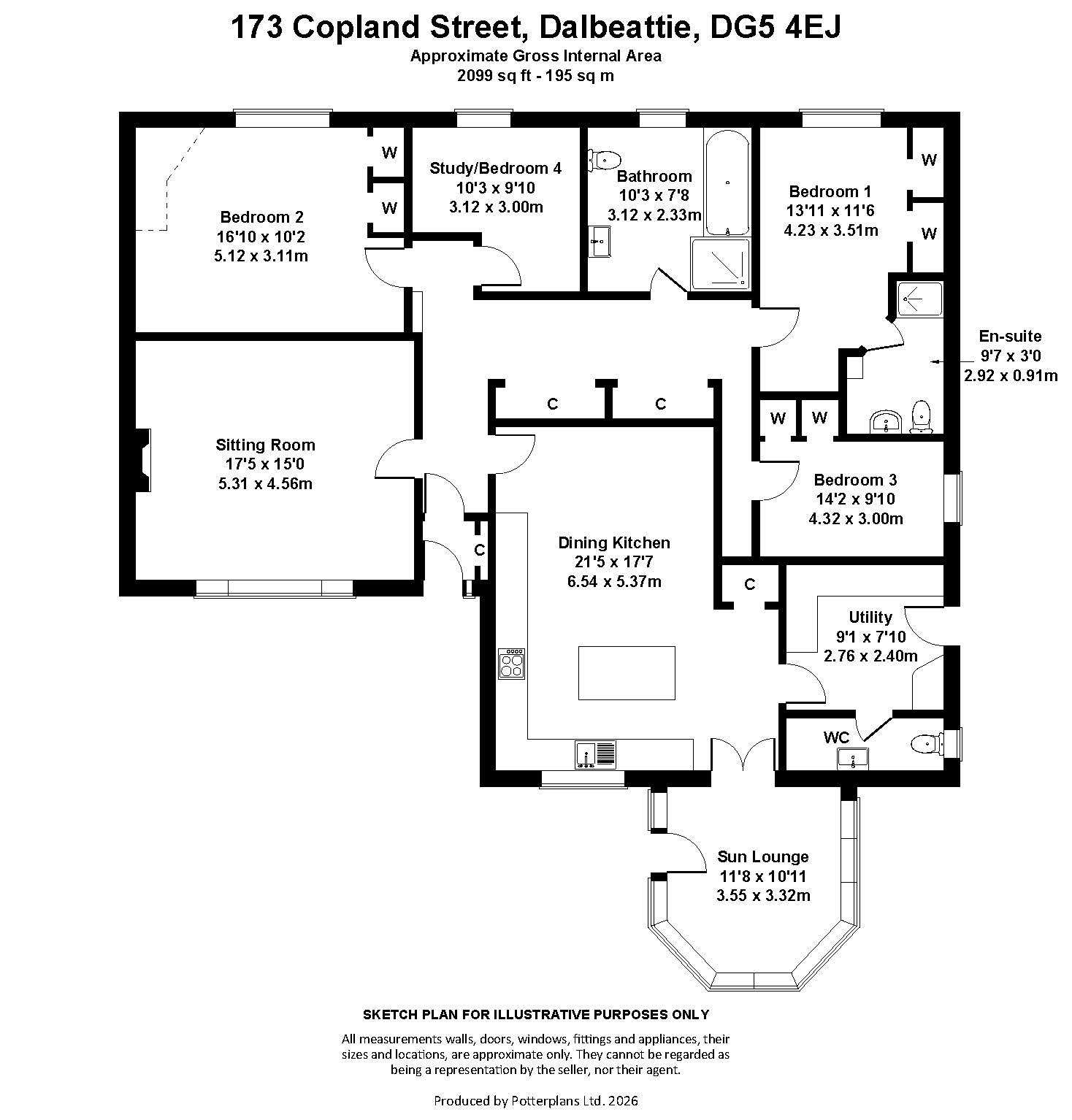 SITUATION 173 Copland Street sits in a small cul-de-sac off the main part of the street in a trio of individually designed residences. Dalbeattie nestles in the valley of the River Urr, the name means “valley of the silver birch”. The town has a thriving and friendly community with a good range of shops, small supermarkets, cafes, hotels, restaurants. The town also has award winning butchers, a veterinary surgery, nursery, primary and secondary schools in a state of the art education campus, a museum, solicitors, a dental practice and a health centre. In addition there is a selection of sporting facilities including a park with boating lake, a bowling green, an active tennis club, football club and facilities, as well as a nine-hole golf course. In the summer months a Civic programme runs a variety of events enjoyed by the local community and visitors alike. The nearby market town of Castle Douglas, known as Dumfries & Galloway’s Food Town, also provides a variety of shops, two larger supermarkets, health services, pool and leisure facilities, veterinary services, and a thriving livestock market. Dumfries which is approximately 13 miles distant and is the principal town in the area which provides a wider range of schools, shops, retail outlets, and other services including a major hospital, the Dumfries and Galloway Royal Infirmary. Dumfries is home to the Crichton campuses of both Glasgow University and the University of the West of Scotland. Communications to the area are good. There are mainline railway stations in both Dumfries and Lockerbie, providing excellent links to both the north and south. The M74 motorway network is 42 miles distant, and there are regular flights to other parts of the UK, Ireland and Continental Europe from Prestwick Airport 63 miles north, and Edinburgh and Glasgow both 96 miles.DESCRIPTION 173 Copland Street is an attractive modern bungalow sitting in mature landscaped garden grounds. The rooms are well-proportioned with a spacious dining kitchen providing the heart of the home. A good-sized utility room with shower room complements the kitchen. The airy sun lounge and generous sitting room, with welcoming living flame gas fire, provide ideal reception space for both formal and more casual entertaining. The master bedroom has an en suite shower room, and a stylish family bathroom supports the remaining three bedrooms. The smallest bedroom has been used as a home office and is ideal for this purpose but would also make a child’s bedroom or nursery. Outside is a large garage with workshop space, power and light. There is also a car port to the side of the garage.The property is in true walk-in condition and is ideally placed for all town amenities as well as the wider surroundings such as the nearby Dalbeattie forest and the coast a few miles away. ACCOMMODATION Hallway. Dining Kitchen. Utility Room. Shower Room. Sun Lounge. Sitting Room. Master Bedroom with En Suite. 3 Further BedroomsGARDEN From the private road a gravel area sweeps into the front garden and leads around to the rear of the house to the garage and carport. This provides ample parking and turning for several vehicles. A large border runs along the side of the gravel and is replete with mature shrubs, trees and plants giving year-round interest. To the other side is a lawned area, bound by another mature border. Steps lead from the gravel area to a timber deck at the front of the sun lounge. To the rear is a further area of lawn and a decorative gravel area with ornamental beds, and a summer seat with round paved small patio. There is also an attractive raised bed. A path leads around the side of the house with steps and railing up to the back door, then continues around to the rear garden.
