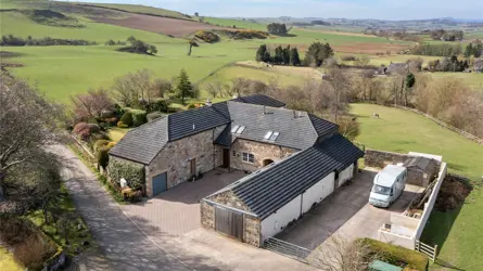 SITUATIONLadeddie Barns is a lovely family home situated in rolling agricultural land about 1.5 miles east of the pretty village of Pitscottie, a short distance to the west of St Andrews in Fife. Enjoying good views over the surrounding fields and countryside, the property is very well placed for accessing St Andrews, Cupar and Dundee. In terms of local amenities St Andrews is just a 10 minute drive from the house. It is renowned worldwide as the “Home of Golf,” offering a fine cosmopolitan mix of shops, restaurants, pubs and the like. The City of Dundee is approximately 20 minutes to the north and Edinburgh about an hour to the south.The glorious rolling Fife countryside and coastline which surrounds Pitscottie supports an array of wildlife, and for the outdoor enthusiast offers easy access to many recreational pursuits including walking, riding, cycling, and golf. There are several top courses in and around St Andrews including The Old Course which regularly hosts the British Open – the event returns to the town in 2027.Challenging shooting and fishing may be enjoyed locally and there are the wide open spaces of the Lomond Hills and several lovely nearby beaches including St Andrews, Tentsmuir, Kingbarns, Crail, and Elie. For day trips there are a number of National Trust for Scotland properties in the area including Falkland Palace, Hill of Tarvit and Kellie Castle. The quaint fishing villages of Fife’s East Neuk are a short drive to the south. State schooling is available locally with private schooling being provided at St Leonards in St Andrews and Dundee High School. There are railway stations in Leuchars, Cupar, Ladybank, and Markinch. Edinburgh airport is about one hour away.DESCRIPTIONLadeddie Barns is an elegant and spacious two storey house built in 1991 from cream painted block and partially faced in local stone under a tiled roof. Approached along a quiet road between Pitscottie and Craigtoun, the house is accessed on the right through a courtyard paved in monobloc with parking for 4 cars, entrance to the annexe, the stables and a barn/single garage. The entrance hall with study/office and cloakroom off, leads into the sunny dining room with large fireplace set in a feature stone wall and floored with warm toned engineered oak. There is a capacious understair cupboard and a door connecting to the annexe. A quarry tiled conservatory to the south opens off the dining room. Steps down take you to the large living room with windows to the south and west. A feature stone wall has a multifuel Dovre stove and doors open into the garden. The pine kitchen boasts a double sink and a 2 door Aga which also heats the hot water. This leads through to the utility room with plumbing for washing machine, a Belfast sink and a WC off, and has doors to both the garden and the courtyard.Pine stairs from the dining room take you up to a wide landing with bedrooms off. The principal bedroom faces west and has an en-suite bathroom. There are 4 further bedrooms one of which has a connecting door to the annexe, bedroom 5/sewing room, and a family bathroom with bath, separate shower, wash hand basin and WC. The second floor has storage throughout with generous under eaves cupboards and an airing cupboard heated by the hot water tank.The annexe benefits from air source heating and is accessed from the courtyard, but also from connecting doors to the main house on both floors. The outside door opens onto a small hall with galley kitchen with oven, hob and fridge freezer, bathroom, bedroom. The large sitting room benefits from a wood burning stove set in a stone fireplace. Stairs rise to the first floor with a further bedroom and en-suite bathroom.ACCOMMODATIONGround Floor: Hall, cloakroom, study/office, dining hall, living room, conservatory, kitchen, utility room, bathroom, WCFirst Floor: Principal bedroom with en suite bathroom, 4 further bedrooms, bedroom 5/sewing room, family bathroomAnnexe: Living room, kitchen, 2 bedrooms, 2 bathrooms (one en-suite).NB The property benefits from Solar Panel installation and battery back up.The agreement for FIT payments is with Scottish Power. (FIT is feed in tariff)The commencement date was 16/07/2010The expiry date is 15/07/2035The income of FIT payments for 2024 was £2,388.90.GARDEN AND GROUNDSTo the south of the house lies a lawned garden enclosed by low stone walls, and surrounded by well established shrubs and flower beds. There is a water feature in the centre of the lawn and a small stream meanders along the side. Two paddocks are found to the west, one with a donkey shed, both served by the stream. The stables are to the north of the house and accessed both through an attractive stone arch from the courtyard and from the larger paddock and comprise two looseboxes, a hayloft and a large barn. A stable yard is accessed from the entry road at the rear of the barn. At the entrance to the courtyard is a barn/single garage.COUNCIL TAX The property has been assessed as Band H by Fife Council. FLOOD RISKFlood maps of the area can be viewed at https://map.sepa.org.uk/floodmaps/FloodRisk/SearchDIRECTIONSFrom the village of Pitscottie, take the B939 towards St Andrews and just outside the village bear left towards Craigtoun and follow the road for about 1.5 miles. Ladeddie Barns is found on the right, a cream painted house accessed via its own courtyard.POST CODEKY15 5TXWHAT3WORDSTo find this property location to within 3 metres, download and use What3Words and enter the following 3 words:Basics.leopard.momentFIXTURES AND FITTINGSNo items are included unless specifically mentioned in these particulars. The large dining table and 8 dining chairs is included in the sale. (NB The dining table converts into a snooker table).VIEWINGSStrictly by appointment with the Selling Agents.