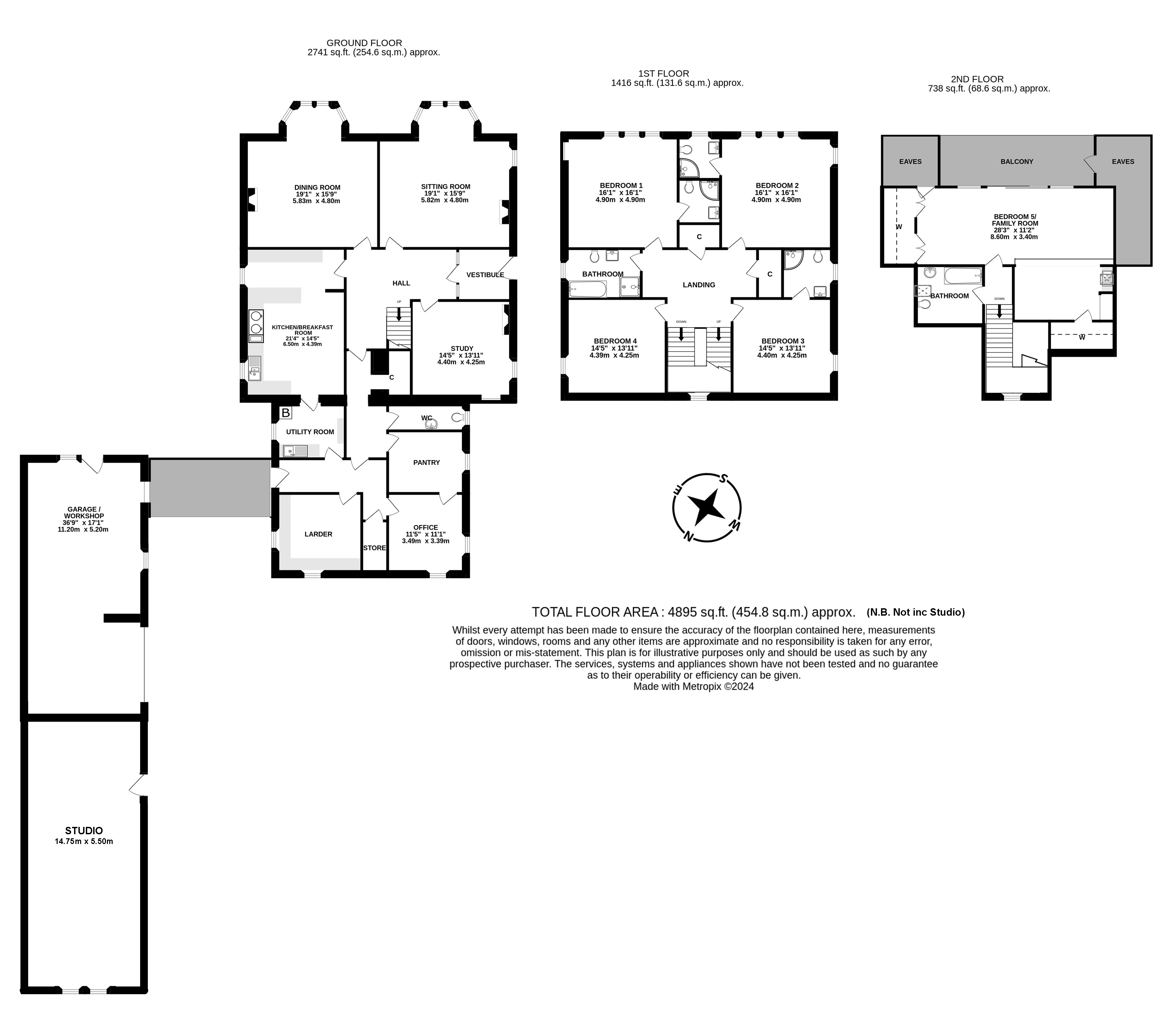 - 3 reception rooms. 5 bedrooms (3 en suite), 2 bathrooms, WC. Stores.