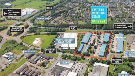 AVAILABILITYUnit 12 - 1,046 sq ft (To be refurbished)Unit 17 - 1,519 sq ftDESCRIPTIONThe estate comprises a number of single storey light industrial units arranged across five terraces, with frontage to the A92 trunk road. The units are all of steel portal frame construction with elevations of profile metal clad walls. The roofs are pitched and clad with corrugated metal sheeting which incorporate roof lights. Each unit benefits from a roller shutter door to their front elevation. There are extensive yard and parking areas to the front of all units, along with areas of landscaping.