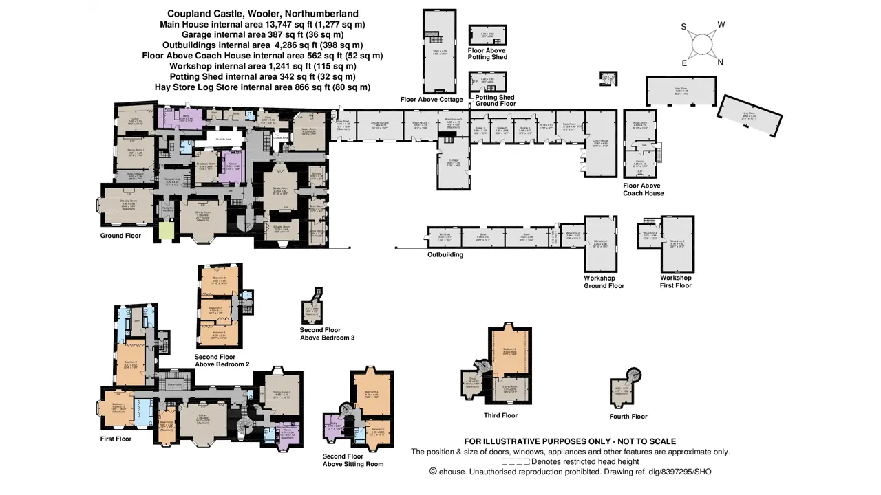 A magnificent Grade I listed residence of 16th century origins, set within about 25 acres and with views towards the Cheviot HillsWooler High Street 4 miles, Alnwick 22 miles, Alnmouth mainline station 26.7 miles, Berwick railway station 16.6 miles, Morpeth 36 miles, Newcastle Airport 49.8 miles, Newcastle upon Tyne 51 miles, Edinburgh 59 milesHistorical Note Coupland Castle boasts a fascinating history, originating in the late 1580s with the Pele Tower being the last fortified building to be constructed on the Border. Before the tower was built, the Coupland lands belonged to Sir John de Coupland who captured the Scottish King at the Battle of Neville’s Cross in 1346.The property has been extended over the centuries and the earliest part is the fourstorey main tower, probably built towards the end of the 16th century, after the finding of a Border Commission in 1584. The smaller tower was probably built after the Union of England and Scotland (1603), when the threat from the border had subsided. An impressive fireplace in the sitting room within the tower, is engraved with ‘GW 1619 MW’, representing George and Mary Wallis, who owned the property at that time. A further interesting and unusual feature of the tower is the upper spiral staircase, which was designed for defence by a left-hand swordsman.During the 18th century, a separate farmhouse was added to the south-west of the now L-shaped tower and the Wallis family sold Coupland in 1713 to Sir Chaloner Ogle RN. Ogle was famous for having defeated the pirate Batholomew Roberts, who during a brief career, captured around 456 ships. In 1806, Nathaniel Ogle conveyed the Castle and estate to Thomas Bates, and Matthew Culley was succeeded to the estate in 1820. In the 1820s, the late Georgian part of the current property was added and linked the tower to the farmhouse. The Culley family sold Coupland in 1928 to the Weidner family, who in turnsold it to Sir Walter Aitchison in 1938. Sir Water took an immense interest in the gardens and set about planting the impressive arboretum to the east of the house.The Castle was sold in 1971 and twice again before the present owners purchased it in 1979.Coupland CastleDating back to the late 16th century, Coupland Castle, with its crenelated tower, stands surrounded by mature gardens and woodland, with a range of versatile outbuildings. For the equestrian enthusiast, there are also stables and grazing land.The Castle has been skilfully maintained and embellished over the years to provide striking accommodation that is elegant and grandiose, whilst showcasing its superb architectural details, and high ceilings that enhance the sense of light and space. In addition to the main house, there is ancillary accommodation in the form of a 3-bedroom cottage within the courtyard, and a 3-bedroom lodge.Internally, the accommodation is arranged over four levels and offers immense flexibility. There are numerous generously proportioned reception rooms, including the beautifully presented dual aspect drawing room, library and the spacious dining room, all with large bay windows and wonderful period fireplaces. A variety of additional rooms provide excellent space for less formal relaxation and entertaining, including a sitting room, games room and play room. The kitchen benefits from an adjoining breakfast room, both of which overlook an internal courtyard. The wine cellar is in two rooms, each with bins.On the first floor, the accommodation in the Georgian portion of the house is laid out to provide a bay-windowed library, three bedrooms (two with en suite bathrooms) and a family bathroom, whilst the second floor is host to three further bedrooms and a WC. Located above bedroom 3 is a further room with potential for a variety of uses.The Tower, with its 5ft thick stone walls and spiral stone staircase, is arranged to provide self-contained living space comprising a sitting room, kitchen/breakfast room, a utility, 4 bedrooms and two additional rooms. This element has been used as a separate dwelling and has been let to tenants.Garden & GroundsCoupland Castle is approached along a sweeping tree-lined driveway that culminates in a parking area to the front of the Castle, providing a delightful sense of arrival. The driveway forks at the top to enable a split of traffic types, i.e. domestic or to the stables. Set within 25 acres, the grounds are truly an outstanding feature of the property and create a wonderful setting. They comprise formal gardens, a kitchen garden, woodland, paddocks/grazing land, and an impressive arboretum, planted with an array of specimen trees, including a Pocket-Handkerchief tree from Indo China. In the spring, the arboretum comes alive with a sea of daffodils, snowdrops and bluebells.OutbuildingsAdjacent to the castle lies a charming courtyard where access may be gained to a variety of outbuildings including a coach house with a studio and apple store above, a double garage, wash house, three stables and tack room, workshops, hay barn and store rooms. In addition to providing a sensational family home, Coupland Castle boasts two further dwellings: a 3-bedroom cottage and a 3-bedroom lodge. They have been successfully rented out and thereby offer income potential (further details available upon request).ServicesMains electricity and water are connected to the estate. Private drainage system shared by all dwellings, located just off the property. Oil fired central heating. PlanningCoupland Castle tower is listed Grade I under the Planning (Listed Buildings and Conservation Areas) Act 1990 as amended for its special architectural or historic interest. Various other buildings within the estate, including the sundial, are listed Grade II.TenureFreehold with vacant possession upon completion. The lodge and cottage are let on term expired shorthold tenancies (i.e. 2 months notice required to achieve vacant possession).Fixtures and FittingsOnly fixtures and fittings specifically mentioned in t
