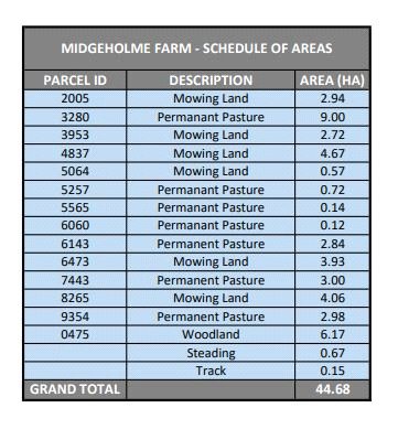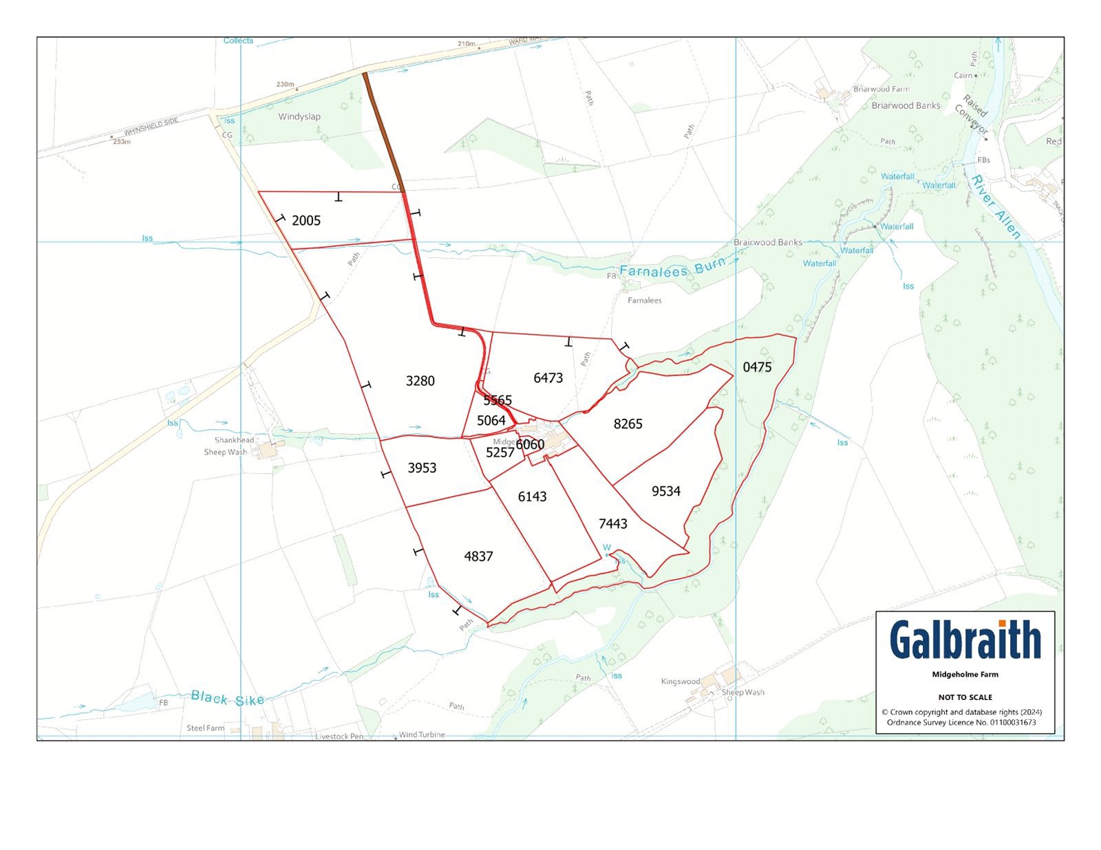 Summary Midgeholme Farm is subject to an Agricultural Holdings Act tenancy, currently on its first succession. Midgeholme is a productive livestock farm extending in total to approximately 44.68 Hectares (110.40 acres), benefitting from a three-bedroom farmhouse, range of modern and traditional agricultural buildings with agricultural land and woodland, extending in total to approximately 43.86 hectares (108.38 acres). Location Midgeholme Farm is located some 5.9 miles from Haydon Bridge and approximately 12.3 miles from Hexham. Midgeholme benefits from excellent transport links being located approximately 2.6 miles from the A69 trunk road, providing access from Northeast England across to Carlisle at the M6 motorway. Newcastle International Airport is located some 31.3 miles from The Property and the closest train station is situated at Haydon Bridge of the Northern Rail service. Farm Buildings The farm buildings comprise of a range of traditional stone buildings together with a range of more modern agricultural buildings. The farm buildings are located to the southern side of the farmhouse and are situated in a central position to the land. Dwelling The stone-under-slate farmhouse comprises of two reception rooms, three bedrooms and a bathroom. The internal floor area extends to approximately 236.9 sq. metres (2549.6 sq.feet). Land The land extends in total to approximately 43.86 Hectares (108.38 acres), comprising of 46.45 acres of permanent pasture, 46.68 acres of mowing land and 15.25 acres of woodland. The land has been well maintained by the tenant and is classified as Grade 4 agricultural land. The soils predominately comprise of slowly permeable, seasonally wet acid loamy and clay soils. Rent The current rent passing is £9,200 per annum. Countryside Stewardship Scheme The land is entered into an Entry Level and Higher-Level Countryside Stewardship Scheme. Further details on the options attributed to Midgeholme are available from the selling agents. Basic Payment Scheme The property is registered with the Rural Payments Agency. The delinked payments will remain with the Tenant. Rights and Easements The Property is sold subject to and with the benefit of all rights of way, whether public or private and any existing wayleaves, easements, rights of servitude restrictions and burdens of whatever kind whether referred to in these particulars or not. The Purchaser(s) will be held to satisfy himself or herself on all such matters. There is a public footpath which passes through the holding from the northeastern end of the property at Farnalees Burn, though the farm steading and south to Kingswood Burn. Access The Property is accessed from a track (named Whinshield Side) leading from the public highway off Ward Way, highlighted brown on the land plan. Viewing Midgeholme is available to view strictly by prior appointment with Galbraith, Hexham. Tel: 01434 693693. Method of Sale The property is offered for sale by Private Treaty as a whole. Offers should be submitted to Galbraith, Hexham Business Park, Burn Lane, Hexham NE46 3RU. A closing date for offers may be fixed, and prospective purchasers are advised to register their interest with the selling agents following an inspection. The vendor and their agents reserve the right to amalgamate, withdraw or exclude any of the land shown at any time or to generally amend the particulars of sale. The agents also reserve the right to conclude negotiations by any other means at their discretion and a degree of flexibility is available to prospective purchasers. Services The property is serviced by a mains single phase electric supply and a mains water supply. Foul drainage is to a private septic tank. All telephone connections are subject to BT regulations. Please note we have not been able to test services or make judgement on their current condition. Prospective purchasers should make their own enquiries. Fibre optic broadband supplied by B4RN is connected to the property but has not yet been activated. Tenure and PossessionThe property is held freehold and offered for sale subject to an Agricultural Holdings Act Tenancy on first succession. Sporting and Mineral Rights The sporting and mineral rights are included within the sale so far as the Vendors have title to them. Local Authority Northumberland County Council - 0345 600 6400. Energy Performance Certificate Midgeholme Farmhouse – F21. The EPC documents are available from the selling agents on request. Council Tax Midgeholme Farm – Band C (Northumberland County Council). Plans and Schedules Plans and Schedules included within these particulars are based on information from the Rural Payments Agency and Ordnance Survey, to be observed for reference only. Money Laundering Regulations The successful purchaser(s) will have to provide the selling agents with documents in relation to the Money Laundering Regulations. Further details are available upon request. Tenancy Agreement The Tenancy was granted in 1967 and has a right of two successions under the 1986 Act for three generations of the same family. There is one further succession available. A copy of the Tenancy Agreement can be made available to interested parties upon application.IMPORTANT NOTES1. These particulars are intended to give a fair and overall description of the Property. If any points are relevant to your interest, please ask for further information prior to viewing. Prospective purchasers are advised to seek their own professional advice. 2. Areas, measurements and distances are given as a guide. Nothing within the particulars shall be deemed to be a statement as to the structural condition, nor the working order of services and appliances. 3. Closing Date. A closing date for offers may be fixed. Prospective purchasers who have notified their interest to Galbraith, in writing, will be advised of a closing date, unless the Property has been sold previously. The Seller will not be obliged to accept the highest, or indeed any