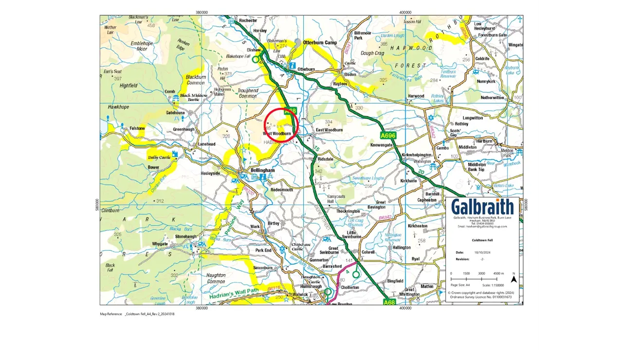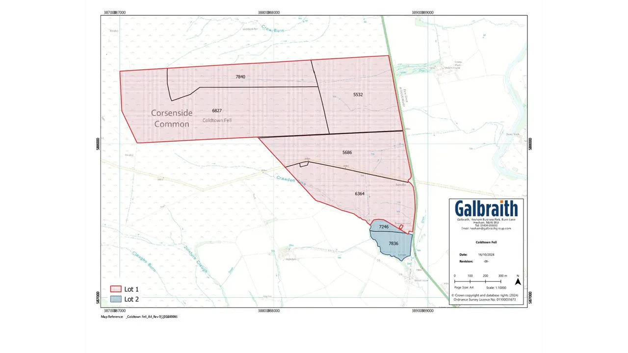 Lot 1: A Block of Permanent Pasture and Rough Grazing, Extending in Total to Approximately 125.39 Hectares (309.84 Acres). Lot 2: Two Parcels of Permanent Pasture Extending in Total to Approximately 5.07 Hectares (12.53 Acres). The Land may be suitable for a variety of uses including regenerative agriculture, rewilding projects, sporting and natural capital benefit, subject to obtaining relevant consents. LOCATIONThe Property is located adjacent to the A68, just north of West Woodburn in the county of Northumberland, approximately 20 miles north of the market town of Hexham and about 4.5 miles from the village of Otterburn and on the northern fringe of West Woodburn. The land is located within one block with part of the Property lying within Northumberland National Park. DESCRIPTIONThe sale of Coldtown Fell offers an exciting opportunity to purchase an attractive block of agricultural land which may be suitable for a for a variety of uses including regenerative agriculture, rewilding projects, sporting and natural capital benefit, subject to obtaining relevant consents. The Property is offered for sale in two separate lots or as a whole. Lot 1: The land extends in total to approximately 125.39 Hectares (309.84 acres) of Grade 5 permanent pasture and rough grazing. The soils comprise of slowly permeable, wet, very acidic upland soils with a peaty surface. The land is located in the Northumberland National Park, excluding field 6364 which lies outside of the National Park Boundary. There are some livestock handling pens located within field 6364. Lot 2: The land extends in total to approximately 5.07 hectares (12.53 acres) of Grade 5 permanent pasture, including a boundary buffer of mature trees. The soils comprise of slowly permeable, seasonally wet, slightly acidic but base rich loamy and clay soils. The land lies outside of the Northumberland National Park boundary. ENVIRONMENTAL SCHEMES The land is entered into an Entry Level plus Higher-Level Countryside Stewardship Scheme. Further details are available from the selling agents. The land is not entered into the Sustainable Farming Incentive. BASIC PAYMENT SCHEMEThe Property is registered with the Rural Payments Agency. The delinked payments will be retained by the Vendor. RIGHTS AND EASEMENTS The Property is sold subject to and with the benefit of all rights of way, whether public or private and any existing wayleaves, easements, rights of servitude restrictions and burdens of whatever kind whether referred to in these particulars or not. The Purchaser(s) will be held to satisfy himself or herself on all such matters. Coldtown Fell is located within CRoW Common Land. The unclassified road passing through The Property is designated as a Byway Open to All Traffic (BOAT). ACCESS Lot 1: The Property is accessed from the Unclassified Road passing though the Property, then from field to field. Lot 2: The Property is accessed from the public highway, then from field to field. DEVELOPMENT OVERAGELot 2 is sold subject to a development overage. The overage will be for any non-agricultural development and will run for a period of 25 years from the completion of the sale. The uplift payment will be 50% of the uplift in the land value over the agricultural value of the land at that time. Further details are available from the selling agents. VIEWINGSColdtown Fell is available to view strictly by prior appointment with Galbraith, Hexham. Tel: 01434 693693. Email: hexham@galbraithgroup.com METHOD OF SALE The property is offered for sale by Private Treaty as a whole or in two lots. Offers should be submitted to Galbraith, Hexham Business Park, Burn Lane, Hexham NE46 3RU. A closing date for offers may be fixed, and prospective purchasers are advised to register their interest with the selling agents following an inspection. The vendor and their agents reserve the right to amalgamate, withdraw or exclude any of the land shown at any time or to generally amend the particulars of sale. The agents also reserve the right to conclude negotiations by any other means at their discretion and a degree of flexibility is available to prospective purchasers. SERVICESThe Property is serviced by a natural water supply. TENURE AND POSSESSIONThe Property is held Freehold with vacant possession being obtained on completion. SPORTING AND MINERAL RIGHTS The sporting rights are included within the sale so far as the Vendors have title to them. The mineral rights are not included in the sale.LOCAL AUTHORITY Northumberland County Council - 0345 600 6400. Northumberland National Park – 01434 605555. PLANS AND SCHEDULESPlans and Schedules included within these particulars are based on information from the Rural Payments Agency and Ordnance Survey, to be observed for reference only. MONEY LAUNDERING REGULATIONS The successful purchaser(s) will have to provide the selling agents with documents in relation to the Money Laundering Regulations. Further details are available upon request.IMPORTANT NOTES1. These particulars are intended to give a fair and overall description of the property. If any points are relevant to your interest, please ask for further information prior to viewing. Prospective purchasers are advised to seek their own professional advice.2. Areas, measurements and distances are given as a guide. Photographs depict only certain parts of the property. Nothing within the particulars shall be deemed to be a statement as to the structural condition, nor the working order of services andappliances. 3. The Seller will not be obliged to accept the highest, or indeed any offer and has the right to accept an offer at any time or withdraw the property from the market. The Seller will not be liable for any costs incurred by interested parties. 4. If there are matters of particular importance please raise this with us and we will try to check the information for you. 5. Particularsprepared October 2024. 6. Photographs taken October 2024.