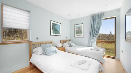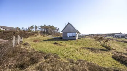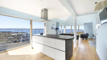 Boom House is in a beautiful setting on the northeast side of Loch Ewe in the scattered crofting village of Mellon Charles. The nearby village of Aultbea lies on the west shore of the loch and has a good range of amenities including a village shop, doctor’s surgery, garage and hotel and bar. There is a primary school at Bualnaluib, 1.5 miles from Mellon Charles, and secondary schooling is in Gairloch about 15 miles away and for which there is a free bus service. Further shops and amenities are available in Poolewe, Gairloch, Ullapool and Dingwall, with Inverness some 78 miles distant having all the facilities of a major city, including its airport with regular flights to the south and Europe.Boom House, designed by architect Robin Haddow, was completed in 2013 and has been under the same ownership since new. An energy efficient property with high levels of insulation, an air source heat pump, a mechanical ventilation with heat recovery system (MVHR), solar panels with a feed-in-tariff, and with an abundance of glazing maximising solar gain. Boom House has many contemporary design elements include larch cladding, steel roofing, a corner window and a mezzanine with glass balustrade mirroring the glass balustrade surrounding the external raised timber deck accessed by a glazed sliding door, ensuring uninterrupted views from the kitchen. The kitchen has integral appliances, a work island/breakfast bar and is open plan with the dining /sitting area with its vaulted ceiling, wood burning stove, and large windows which flood the space with costal light and take full advantage of the views over Loch Ewe and beyond. Loch Ewe has an interesting history, and the name ‘Boom House’ is a nod to the boom net which was run across the entrance of Loch Ewe in World War II to protect the naval fleet on the sea loch from German submarines.