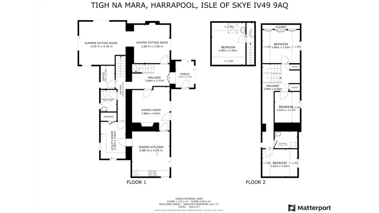 Tigh-Na-Mara which dates back to the 1800’s is a charming, detached and extended dwelling that has been under the same ownership for fifty years and has only ever been owned by three different families. The accommodation is welcoming, comfortable and spread over two floors and has been well-maintained and modernised, including a combination of double and triple glazing, yet sympathetically retains original features such as some internal joinery. The sitting room has an open fireplace and the dining room with exposed stonework has a wood burning stove adding to the character. The summer sitting room takes full advantage of the stunning views over Broadford Bay having a large picture window.Seabird Cottage, which in on the same title as Tigh-Na -Mara, is a detached bungalow designed by the current owner and built in 2007. It offers accessible accommodation spread over the one level, with ramped access. The heart of Seabird Cottage is the open plan kitchen/dining/sitting room, that has an open fireplace. The abundance of glazing within this open plan space, including a feature arched window, patio doors and Velux windows all allow the influx of coastal light. The property has been used as a self-catering holiday unit, with a turn over of £40k in the last tax year, two time winner of customer choice award from Cottages.com in 2021, 2022 and 2023 and currently holds a Short Term Let Licence valid until April 2026.In Addition the letting cottage has a large, boarded loft area, so there may be potential for further development of the cottage subject to the nesseccary consents.Harrapool is a crofting township close to the village Broadford, the second biggest settlement on the Isle of Skye. The Isle of Skye is the best known of the Inner Hebridean islands off the west coast of Scotland. Famous for its romantic, historical associations and magnificent landscape dominated by the Cuillin Mountains. The island is very popular attracting many tourists throughout the year as well as those who seek to enjoy a peaceful lifestyle in unspoilt and beautiful surroundings. With its many coastal and forestry trails, small islands and inlets, and rugged hills, the island is an ideal location for walking, mountain biking, kayaking and sailing, and is rich in Wildlife. Both properties are conveniently located within walking distance of the shops and restaurants and nearby Broadford has a good range of shops, supermarkets and facilities including a primary school which was recently rated the second best primary in the Highlands and offers bi-lingual Gaelic education. With the ‘state of the art’ Broadford community Hospital that opened in 2023 serving as the main hospital for the area. While a wider range of amenities and secondary schooling are available in Portree about 26 miles away. Inverness, about a 2 hours’ drive away, has all the facilities of a modern city including its airport with regular flights to the south and Europe.