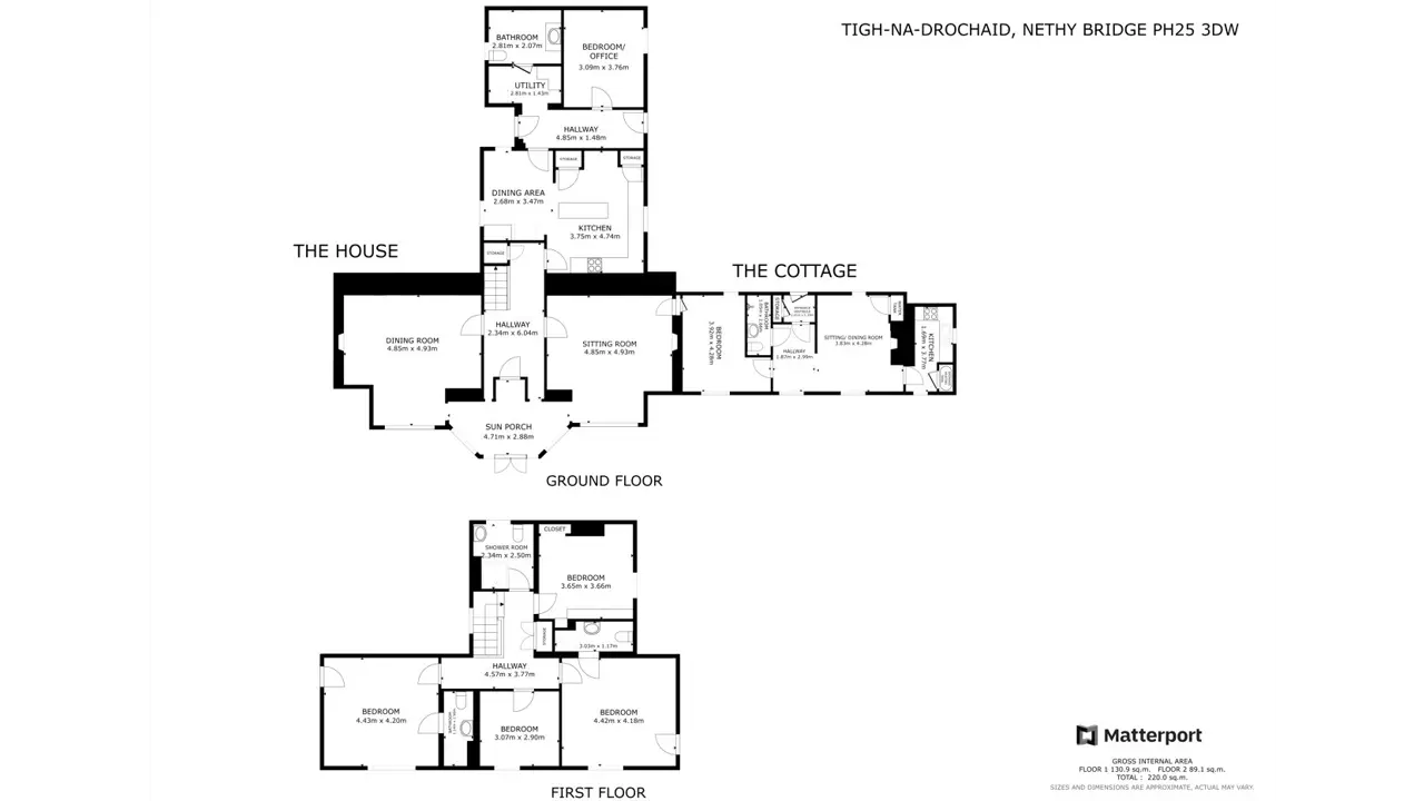 Tigh-Na-Drochaid lies in the centre of Nethy Bridge in the Cairngorms National Park. A property of note in the village, the house and its adjoining, self-contained cottage are in a delightful setting with grounds extending half way into the River Nethy.Nethy Bridge is situated in the heart of Strathspey in the Cairngorms National Park and has been a popular holiday destination since Victorian times. The village has an excellent range of shops and amenities, a primary school, golf course and a wide network of way-marked forest walks. Rothiemurchus and the Cairngorms Ski Centre are nearby and offer activities in the surrounding countryside and on the mountain ranges throughout the year including cycling, skiing, water sports, and fishing. The world-famous River Spey is close by, while Abernethy and Insh Marshes RSPB reserves provide a habitat for many protected and rare species of birds and wildlife.The nearby towns of Grantown-on-Spey and Aviemore offer more extensive services, including secondary schooling, supermarkets, swimming pools, independent retailers and restaurants. A mainline railway station and intercity bus routes are both available from Aviemore. Inverness is less than one hour’s drive to the north and provides all the services of a major city including its airport with regular links to the south and Europe.The HouseThe current owners purchased Tigh-Na-Drochaid in 2016 and have carried out improvements to create a comfortable and well-appointed family house. The work carried out includes the installation of a zoned, biomass heating system, a new wood burning stove in the sitting room, repainting of exterior woodwork and some redecoration.The interior is well laid out and welcoming with two reception rooms and sun porch at the front of the house and a modern dining kitchen to the rear. The ground floor back wing has a utility area, bedroom/study and bathroom and with its side entrance has the potential for use as a self-contained annexe, subject to the necessary consents. The first floor has two en suite bedrooms, two further bedrooms and family shower room.The CottageThe charming cottage at Tigh-Na-Drochaid has been fully renovated by the current owners. The interior was taken back to the original stone walls and refitted to create comfortable and well-appointed accommodation while retaining the character of a traditional property. The cottage has excellent levels of insulation and is heated via the zoned biomass heating system, minimising running costs.