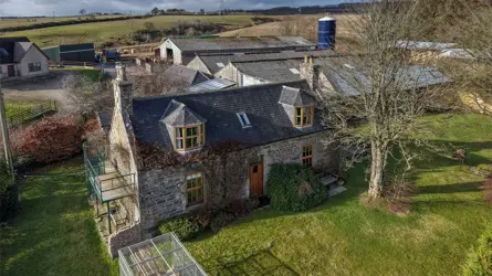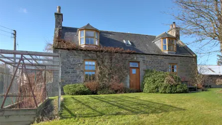 Mains of Balnamoon is located in an elevated position only a short distance from the town of Keith in the county of Moray. Keith offers a good range of amenities including a variety of shops, major supermarket, medical practice, hospital and A&E, primary and secondary schooling. Mains of Balnamoon is a delightful traditional house together with a substantial stone built steading, located in a peaceful position near Grange. Likely to date from the early 1900’s, the house is constructed from stone under a pitched slate roof and provides accommodation over two storeys. On the ground floor, the boot room gives access to a shower room and also into the kitchen/dining/living room which is particularly generous in size and has a wood burning stove. Being triple aspect, it is also a wonderfully light room and the large windows make the most of the beautiful outlook over the garden and courtyard. From the kitchen/dining/living room, a door leads to the front hall where the double aspect sitting room can be found with its spectacular Godin/French woodburning stove. On the first floor, there are two double bedrooms along with a bathroom and the WC.Across the courtyard is the Larch clad Annex, comprising a double bedroom, kitchen and shower room; it makes perfect guest accommodation.The house is double glazed and is heated from the oil fired Stanley Range in the kitchen. It is connected to mains electricity and water with foul drainage to a private facility.Outside, the house sits within a generous and well maintained mature garden which includes areas of lawn interspersed with various mature trees and plants, a productive vegetable garden, shrubs, several cosy courtyard seating areas and a patio with fabulous views. The garden room with wood burning stove opens onto a sheltered area of garden and raised beds. To the rear of the house lies an attractive stone built steading with stables and various stores and byres. The steading offers potential for further development (subject to obtaining all necessary consents). The property in total extends to just over 7 acres and includes several paddocks and a floodlit menage with a sand and rubber surface