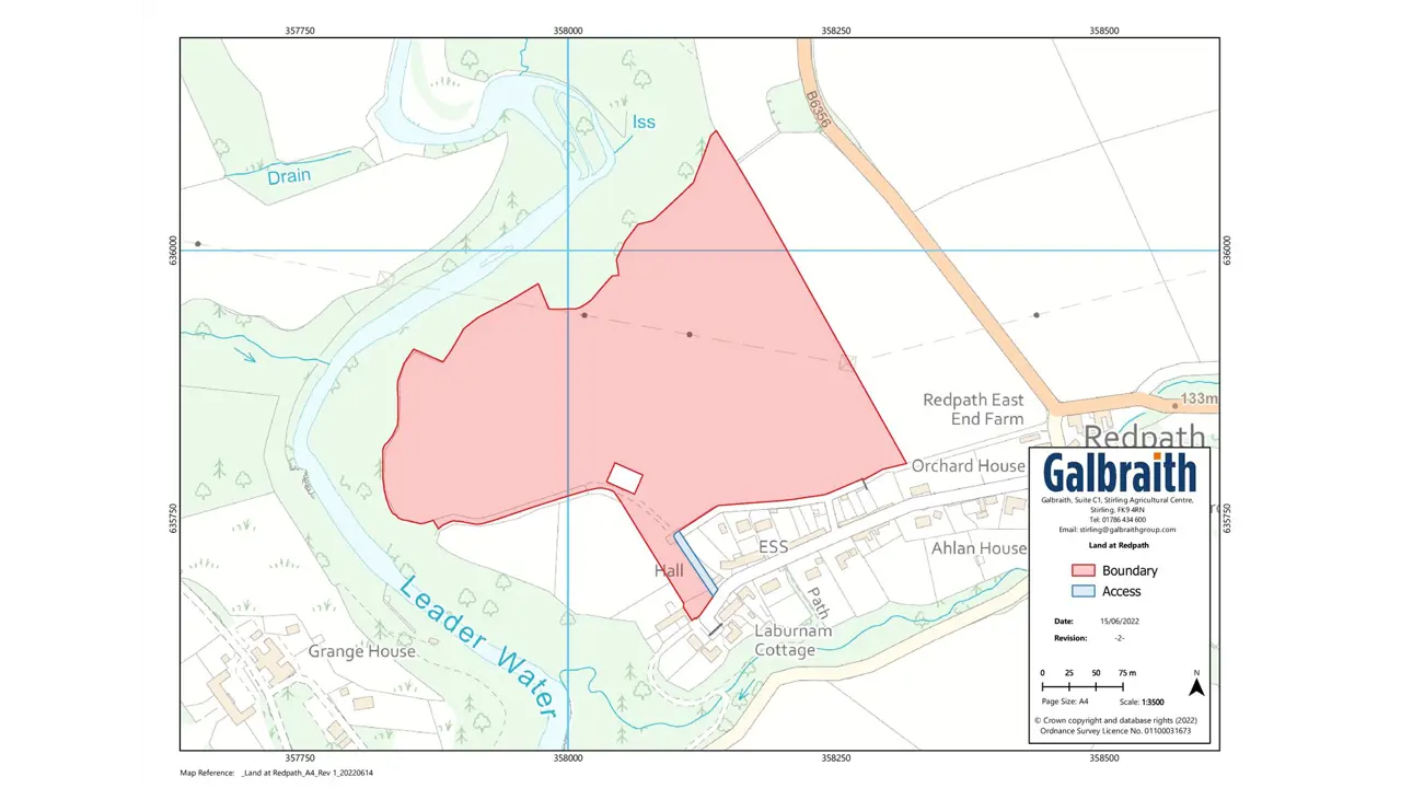 SITUATIONThe land is situated adjacent to the settlement of Redpath, a charming village set in the heart of the Borders between Melrose and Earlston. The field is easily accessible to the A68 providing good access to Edinburgh and the south. The nearby towns of Melrose and Earlston provide a wide variety of independent shops, restaurants, hotels and other professional services. The Borders Rail Link with Tweedbank is 5 miles distant.DESCRIPTIONThe Land at Redpath comprises a productive block of pasture land which extends to approximately 9.96 Ha (24.6 Acres) in total, and is situated in private position to the north of Redpath. The land is bound to north and west by an area of woodland which follows the Leader Water and lies immediately adjacent to the settlement boundary of Redpath. The land is gently sloping with a south westerly aspect towards the village of Redpath, lying between 99m above sea level at its lowest point adjacent to western boundary to 137m above sea level at its highest point on the north east of the subjects. The land has been classified as being grade 4.2 by the James Hutton Institute and has been down to pasture for a number of years and used for grazing and fodder production. There is a mains fed water trough located within the field to the south of the subjects.METHOD OF SALEThe land is offered for sale as a WholeWHAT-THREE-WORDSTo find this property location to within 3 metres, download and use What3Words and enter the following 3 words: w3w.co/rushed.sweep.waltzedSOLICITORSAnderson Strathern1 Rutland CourtEdinburghEH3 8EYT: 0131 270 7700E: Stuart.Orr@andersonstrathern.co.ukSPORTING RIGHTSInsofar as these rights form part of the property title they are included with the sale.TIMBERAll fallen and standing timber is included in the sale insofar as it is owned.MINERALSThe mineral rights are included in the sale insofar as they are owned by the Seller.DESIGNATIONSThe subjects fall within Eildon and Leaderfoot National Scenic Area. Further details are available from Nature Scot website sitelink.nature.scotThe Land at Redpath currently falls outwith the settlement boundary for Redpath village as defined within the Scottish Borders Local Development Plan (LDP) which was adopted on 12 May 2016, but given the strategic location of the land in terms of the wider settlement the land may present longer term development potential subject to obtaining necessary planning consents.A small area of the subjects of sale falls within the wider Redpath Conservation Area. Further details are available from the Scottish Border Local Planning Authority. www.scotborders.gov.ukTHIRD PARTY RIGHTS AND SERVITUDESA small area of the subjects which is adjacent to the access track is used and looked after by local residents of the village. Although there is no formal agreement in place in respect of the use of this area, the Seller’s preference is for this area to continue to be used by the local residents going forward. Further details are available from the Selling Agents.There are various rights in favour of a number of proprietors of the adjacent dwelling houses to south of farmland in relation to drainage.There is a deed of servitude in relation to a power line crossing the subjects.The owners of the houses in the former Morrison homes development also benefit from various rights over the subjects in relation to an outlying area of ground which forms a reed bed, which is bound but excluded from the subject of sale.The owners of Redpath West Farmhouse have a heritable and irredeemable servitude right of pedestrian and vehicular access over the small area of land currently used by the local residents to the south of the subjects.The subjects are sold together with, and subject to, all existing rights of way, servitudes, wayleaves and others whether contained in the Title Deeds or otherwise, and purchasers will be deemed to have satisfied themselves in all respects thereof.VIEWINGBy appointment with the Selling Agents.LOCAL AUTHORITYScottish Borders CouncilCouncil HeadquartersNewton St BoswellsMelroseTD6 0SAT: 01835 824 000