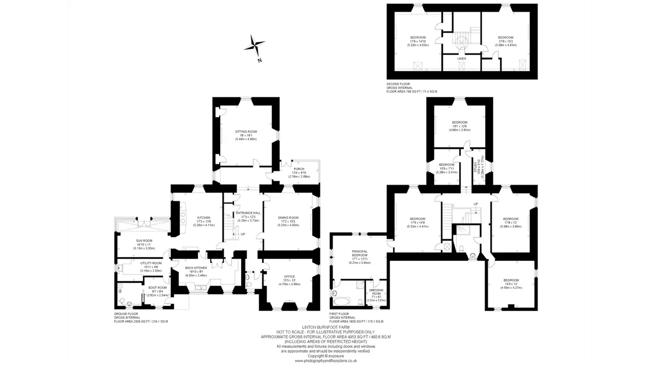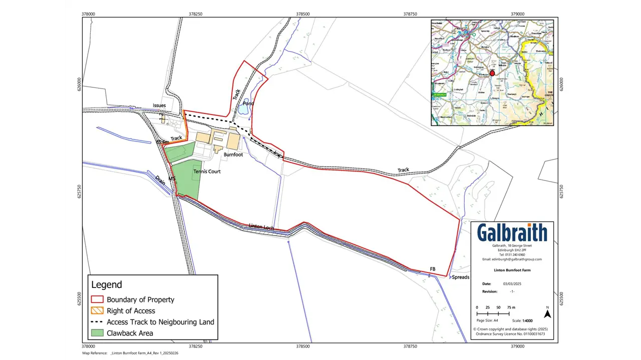 DESCRIPTIONLinton Burnfoot Farm is an excellent residential and amenity property offering scope for further development. The impressive period farmhouse with extensive grounds, featuring a private walled garden, tennis court, a previous outdoor arena and private pond. The land extends to approximately 12.95 Ha (31.99 acres). The property is equipped with an extensive range of traditional farm buildings which offer a range of additional uses and development opportunities, subject to obtaining the necessary planning consents. There is useful modern steel portal frame shed and to the northeast of the farm buildings, remains of adetached cottage, offering further potential fordevelopment.METHOD OF SALELinton Burnfoot Farm is offered for sale as a whole. Linton Burnfoot Farm comprises a traditional a stone-built farmhouse with a range of farm outbuildings, approximately 12.95 ha (31.99 acres) of land, a tennis court, a former outdoor arena, and private pond.The Farmhouse was built circa 1750s and boasts well-proportioned rooms with many original features and enjoys a south facing aspect with enviable views to the Cheviot Hills.The house is accessed from a private tree lined driveway and offers ample parking. Leading from the front door there is an entrance porch which opens to the main hallway from which the ground floor accommodation is accessible. There are three reception rooms with individual wood burning stoves and a library room located to the rear of the house with fitted bookshelves, perfect for the avid reader. The heart of the house is the spacious breakfasting kitchen with oil-fired AGA and a pleasing place for a kitchen table. The sunroom, overlooking the garden, is the perfect spot to sit and relax in the evening, with French doors leading to the garden patio area. The rear door leads to a boot room, WC, and drying room, perfect place for muddy boots.An impressive timber staircase leads to the first floor, providing access to four bedrooms with master en-suite bathroom and dressing room. A relaxing sitting room/nursery adjoins the master bedroom with study, box room and shower room completing the first floor. A further staircase leads to the second-floor landing offering, two generous size bedrooms. The accommodation is laid out in more detail in the floorplans contained within this brochure. SITUATIONWith the Cheviot Hills to the south, the centralScottish Borders offer some of the most beautiful and varied countryside in the south of Scotland. Linton Burnfoot sits at the foot of Linton Hill in a valley spanning the Kale water. Providing a peaceful, private setting, yet accessible.The Scottish Borders which is also referred to simply as the Borders, stretches from the Pentland, Moorfoot and Lammermuir Hills that mark the boundary with the Lothians in the north, to the Cheviot Hills which, along with the River Tweed, mark the border with England in the south. This is also wonderful riding country, with pony clubs and equestrian events. The Cheviot Hills to the south offer an expansive and idyllic landscape for those keen to explore the countryside on foot.The charming village of Morebattle is just 1.5 miles south of the farm and is at the heart of the local community with a traditional inn and a well-supported community run shop and post office. There is also a local primary school in the village served by a free school bus which passes the farm. Secondary state schooling is available at Kelso High School which boasts excellent modern facilities. There is also a good choice of private schools including St Mary’s and Mowden Hall (preparatory only) and there are many private schools near Edinburgh.Kelso, arguably the most attractive of the Borders towns is set in an area of great scenic beauty and is noted particularly for its fine Market Square and for the remains of one of the great Border Abbeys. The town sits at the confluence of the River Tweed and the River Teviot. Kelso provides a good shopping centre together with an excellent range of social and sporting facilities including golf, bowls, tennis, swimming, curling and fishing. Kelso racecourse is within 1 mile of the town centre and the local golf course The Roxburghe, the championship golf course at Sunlaws, lies 8.5 miles from Linton Burnfoot.