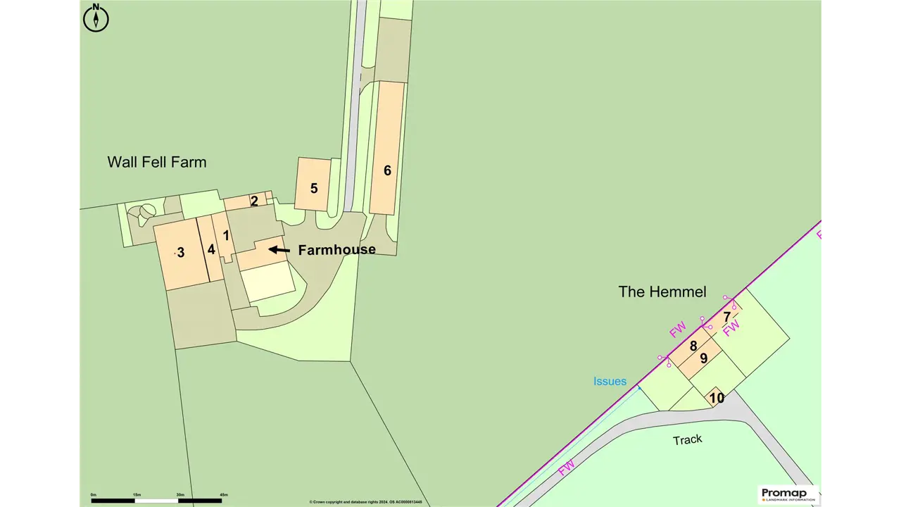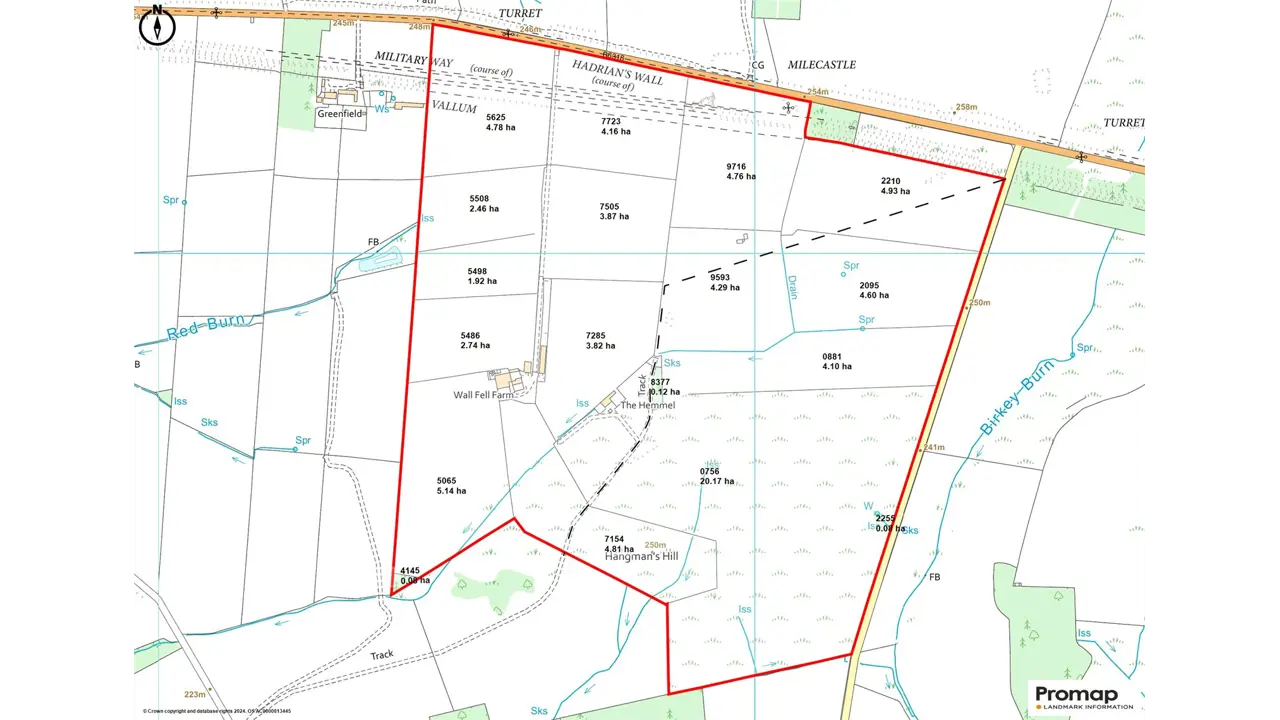 A well-shaped and scenic agricultural investment property located on Northumberland’s historic Hadrian’s Wall and extending to 214.76 acres (86.91 ha) or thereabouts. Well-proportioned and tastefully restored three-bedroom farmhouse of considerable character and with outstanding views. A mix of traditional and modern farm buildings on 3 separate sites, with potential for alternative uses 21.59 acres of arable land 64.15 acres of meadow land 53.15 acres permanent pasture 71.65 acres upland grazing 2.22 acres mixed woodland For sale by private treaty as a wholeGENERAL DESCRIPTIONWall Fell Farm is a most attractive and multi-dimensional let agricultural holding extending to around 214.76 acres (86.91 ha) lying close to Hadrian’s Wall in one of Northumberland’s most stunning locations. The area is known for its privacy, seclusion, dramatic landscapes and Dark Skies.The majority of the holding comprises Wall Fell itself, a compact and well-shaped livestock unit extending to around 191.63 acres (77.55 ha). Wall Fell occupies a striking, private location within The Hadrian’s Wall World Heritage Site, with sweeping views to the south, east and west, yet is well placed for local market towns and easily accessible from larger centres. The popular towns of Hexham and Corbridge lie within 5 miles, offering a wide range of educational, cultural and retail facilities, as well as local rail links. Newcastle upon Tyne, the regional centre with its wealth of commercial facilities, universities, international airport and East Coast main line rail connections, is less than 24 miles.The farm is well-shaped and easily accessible, with the final approach being via a section of private road off the B6318 Heddon-Chollerford road.The land lies between 230m and 250m above sea level and enjoys good access from north and south via the nearby B6318 road.The centrepiece is the main farmstead, incorporating the farmhouse itself and a mix of modern and more traditional farm buildings.There are various small areas of woodland, and substantial wildlife and ecological interest. Owing to the presence of the Hadrian’s Wall national walking Path and the proximity of Hadrian’s Wall itself, we believe there to be considerable potential for some form of tourism or leisure-related development on the farm, subject to the relevant consents.Land at Cross Bank, an outlying area of arable land and woodland, is located approximately 4 miles to the south west, a short distance to the north of the village of Acomb. This portion of land, lower lying between the 60m and 90m contours, extends to around 23.12 acres (9.36 ha), including 1.53 acres of attractive, mixed broadleaved woodland, and 21.59 acres of arable land.The Land at Cross Bank, with its ability to produce good yields of combinable crops and straw, complements the livestock operations at Wall Fell itself.TENUREThe Property is let under a first succession, 1986 Agricultural Holdings Act (AHA86)-governed tenancy in favour of Mr Richard Keen.The freehold interest in The Property, subject to this tenancy, is offered for sale as a whole.THE FARMHOUSEThe farmhouse occupies an attractive, south-facing position towards the south of Wall Fell Farm and enjoys outstanding views, especially to south and west. The mainly two-storey dwelling is believed to be principally of 19th Century construction and is constructed largely of sandstone under slate.The accommodation includes:On the ground floor:Front entrance hall with stairs off;Living room with woodburning stove (installed by Farm Tenant),Kitchen with fitted floor and wall range and electric stove and hob (all installed by Farm Tenant)Playroom (formerly office)Family bathroomRear entrance hall (W) incorporating Klover PB35 biomass boiler (installed by Farm Tenant)Utility RoomFurther hall (N)WCOn the first floor:Landing.Three bedrooms.The house has been substantially improved and modernized in recent years. Windows are UPVC double-glazed and the majority of the roof was felted and re-slated around 1989.EPC Band EFARM BUILDINGSThe farm buildings are located on three separate sites. The main farmstead is arranged immediately to the north, east and west of the farmhouse.The buildings here comprise:1. Stone under slate range, incorporating workshop, meal-house and former byre and storage areas.2. Stone under asbestos cement byre serving as storage.3. 5 bay, steel portal framed cattle building and lean-to (23.00m x 16.00m overall) having concrete floor and asbestos cement roof (walls, cladding and flooring recorded as Tenant’s Fixture).4. Lean-to cattle accommodation (23m x 5m) with fibre-cement monopitch roof (recorded as Tenant’s Fixture).5. 4 bay, steel portal framed implement shed/workshop building (18.50 m x 12.20 m) with concrete floor, steel sheet side cladding and asbestos cement roof (recorded as Tenant’s Improvement).6. Timber-framed sheep shed (46.50m x 9.15 m) with steel sheet monopitch roof and side cladding (recorded as Tenant’s Fixture). Approximately 120 metres to the east, there is a secondary building range known collectively as The Hemmel, which is recorded as redundant under the Tenancy Agreement. Specifically, this comprises:7. A 3 bay, steel framed hay barn (13.80 m x 4.90m) with corrugated steel side cladding and roof and open to south-east.8. 5-eyed, former cartshed built in stone and brick under a fibre-cement roof.9. Lean-to former livestock housing on brick piers under a fibre-cement roof.10. Stone building under a pitched, fibre-cement roof. In a striking position around 450 m to the north-east of the farmhouse, there is a largely derelict pair of buildings, also recorded as redundant under the tenancy agreement. Specifically, these comprise:11. Flanders House, a former two storey detached farmhouse, built of stone under a (now collapsed) stone slab roof.12. Adjacent, formerly lofted barn, built of stone under a (now collapsed) stone slab roof.We consider that some of the buildings may offer p