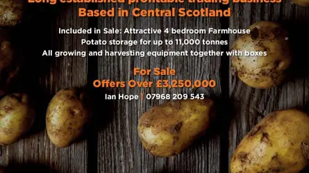 Seed potato business with attractive 4 bedroom farmhouse, potato storage for up to 11,000 tonnes, all growing and harvesting equipment together with boxes. Long established profitable trading business based in Central ScotlandContact Ian Hope on 07968 209 543