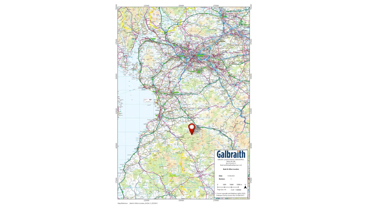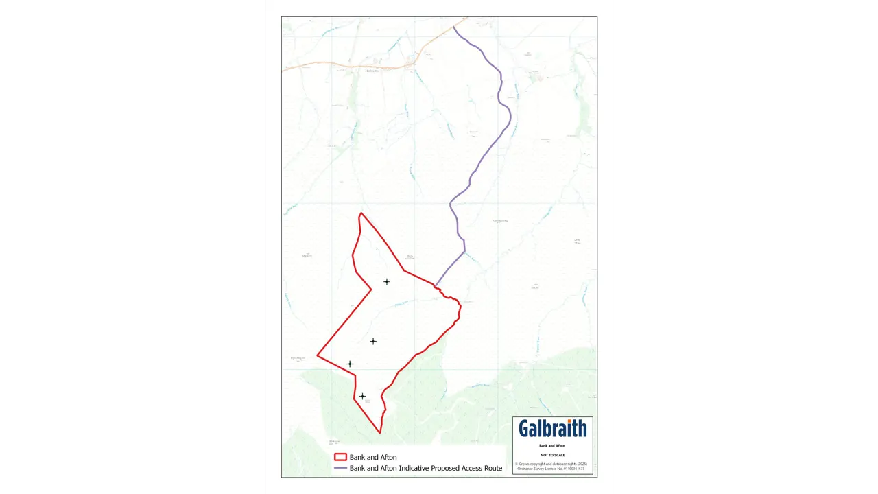 CLOSING DATE SET – 12:00 NOON – WEDNESDAY 23RD JULY 2025SUMMARY OF SUBJECTS FOR SALEThe land at Bank and Afton is located approximately 4 miles south west of New Cumnock and 7 miles east of Dalmellington in the county of Ayrshire. The city of Glasgow lies about 45 miles to the north east.The land comprises an area of upland grazing and is predominantly made up of open ground rising to about 477m above sea level around Benty Cowan Hill. It extends to approximately 174.46 hectares (431.10 acres) and is bounded to the south by a mature woodland plantation.The land is classified as Grade 6.2 and 6.3 by the James Hutton Institute land Capability for Agriculture. The land at Bank and Afton is being offered for sale with the benefit of detailed planning permission for the erection of four 4.8MW wind turbines (19.2MW) forming part of the Enoch Hill Wind Farm, a development of 16 wind turbines in total.The development has been promoted by RWE Renewables UK Onshore Wind Limited, a major renewable energy developer who are the operator of the wind farm and have a lease in place on the following terms:- Term: 32 Years from 1st March 2023 to 28th February 2055.- Rent Commencement Date: 1st Septemeber 2024.- Minimum Rent: £6,000 (index linked to the RPI from June 2018)/MW installed payable quarterly in advance = £160,297.83/annum (index linked to January 2025).- Variable Income Rent: From the Rent Commencement Date a Variable Income Rent is payable per annum as set out in the brochure less any Minimum Rent already paid for the rent year.- The Rent Commencement Date is the 1st Septemeber 2024, the earlier of when electricity is first exported commercially from the Wind Farm or 18 months from the 1st March 2023.- There are restrictions on woodland planting and erecting other structures over the wind protection zone. - The Lease makes provision for habitat managment within the property.- The Tenant is liable for decomissioning the wind farm and there is a Bond in place to cover decomissioning liabilities. It should be noted that construction work on the windfarm commenced in June 2023, with approximately 3km of road infrastructure leading from the access point on the B741 being created on land adjacent to the subjects. The erection of the wind turbines is now under way, with the expectation that the construction of the wind farm will be completed in 2025.METHOD OF SALELand at Bank & Afton is offered for sale as a whole.VIEWINGViewing is strictly by prior arrangement only. Names of parties and vehicle registration details will be required.