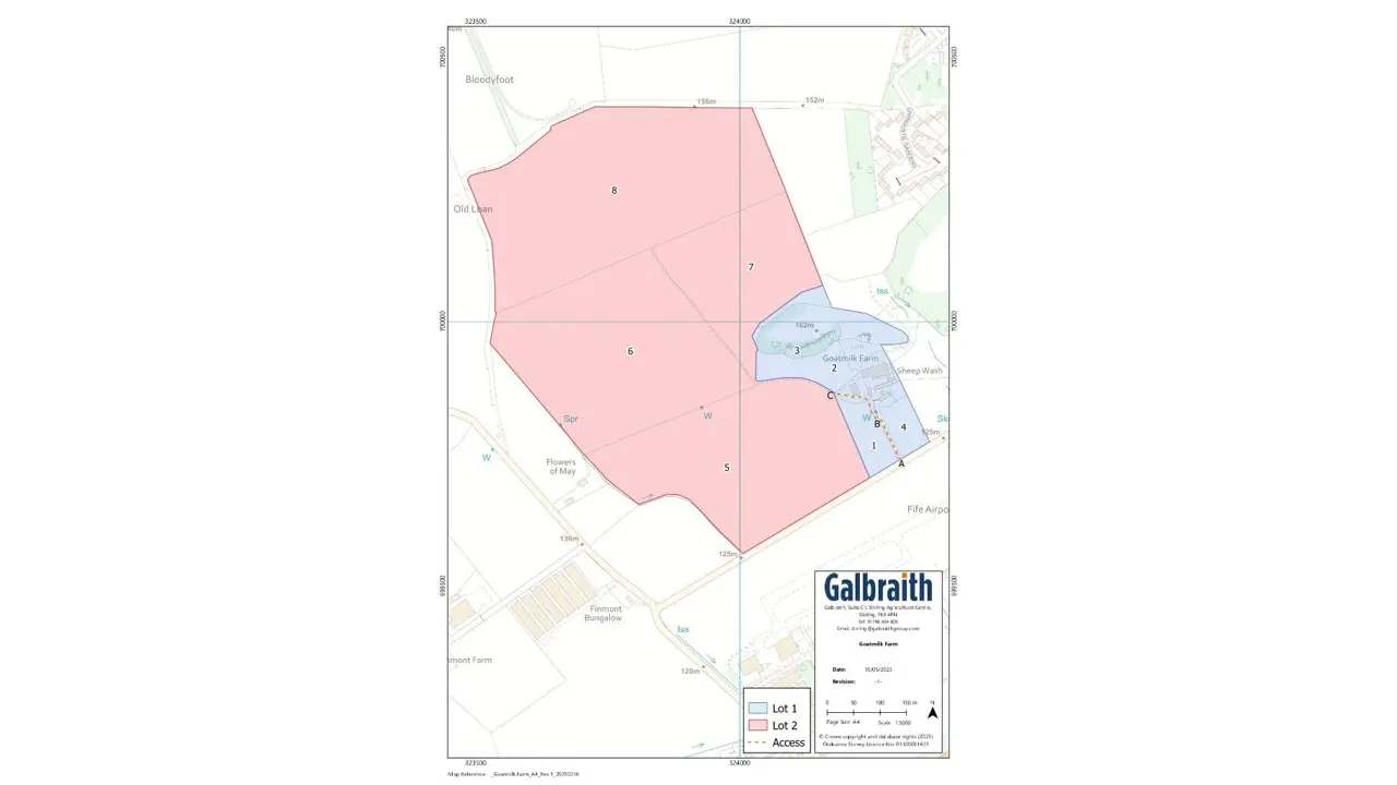 GENERALGoatmilk is located in a desirable and accessible location within rural Fife close to the town of Glenrothes. The farm is situated in an elevated position and benefits from views over the surrounding countryside and towards the Firth of Forth.The farm is located about one mile to the west of Glenrothes which offers an excellent range of local amenities with a good selection of shops, supermarkets, pubs, restaurants and leisure facilities with a wider offering available in the nearby Kirkcaldy (6 miles). The popular county market town of Cupar (15 miles) is a short distance to the north-east with the cities of Edinburgh (30 miles), Dundee (26 miles) and Perth (20 miles) all within comfortable driving distance from Goatmilk.Goatmilk is surrounded by some glorious rolling Fife countryside which is home to an array of wildlife and, for the outdoor enthusiast, the perfect setting for a range of recreational pursuits. There is great scope for walking, cycling, and there are many opportunities for riding with the local Pony Clubs for the younger enthusiast and various other Riding clubs. There is racing and polo at Scone outside Perth which is also the venue for the annual Scottish Game Fair. There is a number of excellent golf courses locally with the ancient and historic university town of St Andrews, renowned world-wide as the Home of Golf being some 25 miles to the north-east.The pretty fishing villages of Fife’s quaint East Neuk such as Crail, St. Monans, Anstruther and Pittenweem are just a short drive to the south east. In terms of days out the wide-open spaces of the Lomond Hills are close at hand along with several popular National Trust for Scotland properties including Hill of Tarvit outside Cupar, Kellie Castle and Falkland Palace. Fife’s beautiful and varied coastline includes several sandy beaches such as St Andrews, Kingsbarns, Elie and Tentsmuir.State schooling is available within Glenrothes with private schooling being provided at St Leonards in St Andrews, the High School of Dundee and several highly rated schools in the Perth and Edinburgh areas.There are several local railway stations at Glenrothes, Cardenden, Markinch, Kirkcaldy and Ladybank, which form part of the Fife Circle Line which lead north from Edinburgh. Edinburgh International Airport (26.5 miles) is about a thirty-five minute drive to the south of the holding, with Dundee Airport (28 miles) offering a good selection of short-haul flights. Fife Airport is located directly opposite the farm and is used by light aircraft and helicopters mainly for training, survey and recreational trips.Fife is well served by a wide variety of agricultural contractors, merchants, and suppliers, and there is a successful local machinery ring which can provide additional farming resources as required. Regular livestock sales are held at Stirling Agricultural Centre (35 miles). Traditionally this area of Fife is known for its fertile land, capable of producing high yields of an extensive range of crops and the area is well suited to intensive cropping and livestock units.DESCRIPTIONGoatmilk presents an excellent compact mixed amenity and farming unit extending to approximately 46.15 Ha (114.04 Acres) located in an easily accessible area of Fife. The farm benefits from a substantial two storey traditional stone and brick farmhouse which is located towards the eastern boundary of the holding. Adjacent to the farmhouse there is an adaptable range of modern and traditional farm buildings which are readily accessible via a private farm road and currently provide stabling for up to 9 horses. The farmland is all situated within a ring fence and extends to the north and west of the holding, and is predominately down to arable and well suited to growing a range of cereal crops as part of a regular grassland rotation, with the addition of potatoes. The fields adjacent to the steading are down to pasture and used in conjunction with the equestrian enterprise on the farm, with an area to the north of the farm steading, which forms a small rocky outcrop, being a haven for wildlife, boasting a range of broadleaved trees and other vegetation.METHOD OF SALEThe sale of Goatmilk Farm offers Purchasers an opportunity to acquire the farm either as a whole or in 2 lots.Lot 1: Farmhouse, steading and land extending to approximately 5.73 Ha (14.16 Acres) in total.Lot 2: Farmland extending to about 40.42 Ha (99.88 Acres) in total, and benefitting from a right of access over track marked A-B-C as shown on the sale plan.Please Note Lot 2 will not be sold prior to the sale of Lot 1.LOT 1: FARMHOUSE, STEADING AND LAND EXTENDING TO APPROXIMATELY 5.73 HA (14.16 ACRES) IN TOTALGoatmilk FarmhouseThe farmhouse is situated just to the east of the holding and benefits from a south facing outlook and views towards the Firth of Forth. The farmhouse is of stone and brick construction with external harling under a tiled roof. The farmhouse is approached via the farm road which leads from the public road and provides spacious and well proportioned family accommodation which is set over two levels including 2 public rooms on the ground floor with 4 bedrooms on the upper floor. Garden GroundThe farmhouse benefits from an attractive area of garden ground which is enclosed to the front by a stone wall, and is mostly laid to lawn. There is an area of parking for a number of cars adjacent and to the side of the house.Farm BuildingsThe farm buildings are located adjacent to the farmhouse, and take the form of the original traditional steading range part of which has been incorporated into a number of more modern buildings. Briefly the buildings comprise:Lean-to Stores (7.90m x 3.10m and 6.18m x 3.10m)Located to the rear of the house, and adjacent to the stable block. Of timber frame construction under box profile roofs with concrete floors.Traditional Stable Block (36.75m x 5.56m) part of the original traditional steading, which has been completely refurbished and re-ro