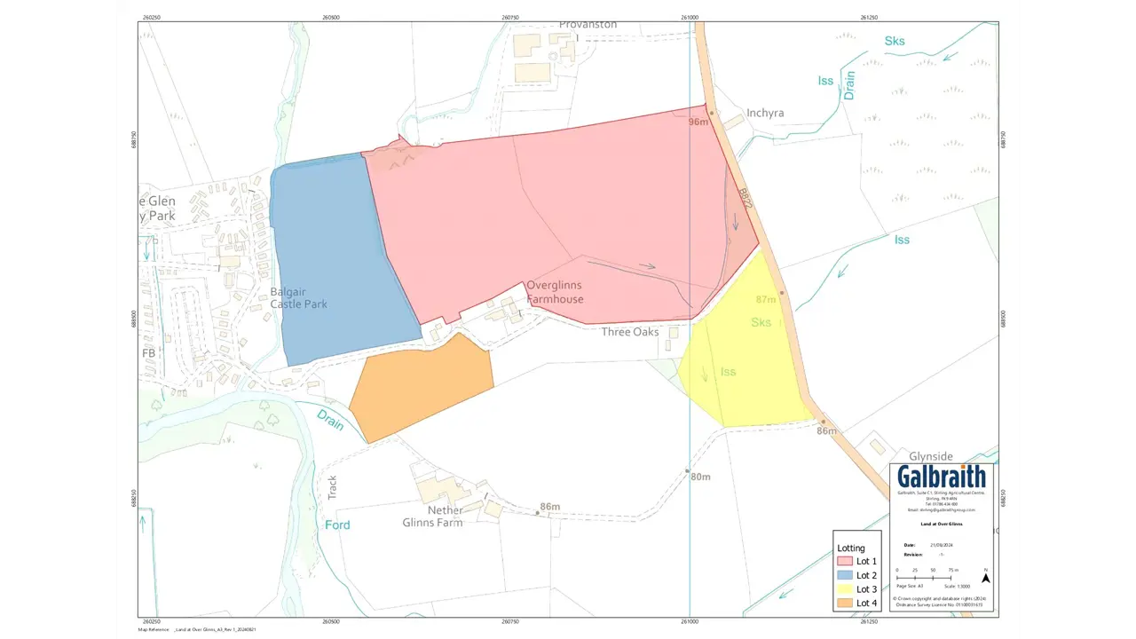 SITUATIONLand at Overglinns is located 1.6 miles North of Fintry on the B822, 5.2 miles East of the village of Balfron and 14.5 miles West of the city of Stirling. The land is situated in an accessible area of rural Stirlingshire.METHOD OF SALELand at Overglinns is offered for sale as a whole or in 4 Lots.Lot 1: 12.55 Ha (31.01 acres)Land at Lot 1 Overglinns extends to 12.55 Ha (31.01 Acres) of grazing and cropping land. The land is made up of predominantly Grade 4.1 land as classified by the James Hutton Institute with an area of Grade 4.2 to the east of the lot. The land within Lot 1 rises from 86m to 96m above sea level and is rolling in nature. The land is generally made up of mineral gleys with a small area of alluvial soils. The land can be accessed directly from the B822, where there is a hard standing used for bale storage and also from the private road leading to Campsie Glen Holiday Park.