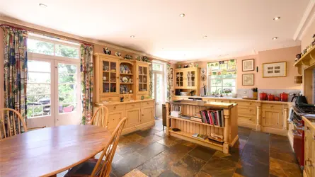 - Attractive courtyard with modern glass house, garden room, further ancillary garden stores and an office