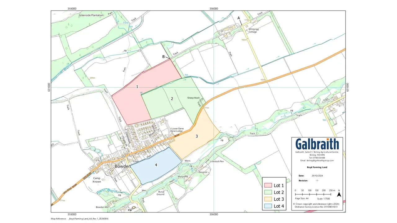 SITUATIONLand at Bowden is situated in a rural yet accessible location to the south of the popular small settlement of Bowden, approximately 1.5 miles west of Newtown St Boswells and approximately 4 miles south of Melrose. The land is located within a short distance of both the A7 and A68 roads which lead to the Scottish and English border, as well as Edinburgh (40 miles).The nearby village of Newtown St Boswells offers day to day amenities and is also home to St Boswells livestock mart. Melrose, Tweedbank, and Galashiels offer a wider range of retail and business facilities including supermarkets, industrial estates, hospital, and primary and secondary schooling. The nearest train station is Tweedbank, located approximately 4.5 miles from the land which provides excellent transport links to Edinburgh and the South.The area is also renowned for its spectacular countryside and its many rural pursuits including hill walking, mountain biking, horse riding and the sporting opportunities afforded by local Estates and the River Tweed and its tributaries.Traditionally this area of the Borders is known for its mixed farming units combining fertile land capable of producing excellent yields of a range of crops and extensive areas of pasture and grazing land well suited to the rearing of livestock.METHOD OF SALELand at Bowden is offered for sale as a whole or in 2 lots.DESCRIPTIONLand at Bowden comprises a productive block of grazing ground extending to approximately 10.24 Ha (25.30 Acres) in total. The land has been classified as Grade 3.2 by the James Hutton Institute and has been divided into two separate fields which are all well fenced and have water troughs. The land lies south of the village of Bowden and may present longer term development opportunities subject to obtaining necessary consents and holds a strategic position in terms of the future expansion of the village.Lot 1: Land extending to approximately 5.32 Ha (13.15 Acres)The land at Lot 1 is located south east of the village of Bowden and comprises a single enclosure extending to approximately 5.32 Ha (13.15 Acres) in total. The land rises from approximately 145m above sea level at its lowest point adjacent to the south east boundary to approximately 170m above sea level at the most northern point. Lot 1 is accessed via a field gate which leads from the B6398 public roadLot 2: Land extending to approximately 4.92 Ha (12.16 Acres)The land at Lot 2 is located south of the village of Bowden and comprises one enclosure of pasture ground extending to approximately 4.92 Ha (12.16 Acres). The land rises from approximately 152m above sea level at its lowest point towards the eastern corner to approximately 179m above sea level at its highest point near the north west corner of the enclosure. Lot 2 is accessed via a field gate onto the minor public road which leads south from the village of Bowden.CLAWBACKThe missives of sale will be subject to the Purchaser(s) granting a Clawback Agreement in favour of the Sellers to clawback 30% of the uplift in value, in the event of planning permission being granted for development for any purpose other than agricultural, over any part of the subjects, being obtained subsequent from the date of entry for a period of 30 years, which said obligations shall be secured via a Standard Security.MINERALSThe mineral rights are included in the sale in so far as they are owned by the Seller.TIMBERAll fallen and standing timber is included in the sale in so far as it is owned by the Seller.SPORTING RIGHTSIn so far as these rights form part of the property title they are included within the sale.FIXTURES AND FITTINGSNo other items are included unless mentioned in the sales particulars.DEPOSITA deposit of 10% of the purchase price shall be paid within seven days of completion of Missives. Deposit will be non-refundable in the event of the Purchaser failing to complete for reasons not attributable to the Seller or their Agents.POSSESSION AND ENTRYThe land at Bowden is currently let on as seasonal basis until November 2025. Further details are available from the selling agents. Vacant possession and entry will be given on completion or such mutual time to be agreed by the Seller and the Purchaser(s).THIRD PARTY RIGHTS AND SERVITUDESThe Sellers benefit from a prescriptive right of access over that part of the private access track which splits Lots 1 and 2 lying between the field gates.Lot 1 is subject to new servitude rights in favour of a landowner to the north of the village to install a new water pipe along the northern perimeter of the field. In the event a new water pipe is installed, the purchaser of Lot 1, will also benefit from rights to make a connection to new water pipe. Further details are available from the selling agents.HISTORIC & ENVIROMENTAL DESIGNATIONSThe land has been designated as a National Scenic Area. More information can be found on the Nature Scotland Website https://sitelink.nature.scot/site/9124Lot 2 has been designated as a Conservation Area. More information can be found on the Scottish Borders Council Website https://www.scotborders.gov.uk/directory-record/25979/bowden.IACSAll the farmland is registered for IACS purposes.NITRATE VULNERABLE ZONE (NVZ)The Land at Bowden is included within a Nitrate Vulnerable Zone.BASIC PAYMENT SCHEME ENTITLEMENTS (BPSE)Any payments relating to the 2025 scheme year will be retained by the Seller. If applicable, the Purchaser(s) will be responsible upon occupation of the subjects of sale to comply fully with the Statutory Management requirements to maintain the farmland in Good Agricultural and Environmental Condition (GAEC) as laid down under the Cross Compliance rules of the Basic Payment Scheme (BPS) for the remainder of the scheme year.The Seller may enter discussions with the Purchaser to transfer the right to receive Basic Payment Scheme (BPS) Entitlements in addition to the heritable property and by separate negotiation. Further details are available 